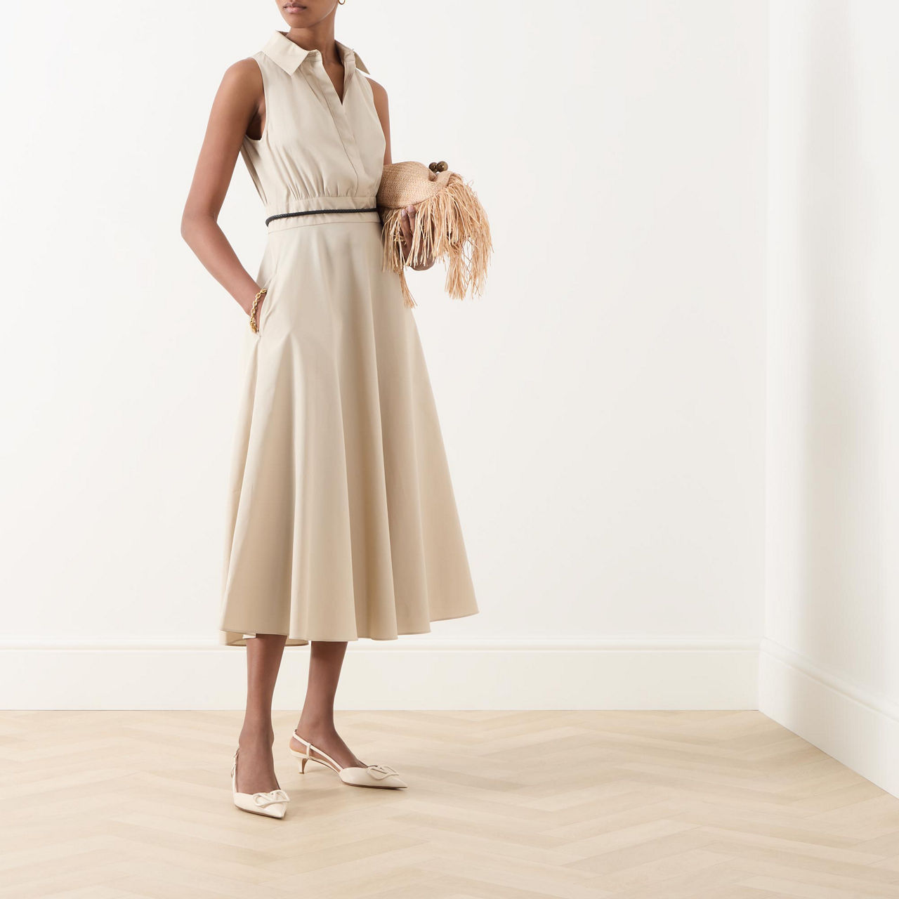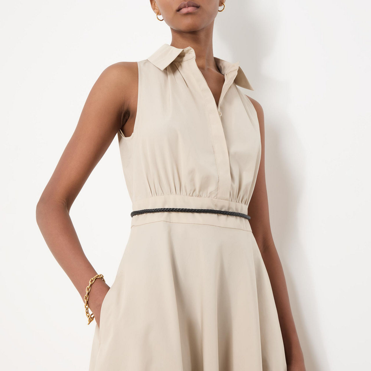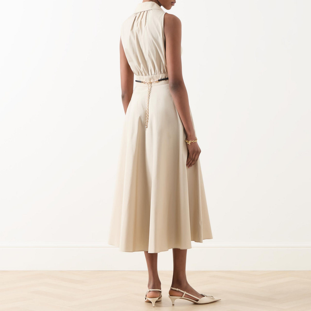 - Halter-style, Polo collar, sleeveless design, concealed front button fastening to the waistline, two in-seam pockets, belted, full skirt, flared hem, midi length, lightweight