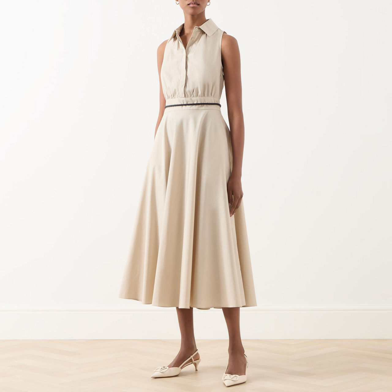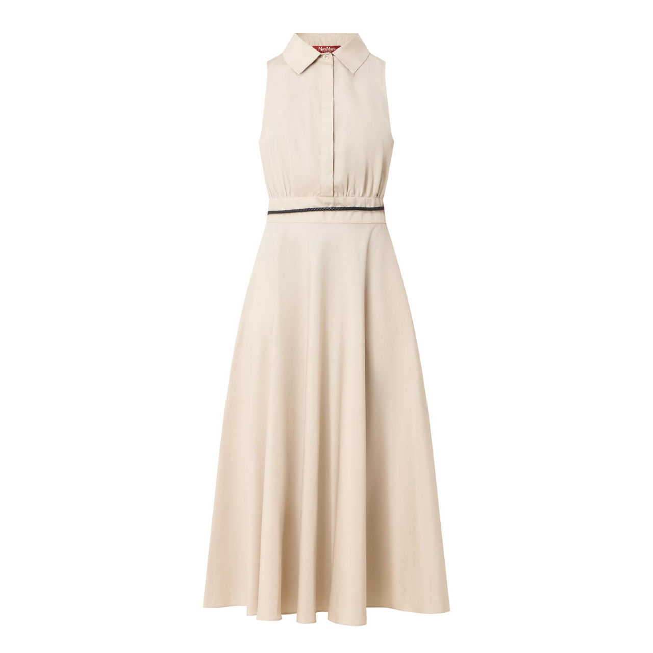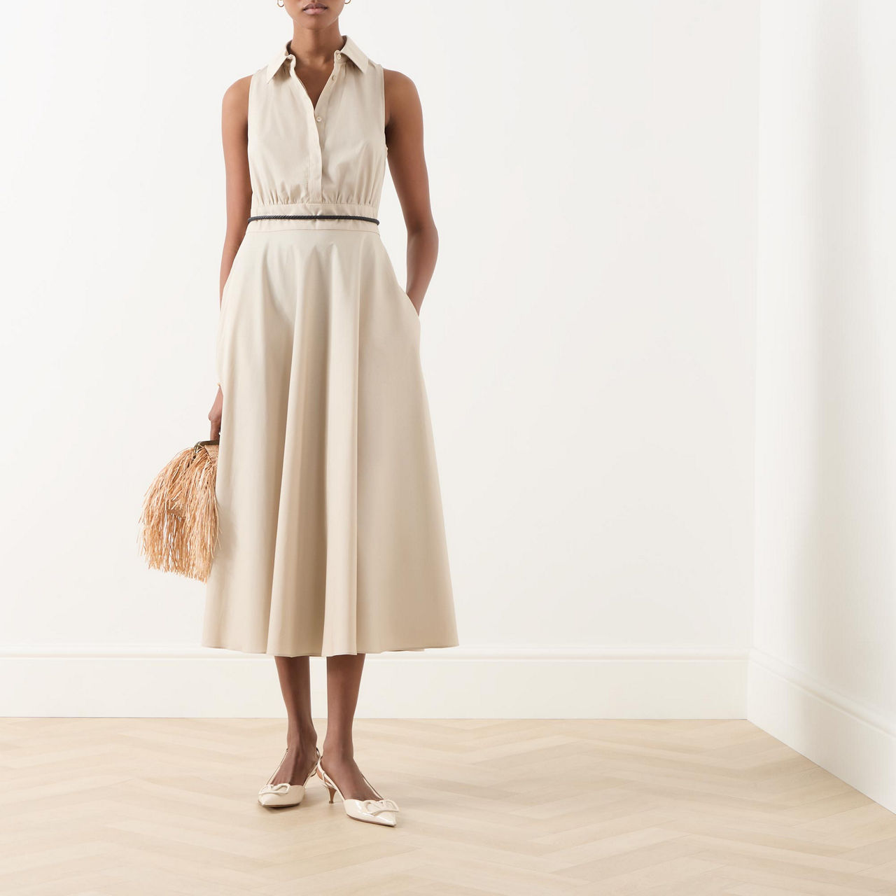 - Halter-style, Polo collar, sleeveless design, concealed front button fastening to the waistline, two in-seam pockets, belted, full skirt, flared hem, midi length, lightweight