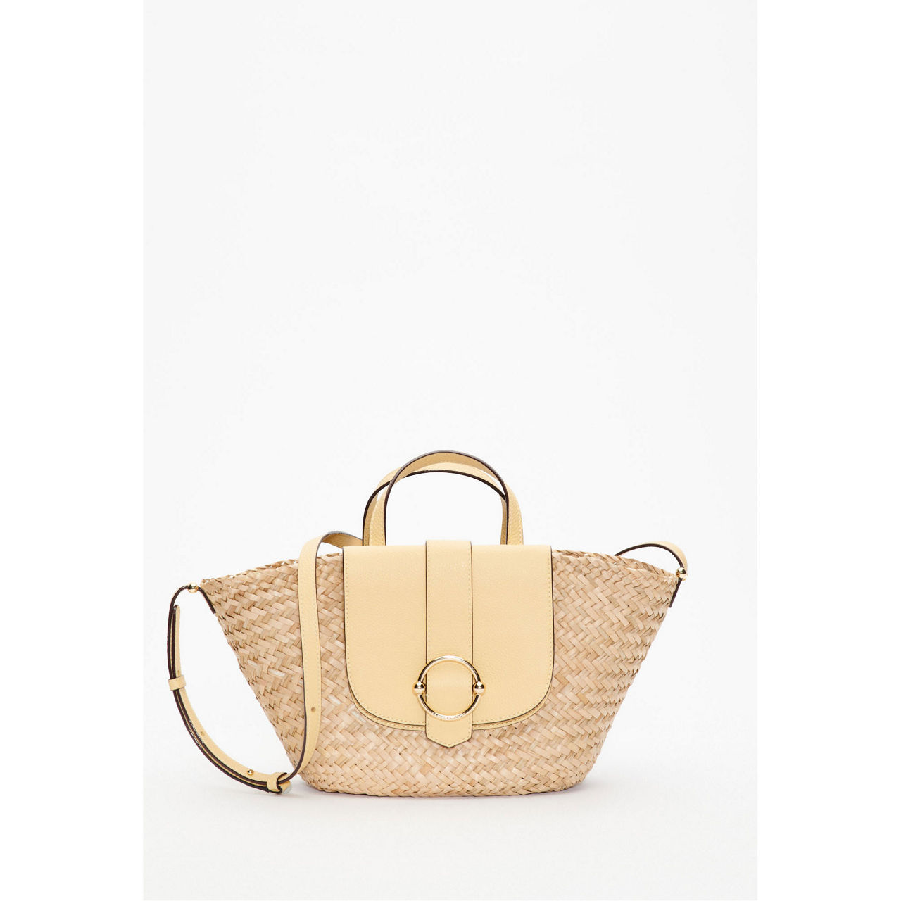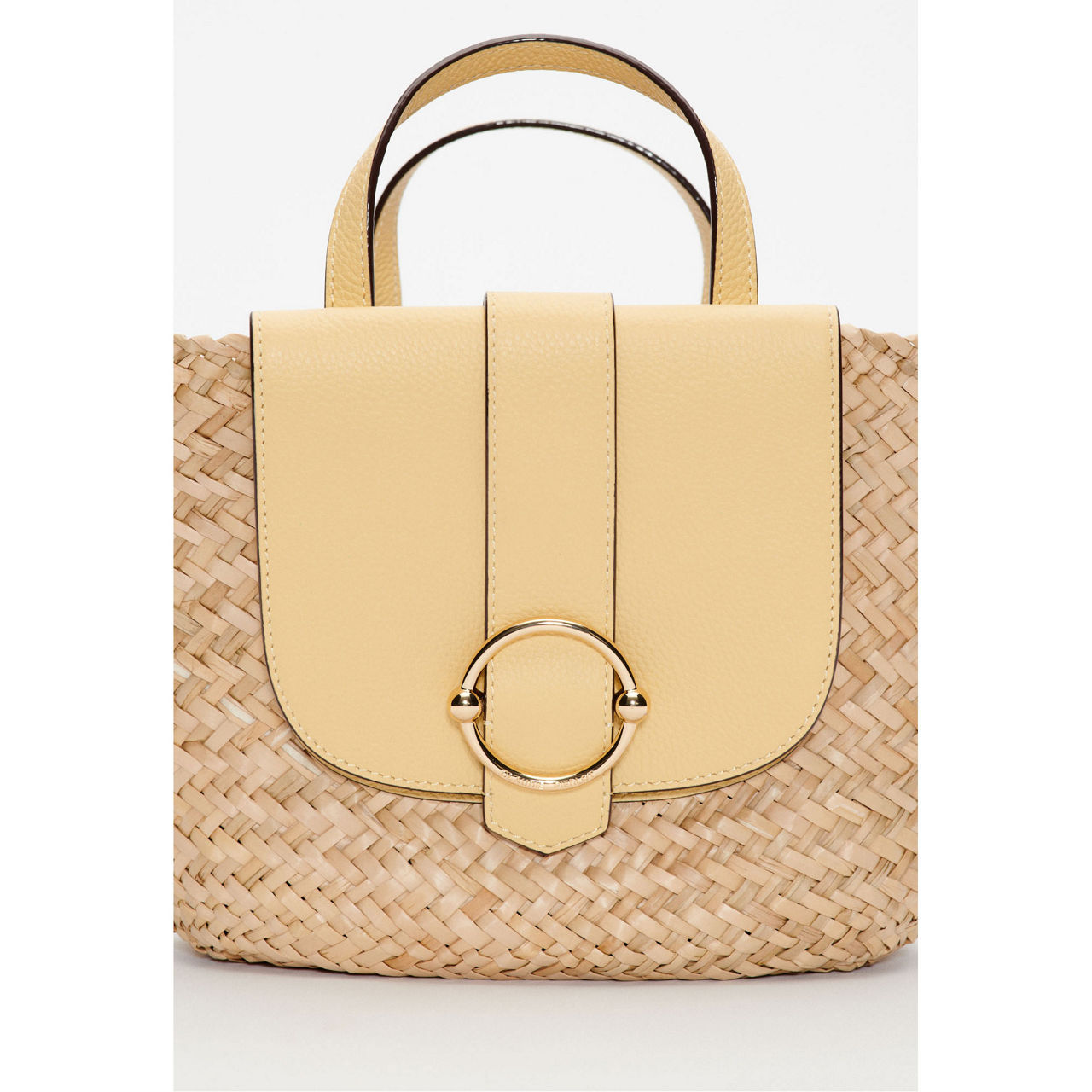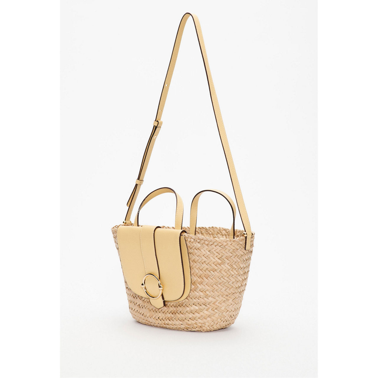 - Woven wicker design, leather panel, top handles, cross body strap, copper signature buckle, cotton lining.