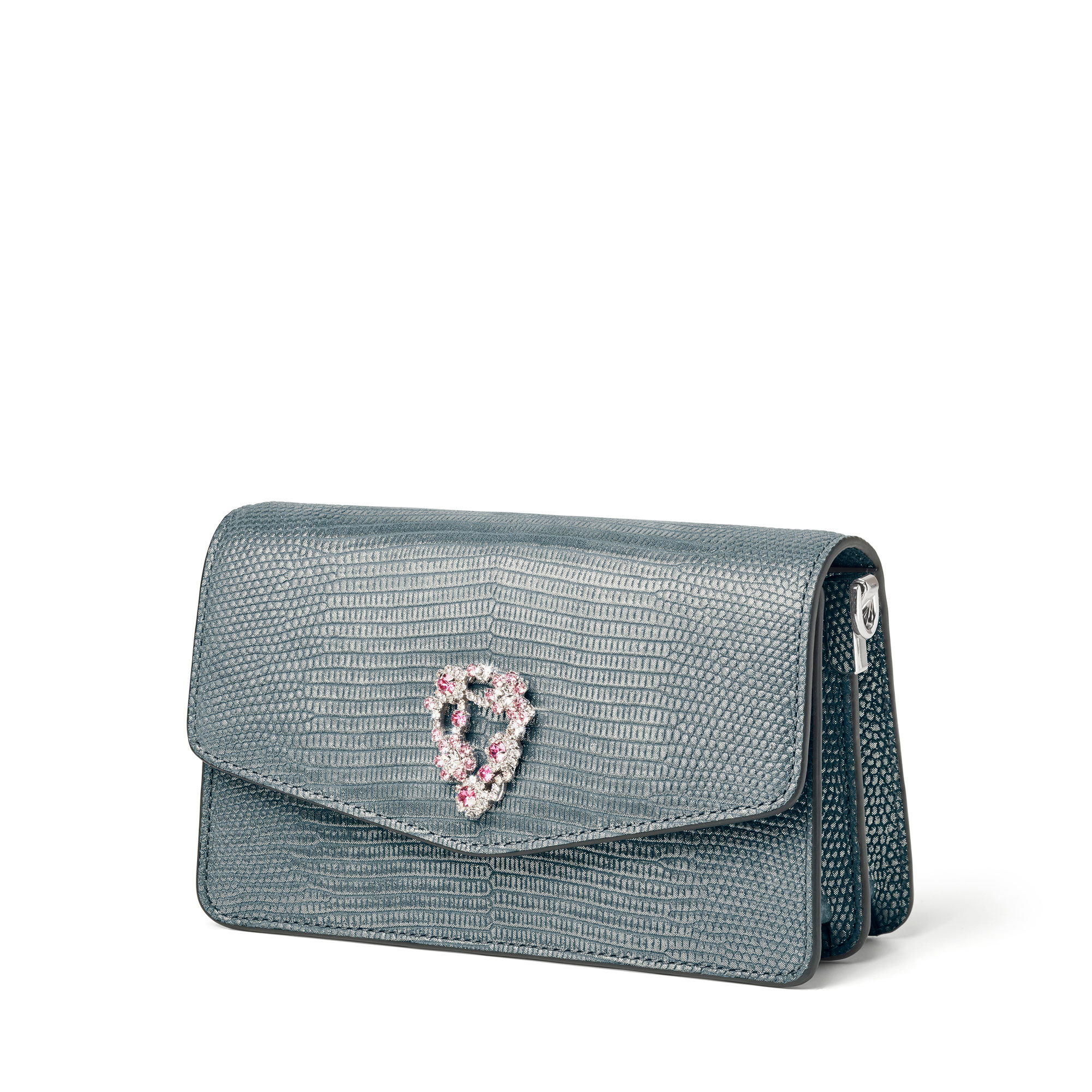 - Handcrafted, shimmering metallic lizard print, crystal centrepiece, 69 Preciosa stone embellishment, detachable leather strap, longer plaited chain strap