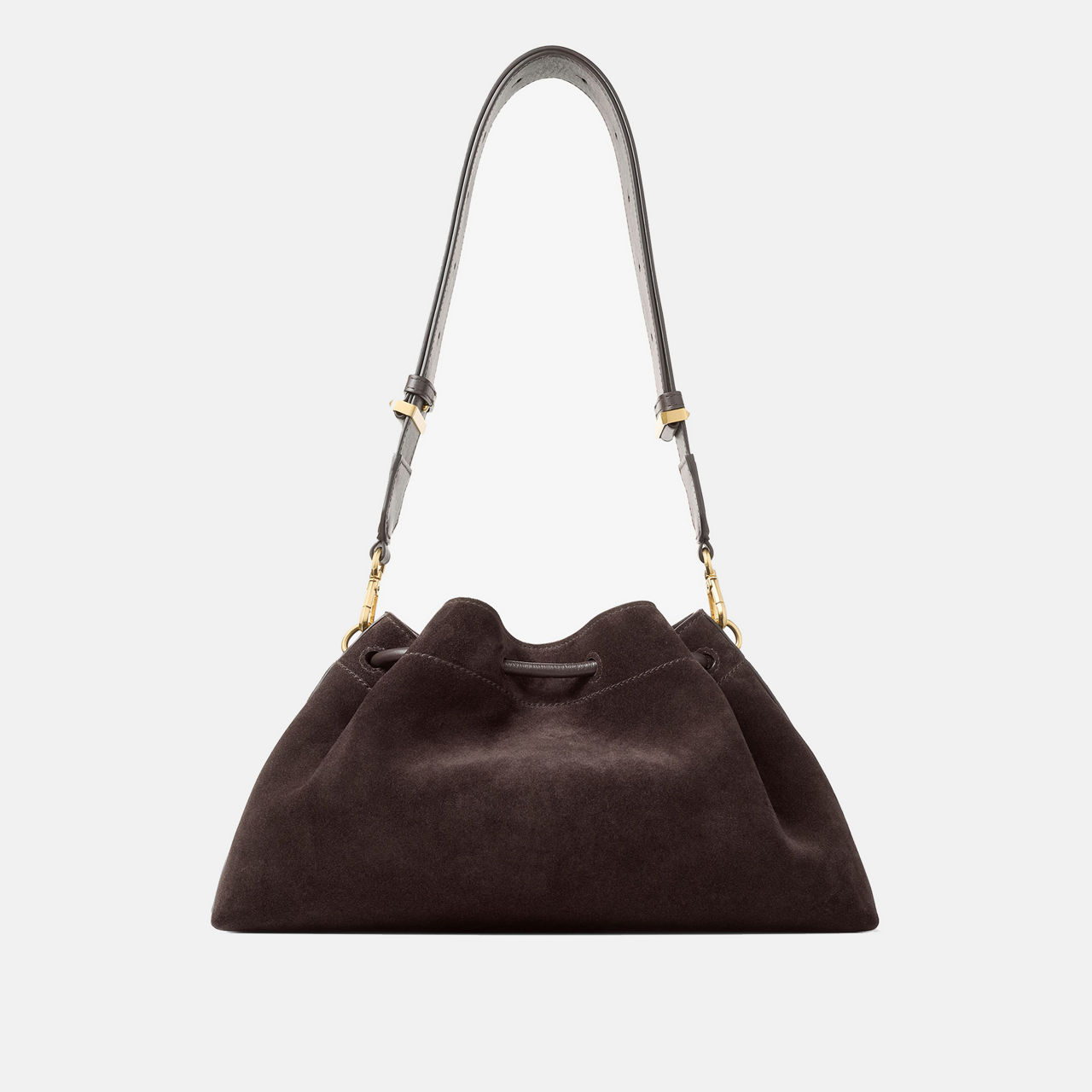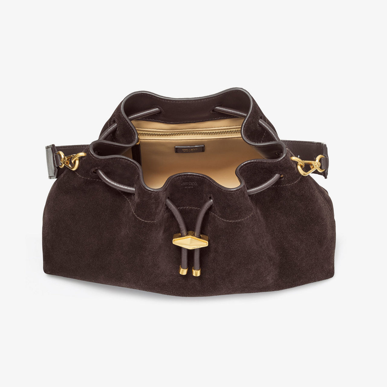 • Suede finish, Diamond drawstring closure, detachable top handle and shoulder strap, gold-tone hardware, brand logo details