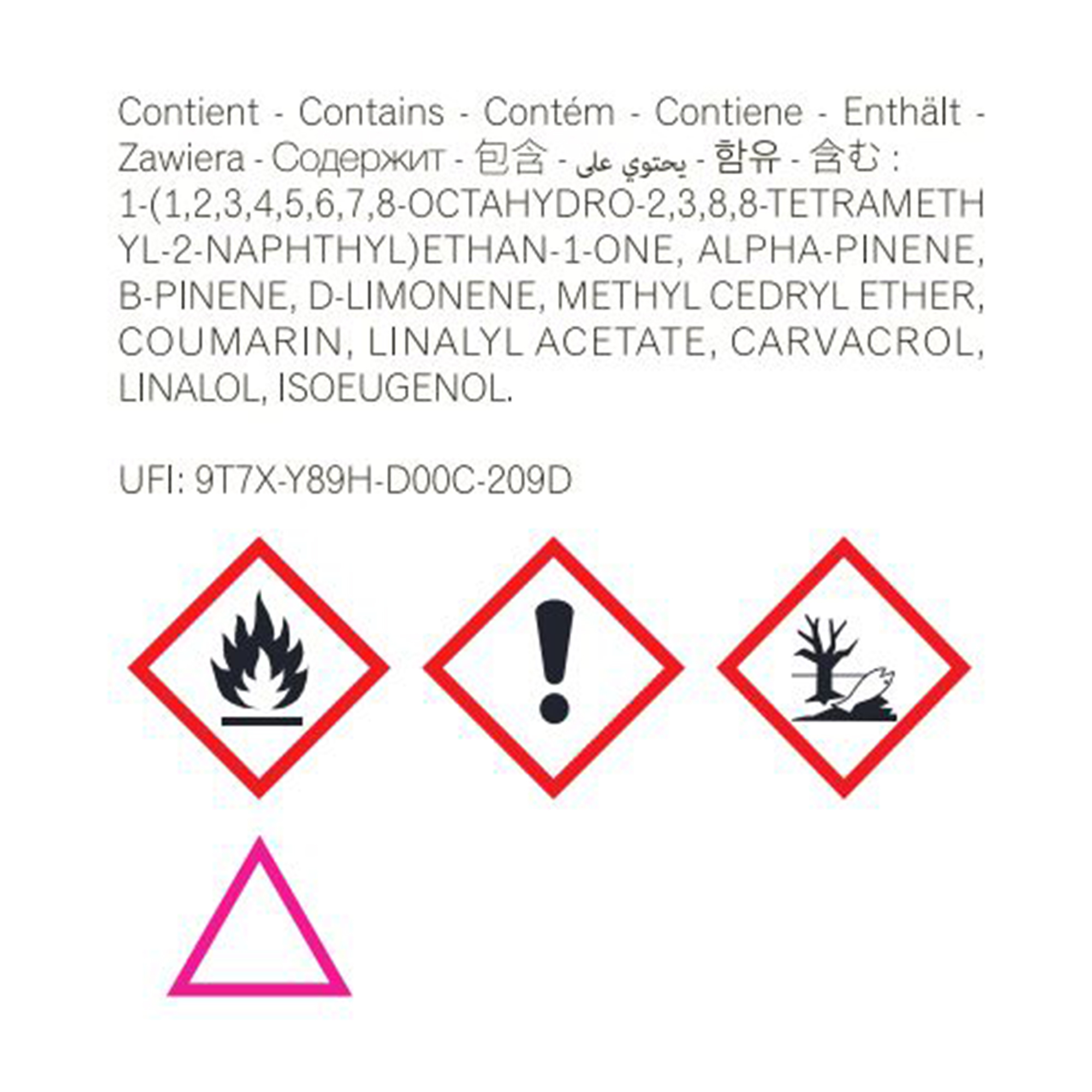 - Contains: (R)-P-Mentha-1,8-Diène, Acétate De Linalyle, Carvacrol, Coumarine, Isoeugénol, Linalol, Pin-2(10)-Ène, Acétate De 1-(3-Methoxypropoxy) Propyle (Cas: 88917-22-0), 1-(1,2,3,4,5,6,7,8-Octahydro-2,3,8,8-Tétraméthyl-2-Naphtyl)Éthane-1-One (Cas: 54464-57-2), Pin-2(3)-Ène (Cas: 80-56-8).