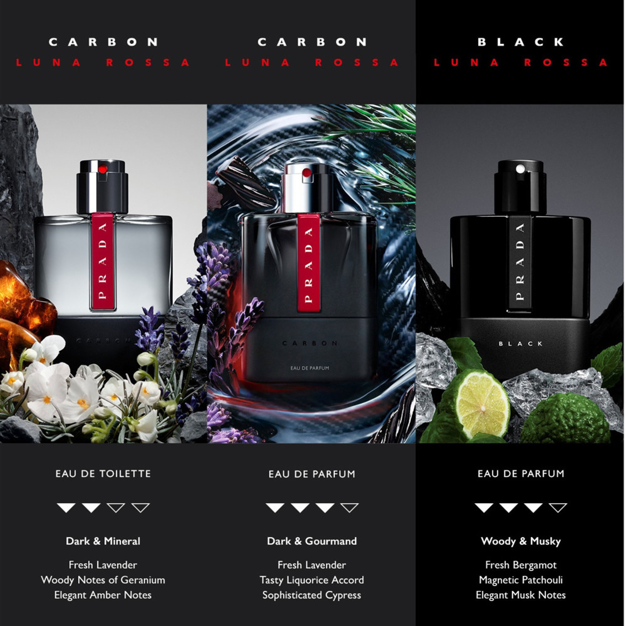 Description: Masculine fragrance with fresh lavender, addictive liquorice accord, and sophisticated cypress. Luna Rossa Carbon Eau de Parfum fuses natural strength with technical innovation, embodying uncompromising intensity inspired by carbon's emblematic power.