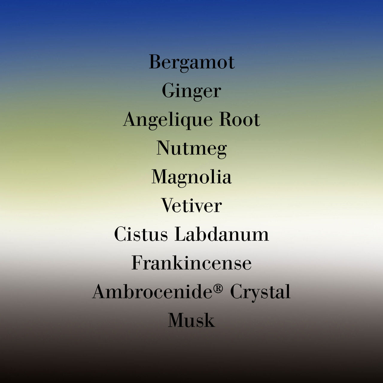 Clear, spicy top notes of ginger, bergamot, mandarin, angelica root and nutmeg lead you to the sensual fire within: a leathery accord, vetiver, frankincense, generous amounts of amber, and a musk that vibrates with the skin. This is a scent that plays with the tired codes of masculinity while extracting their telluric force to create something beautiful and irresistible.