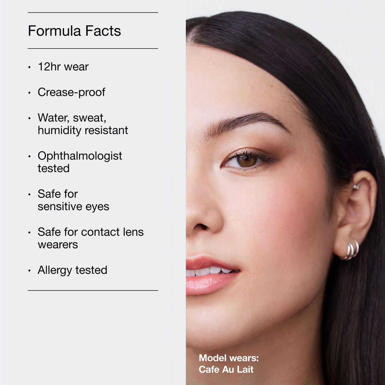 - Formula Facts: 12-hour wear, Crease-proof, Non-fading, Non-settling, Non-caking, Allergy tested, Fragrance free
