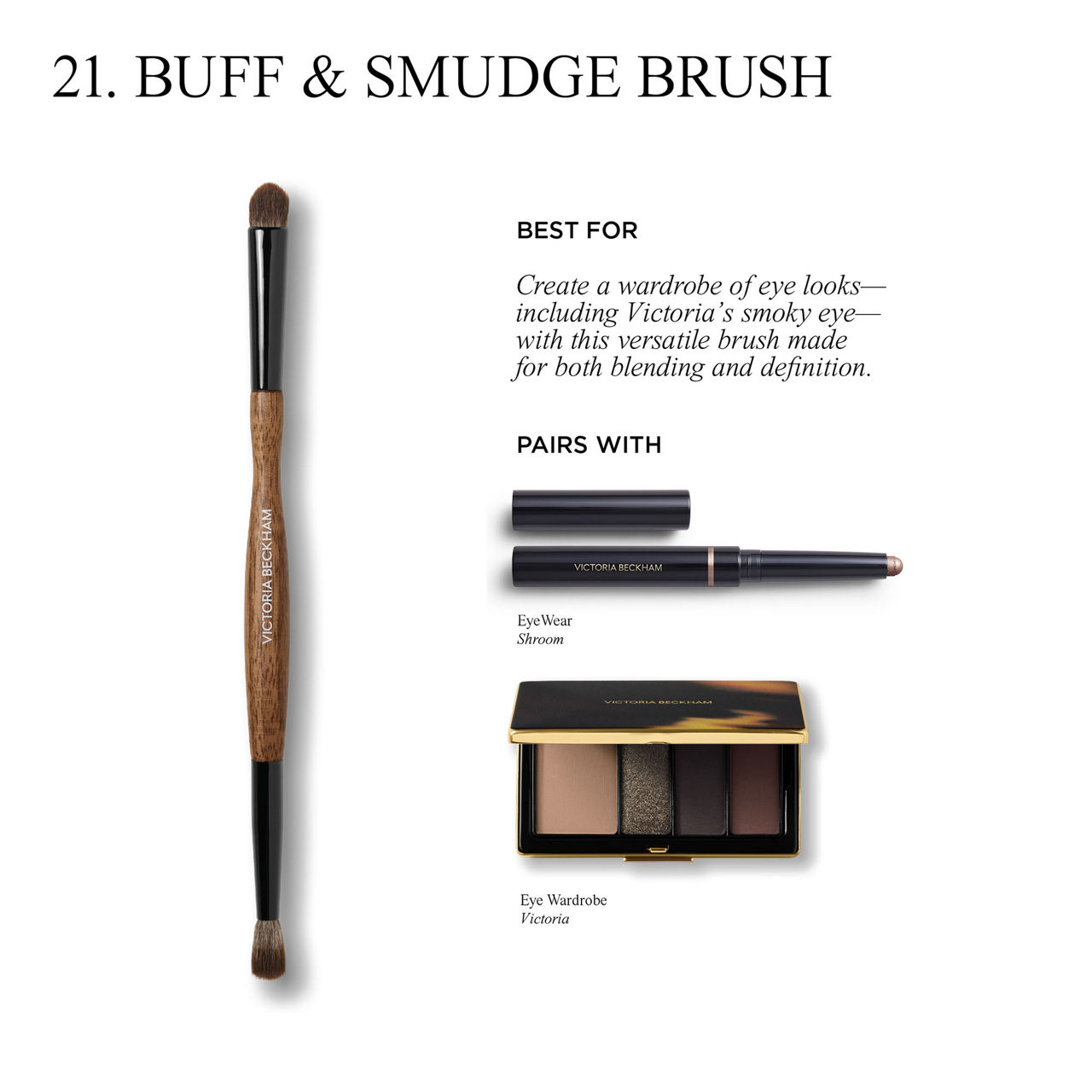 Description: The Buff and Smudge dual-ended brush is a game-changer for Victoria’s signature smoky eye - and versatile enough for a wardrobe of eye looks. An intuitive high-performance brush collection crafted for complete control and natural, flawless application.