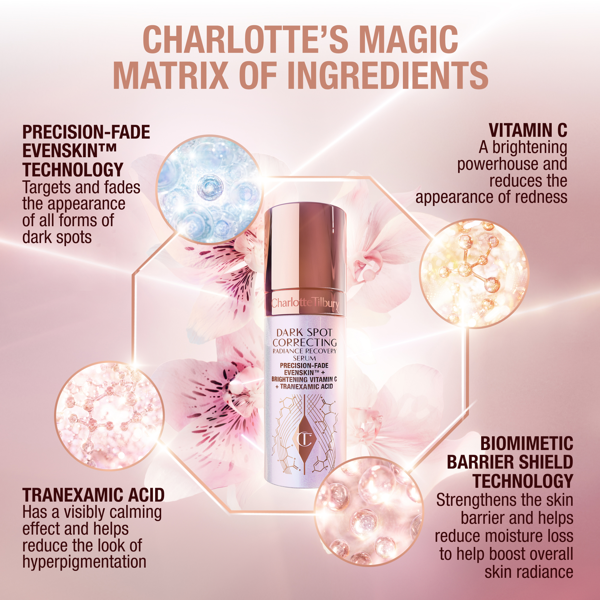 - Dark Spot Correcting Radiance Recovery Serum Ingredients: Aqua/Water/Eau, Squalane, C13-15 Alkane, Glycerin, Xylitol, Pentylene Glycol, Polyquaternium-37, Hydrogenated Phosphatidylcholine, Phytosphingosine, Phytosterols, Niacinamide, 3-O-Ethyl Ascorbic Acid, Xanthophylls, Panthenol, Hyaluronic Acid, Tocopherol, Betula Alba Bark Extract, Tranexamic Acid, Phytosteryl Isostearate, Beta-Sitosterol, Sodium Beta-Sitosteryl Sulfate, Tamarindus Indica Seed Gum, Phenylpropanol, Caprylyl Glycol, Silica, Cetyl-Pg Hydroxyethyl Palmitamide, Lysolecithin, Sorbitan Caprylate, Lecithin, Pentaerythrityl Tetra-Di-T-Butyl Hydroxyhydrocinnamate, Propanediol, Octyldodecanol, Parfum (Fragrance), Hydroxyacetophenone, Pelargonium Graveolens Flower Oil, Citrus Limon (Lemon) Peel Oil, Limonene, Citrus Aurantium Dulcis (Orange) Peel Oil, Citrus Sinensis (Orange) Peel Oil, Citrus Aurantium Bergamia (Bergamot) Peel Oil, Cananga Odorata Flower Extract, Pogostemon Cablin Oil, Geraniol, Citronellol, Linalool, Citral.Charlotte'S Magic Water Cream Ingredients: Aqua/Water/Eau, Glycerin, Butyrospermum Parkii (Shea) Butter, Caprylic/Capric Triglyceride, Squalane, Propanediol, Pentylene Glycol, 1,2-Hexanediol, Glyceryl Glucoside, Niacinamide, Mannitol, Aloe Barbadensis Leaf Juice, Carbomer, Camellia Oleifera (Camellia) Seed Oil, Rosa Canina Fruit Oil, Caprylyl Glycol, Acrylates/C10-30 Alkyl Acrylate Crosspolymer, Helianthus Annuus (Sunflower) Seed Oil, Sodium Gluconate, Sodium Hydroxide, Tocopherol, Beta-Glucan, Sodium Hyaluronate, Backhousia Citriodora Leaf Extract, Vaccinium Macrocarpon (Cranberry) Fruit Extract, Plumeria Rubra Flower Extract, Ascorbyl Palmitate, Acetyl Tetrapeptide-11, Citric Acid, Acetyl Tetrapeptide-9, Potassium Sorbate, Sodium Benzoate.
