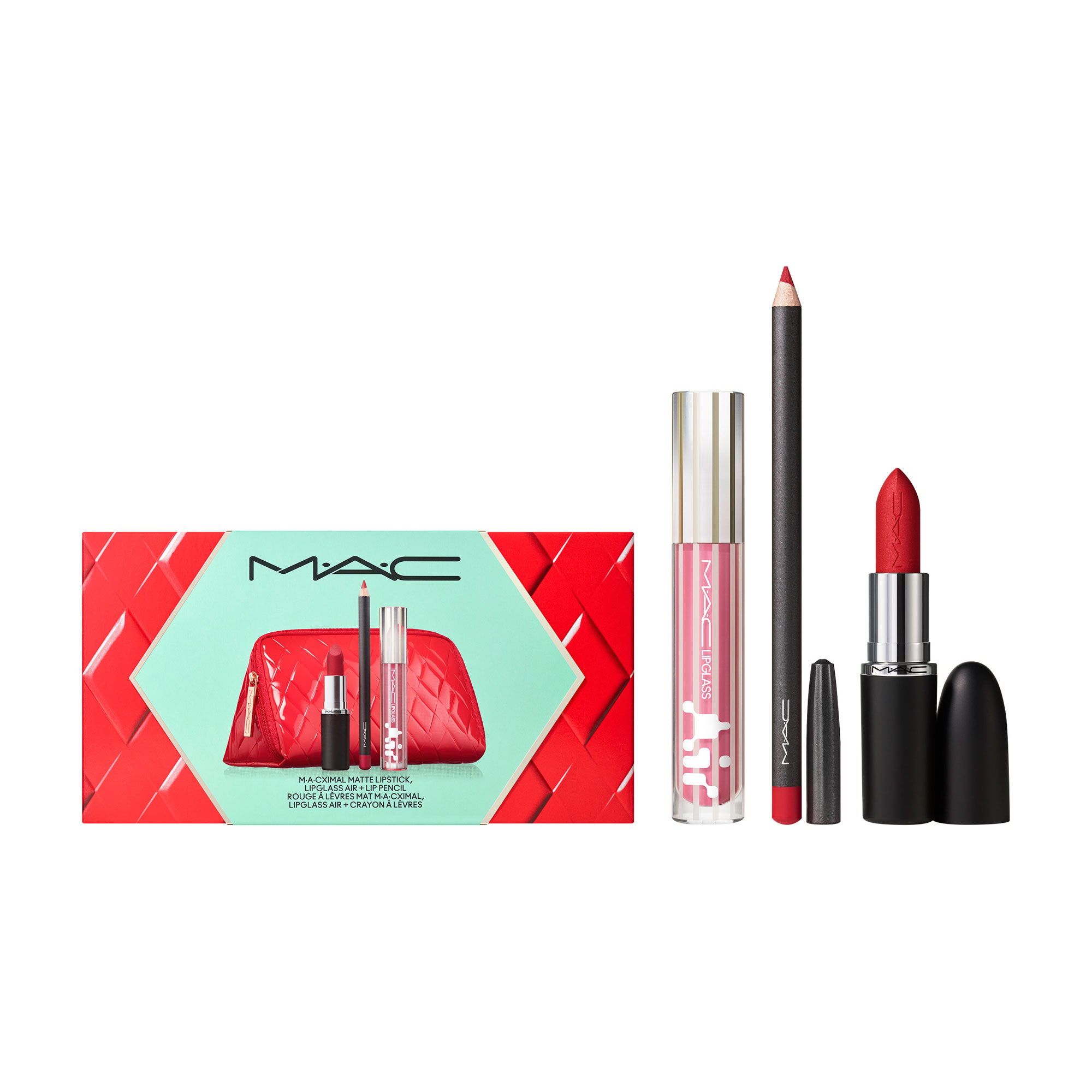 Description: A timeless lip trio featuring best-selling hues of M·A·Cximal Silky Matte Lipstick and Lip Pencil, paired with all-new shades of Lipglass Air Non-Sticky Gloss in Red and Neutral colour waves. Ready to gift in holiday-exclusive packaging at a M·A·Cnificient value.