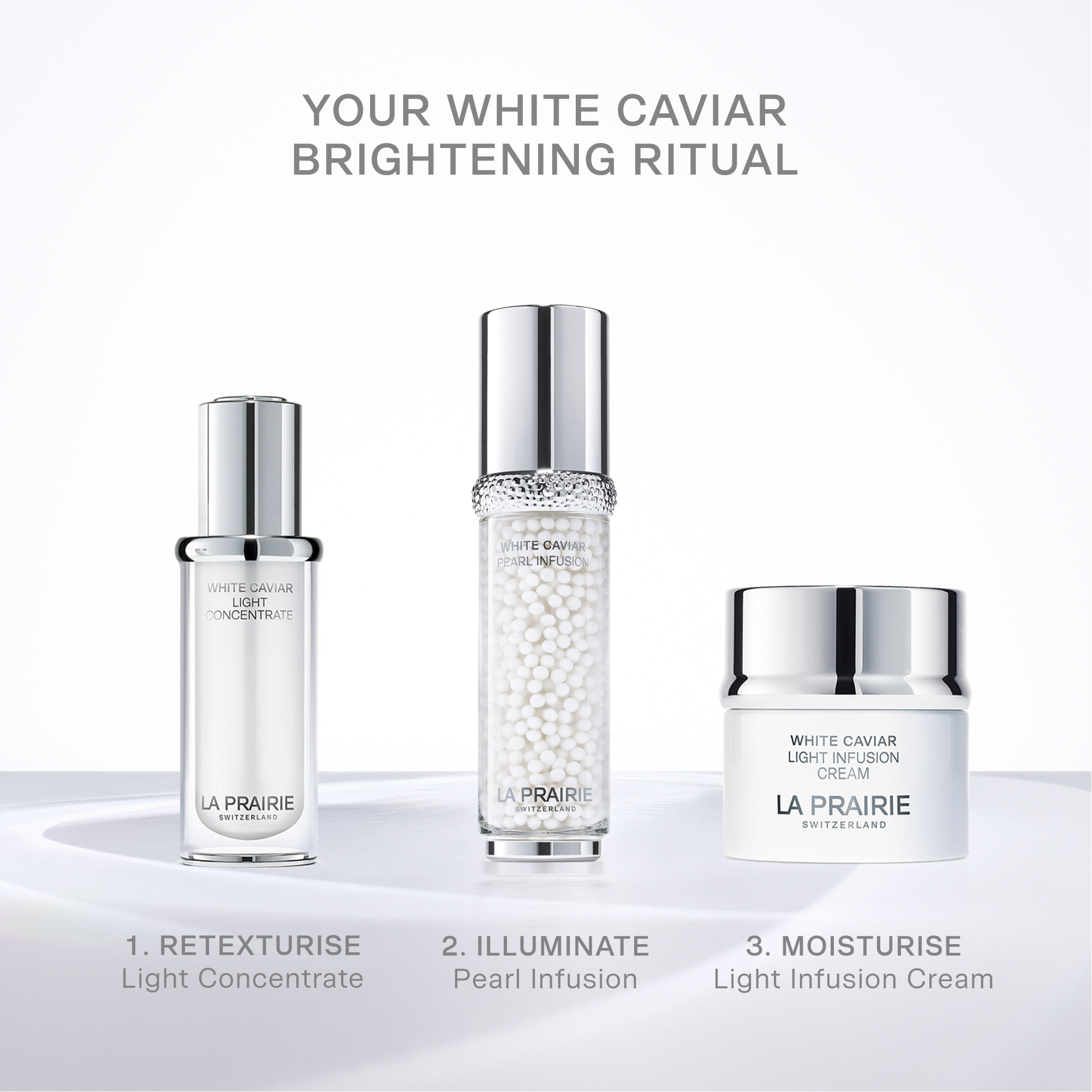- Follow with White Caviar Pearl Infusion and White Caviar Light Infusion cream. Allow to absorb completely.