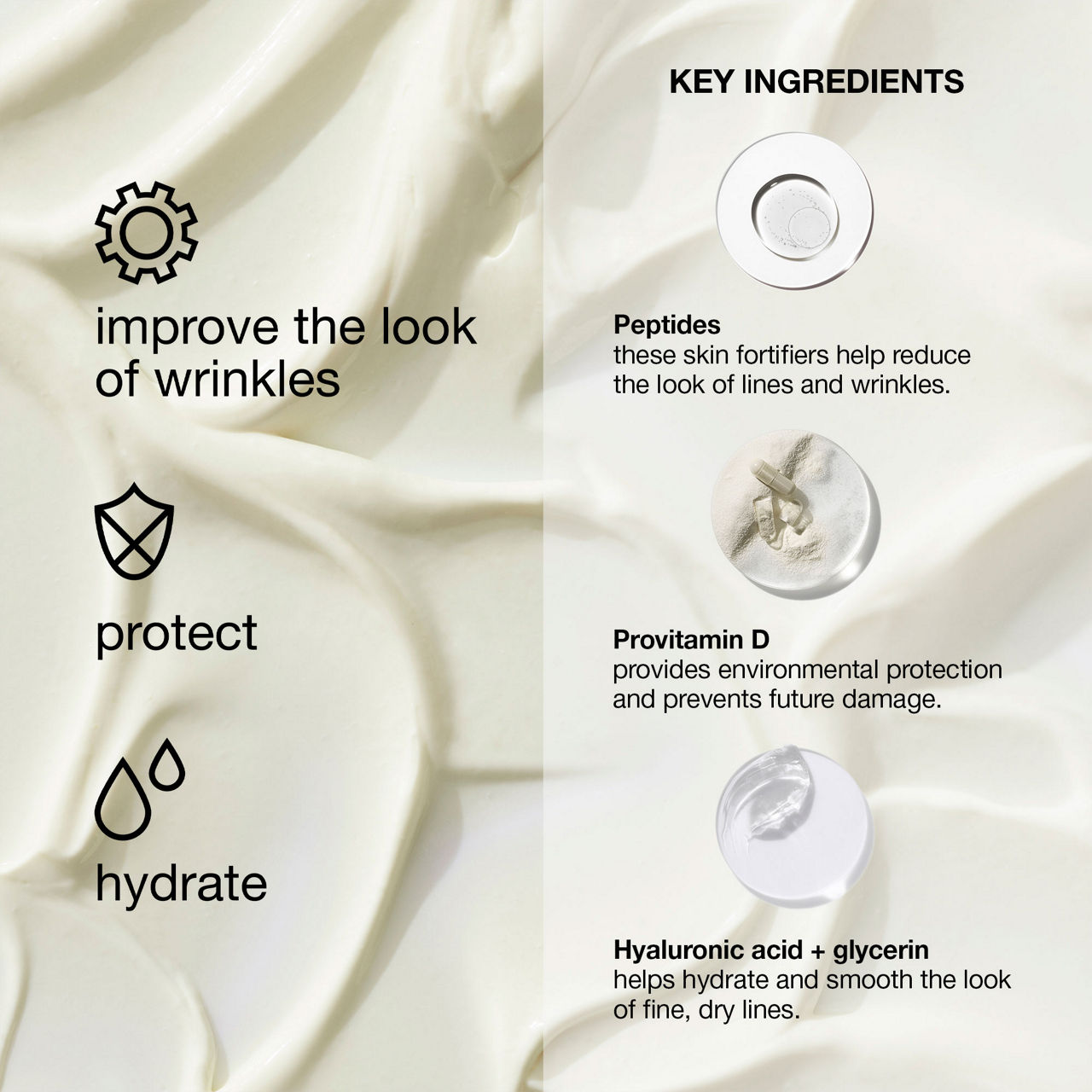 - Benefits: Improves the look of lines and wrinkles, protects, hydrates