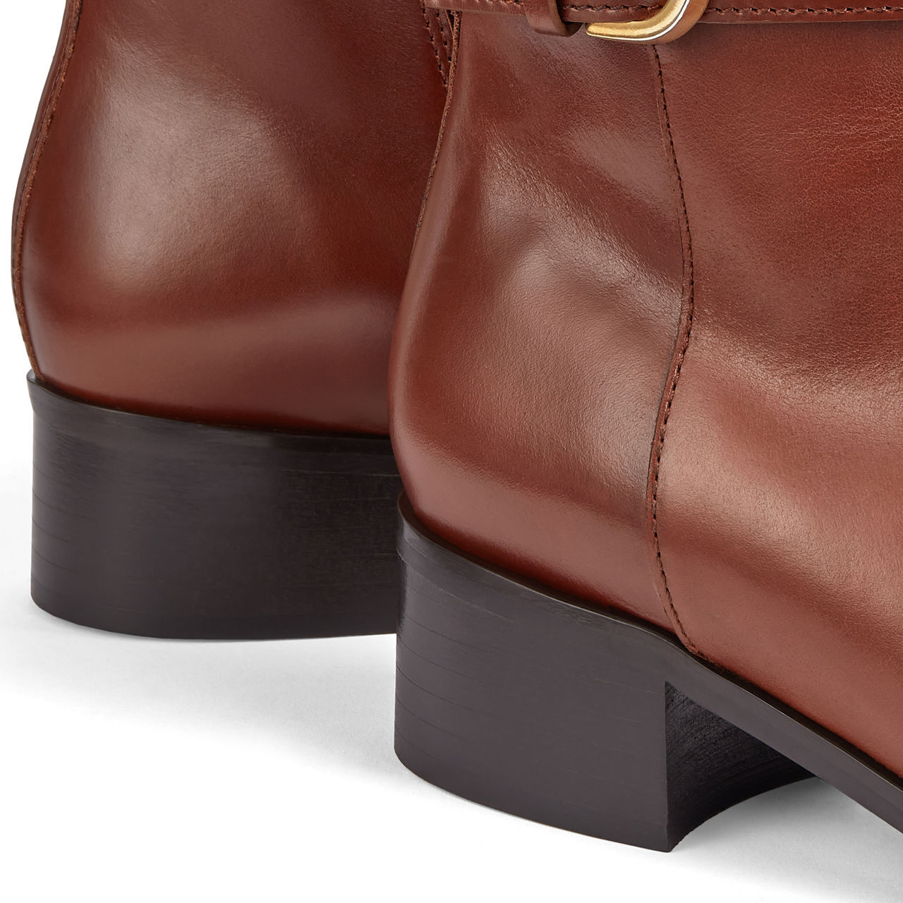 - Inside zip, gold-tone buckle to the ankle, round toe, black-stacked square heel