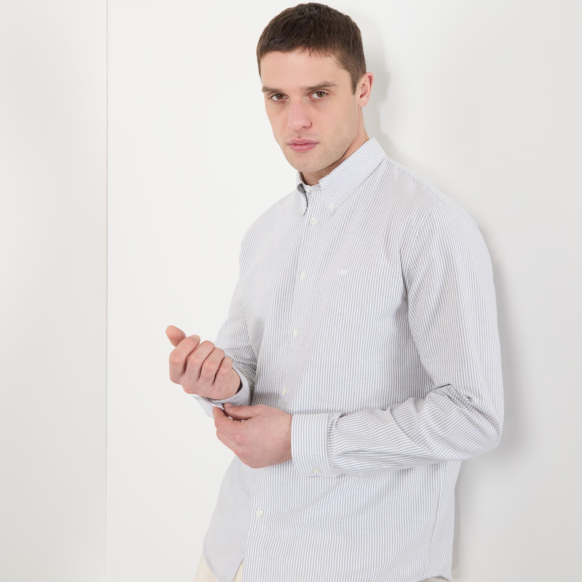 - Button-down collar, long sleeves, front button fastenings, logo embroidery, pinstripe pattern, single-button cuffs, curved hemline, smooth fabric