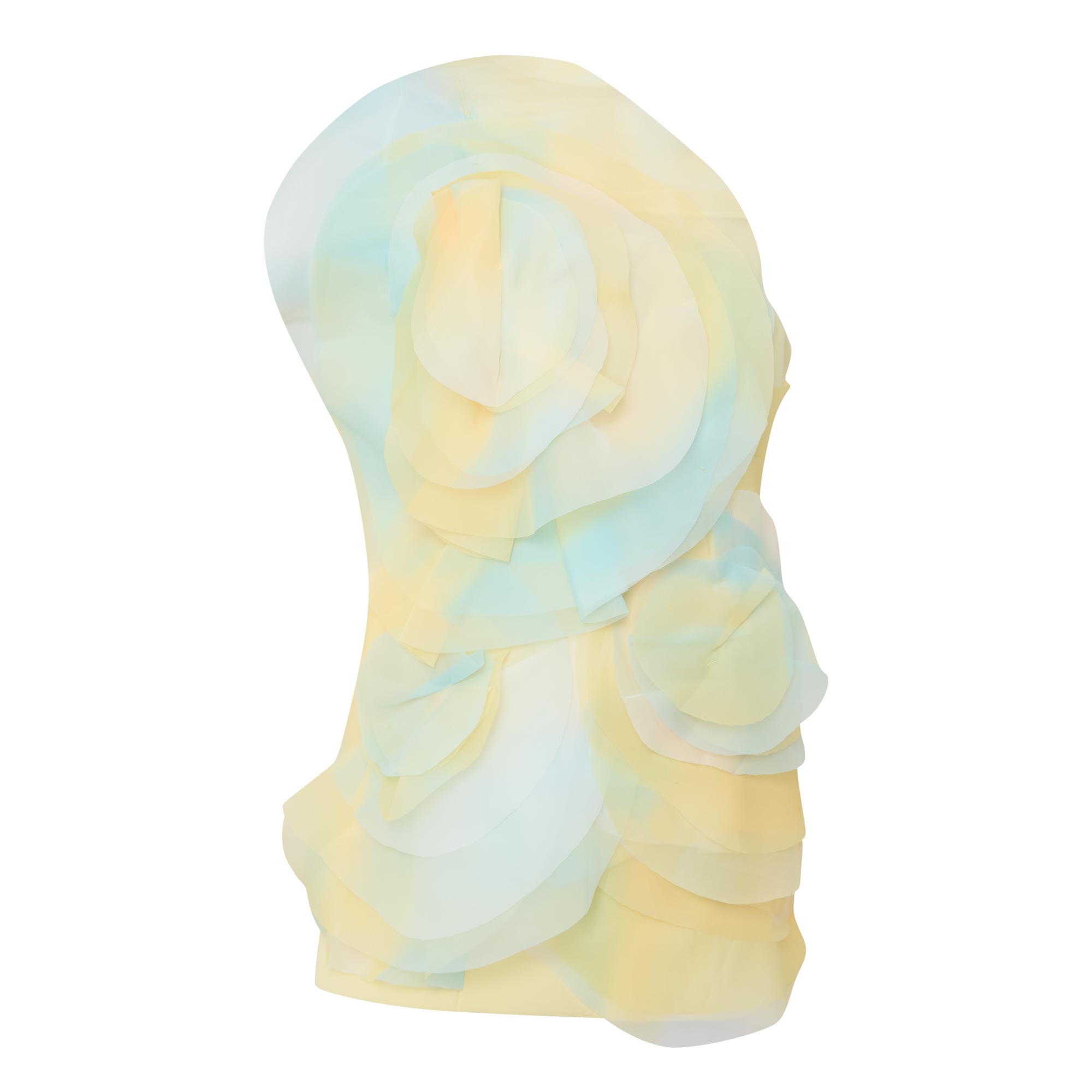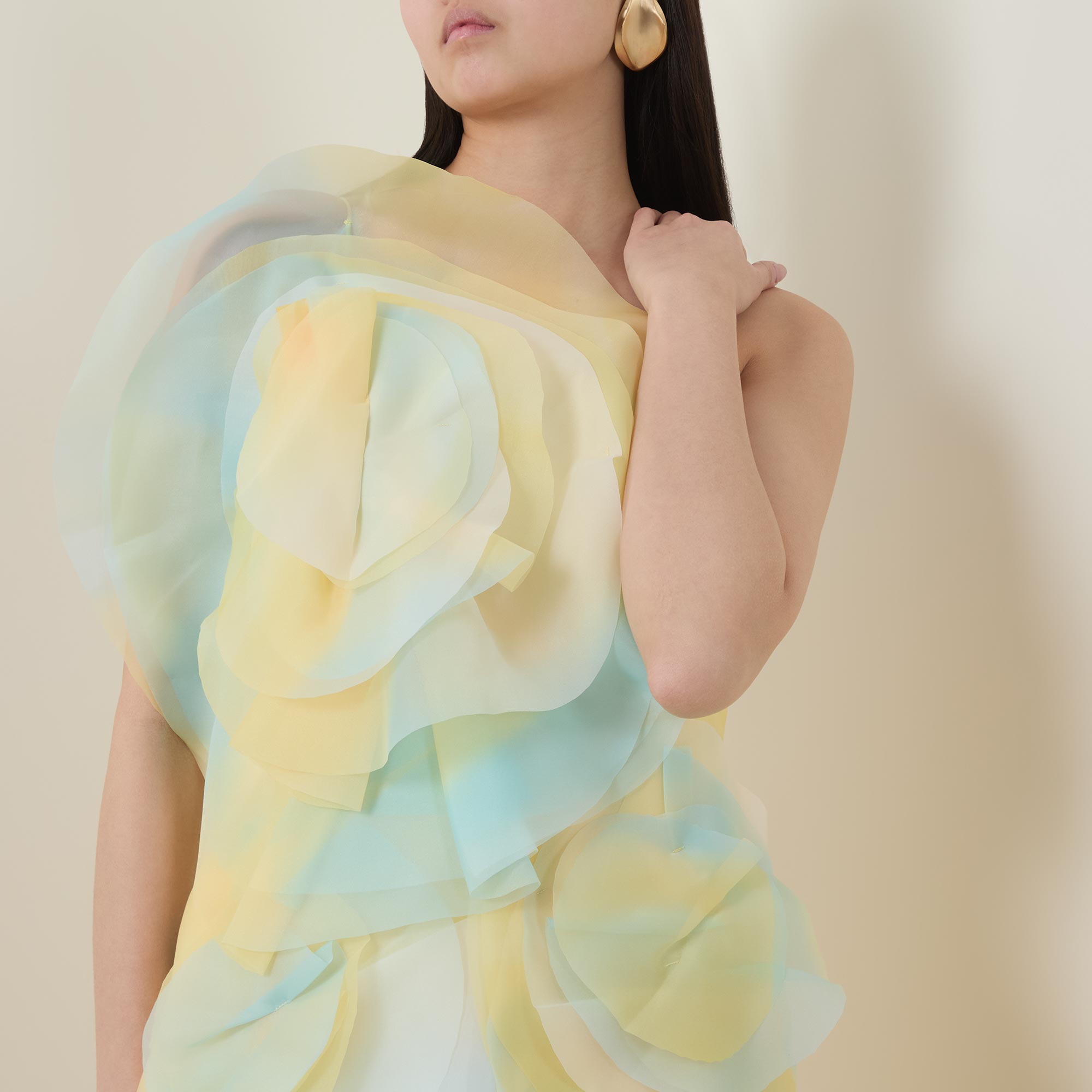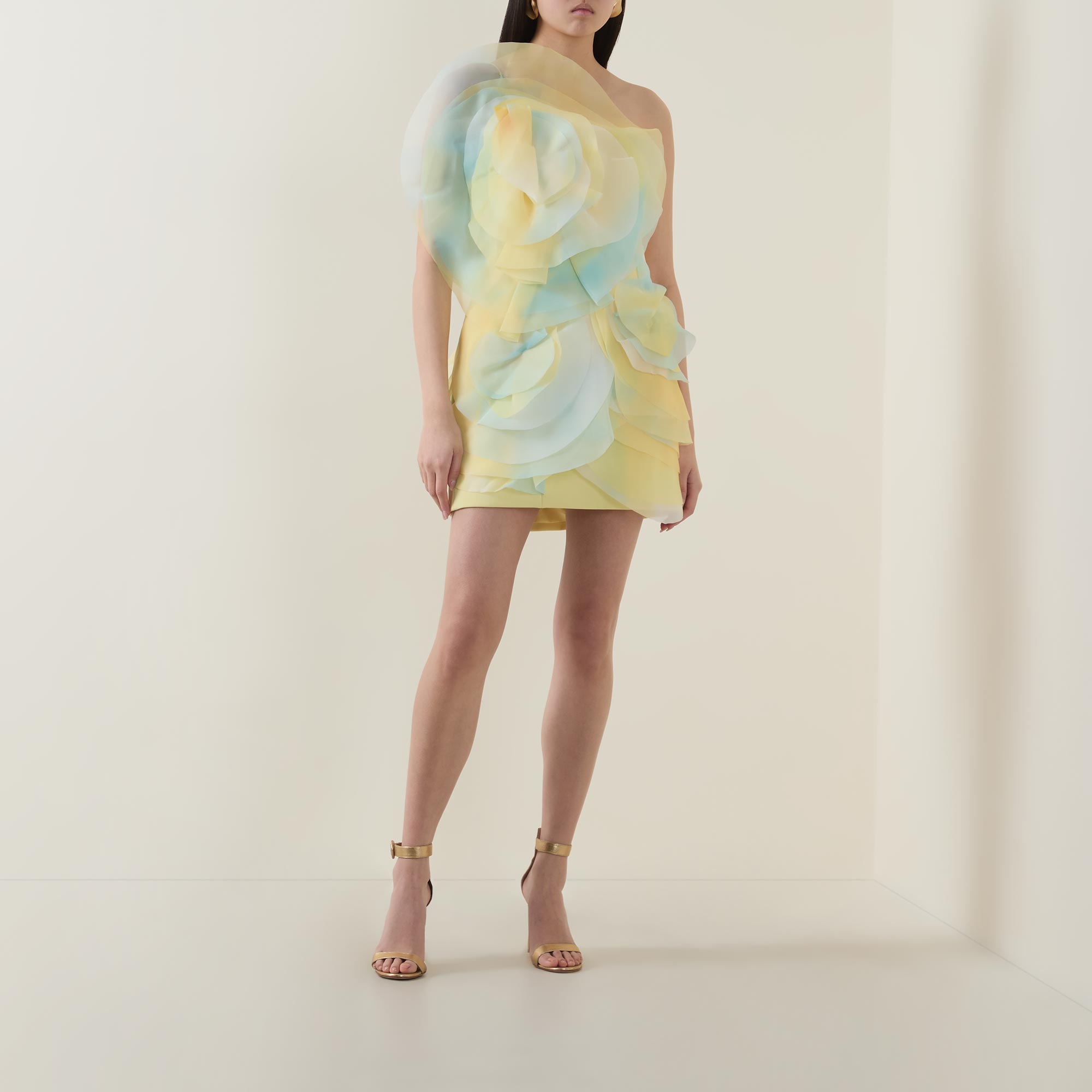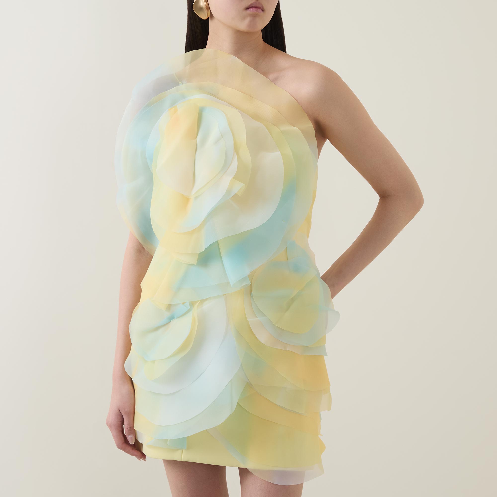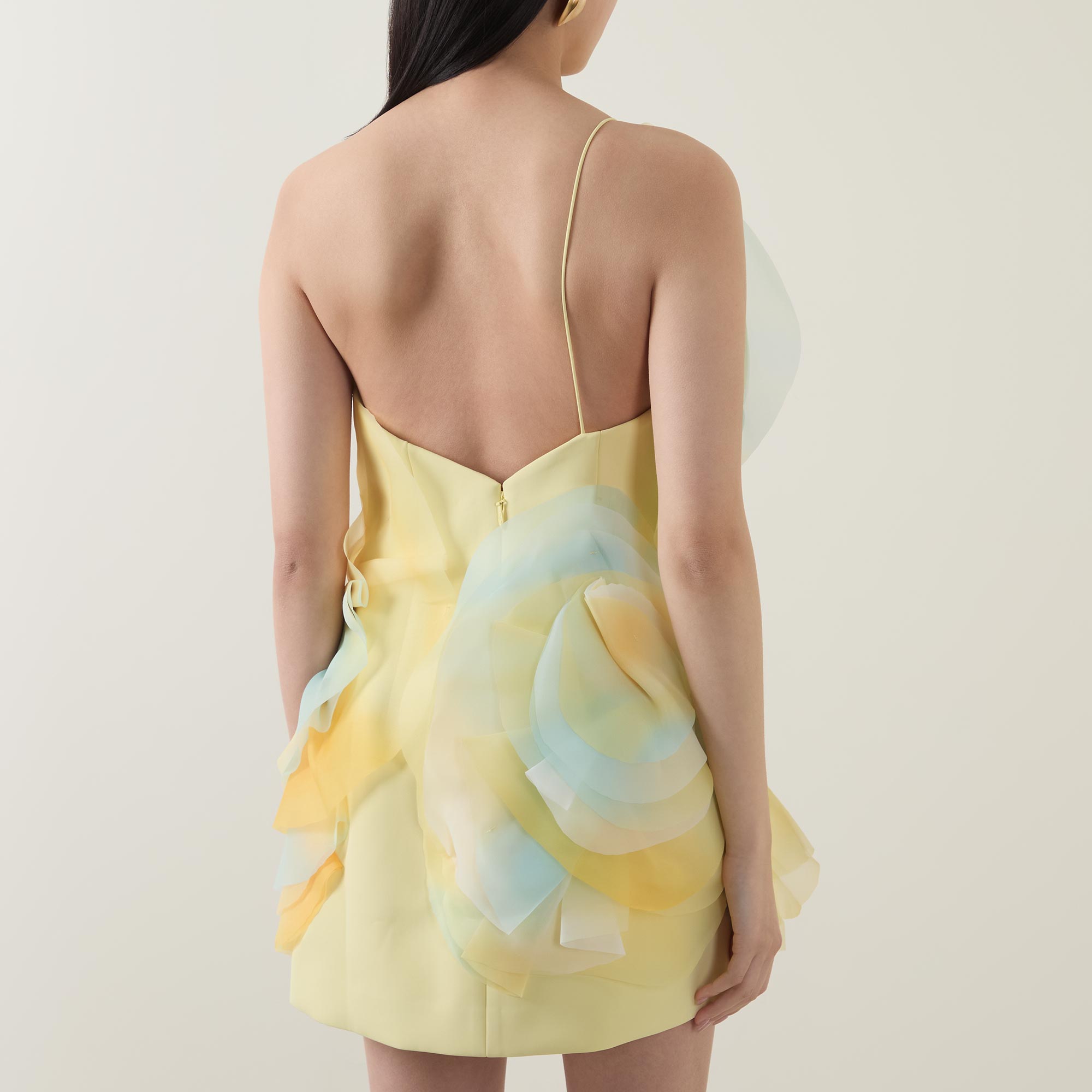 - One spaghetti strap, mini length, zip fastening to the back, printed organza petal embellishments