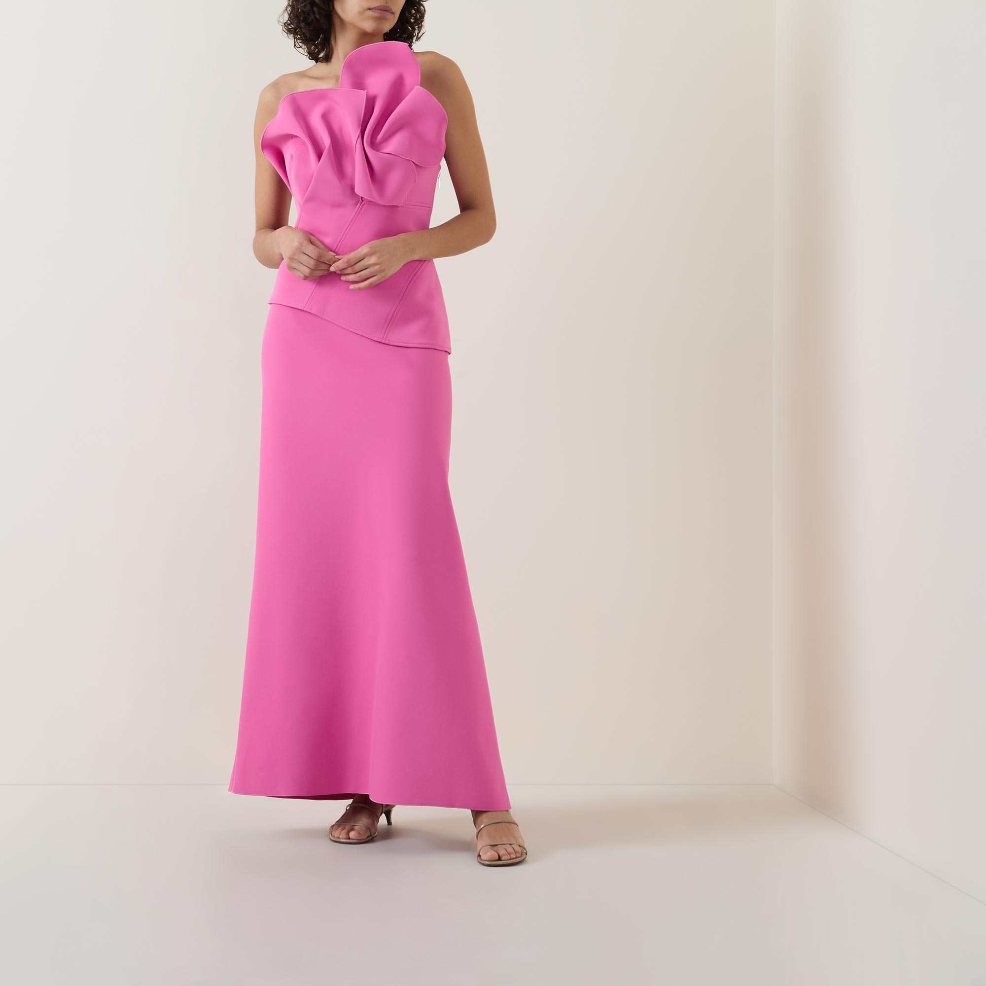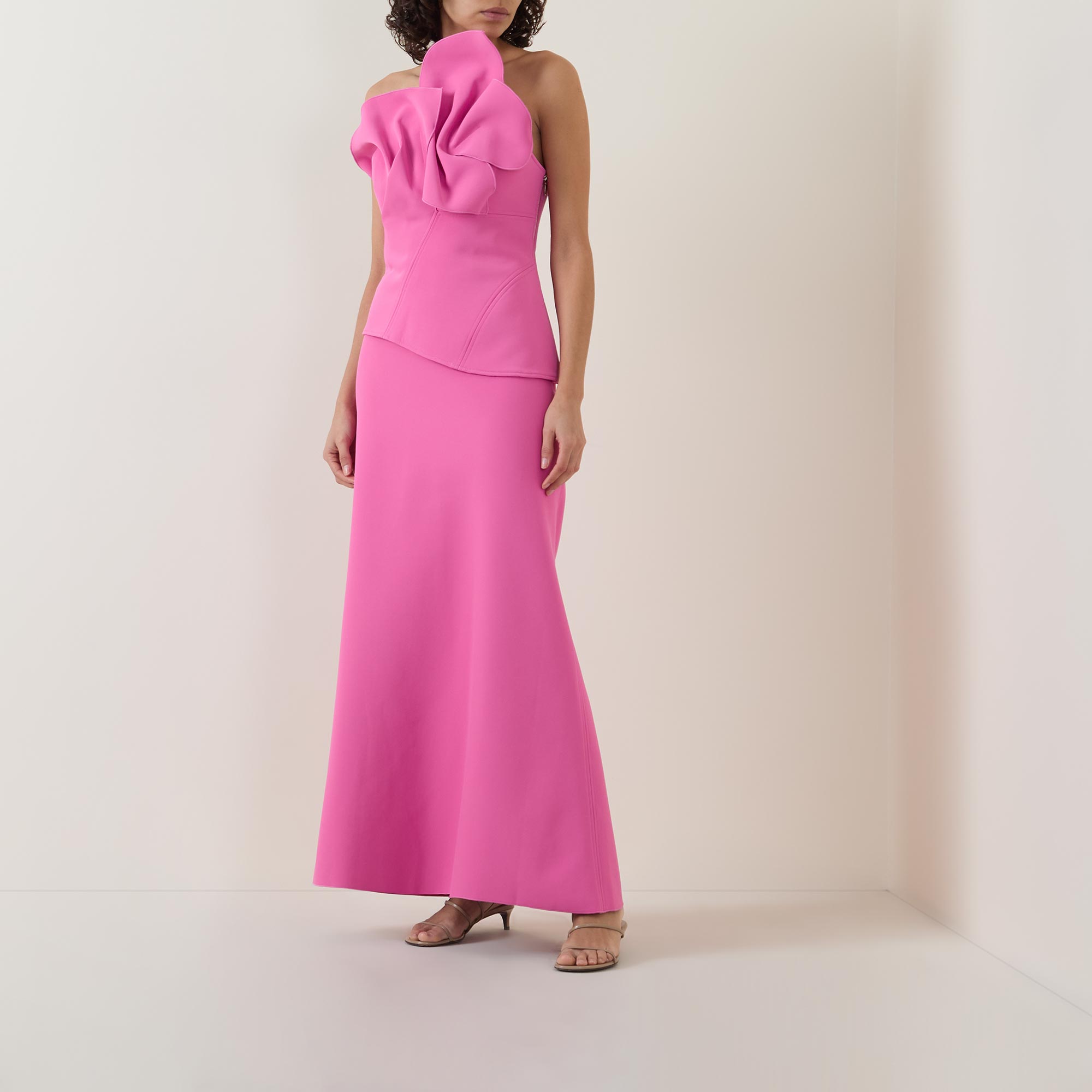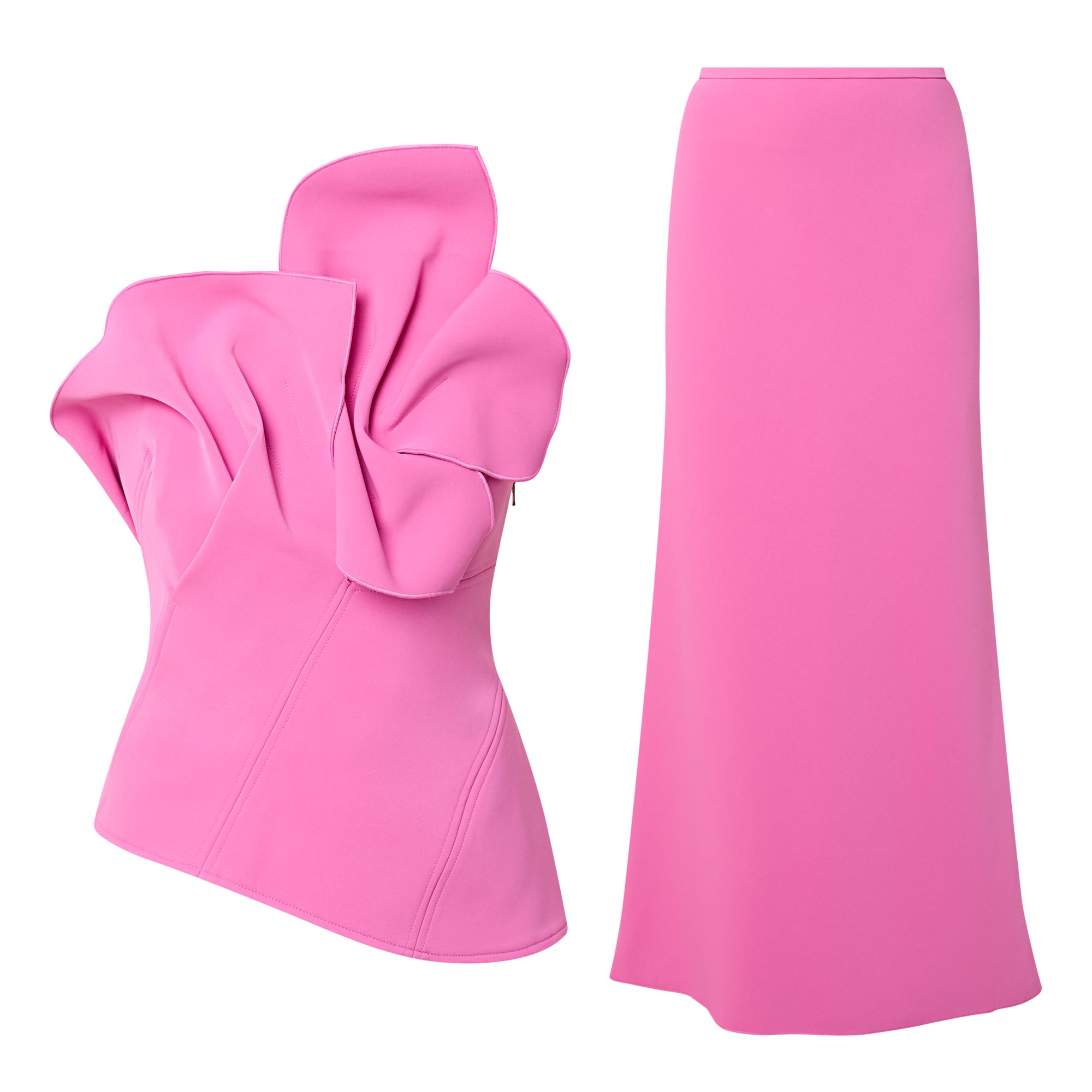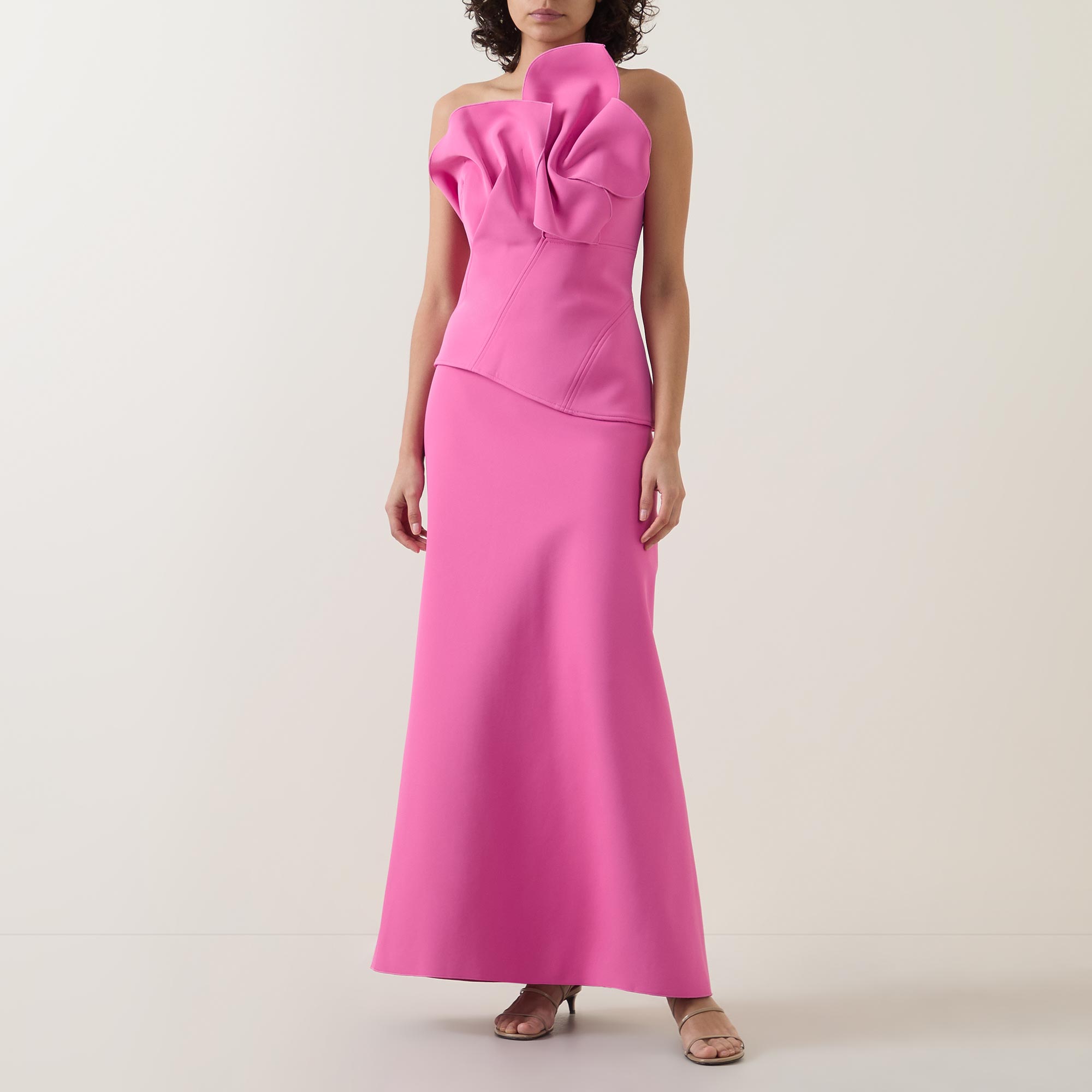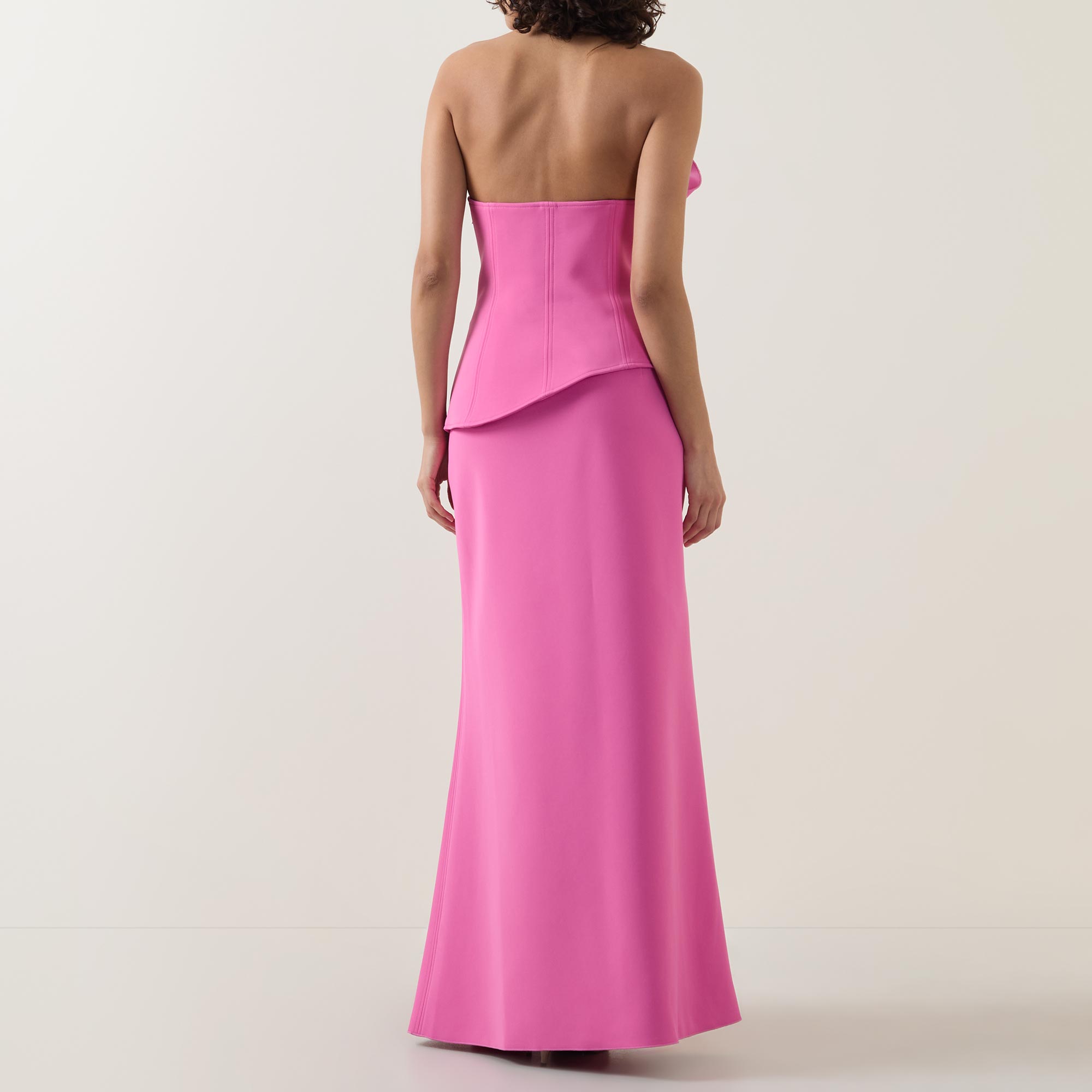 - Two-piece set, bonded scuba construction, detachable skirt, statement bust ruching, left side invisible zip at skirt and bodice, opaque fully lined bodice