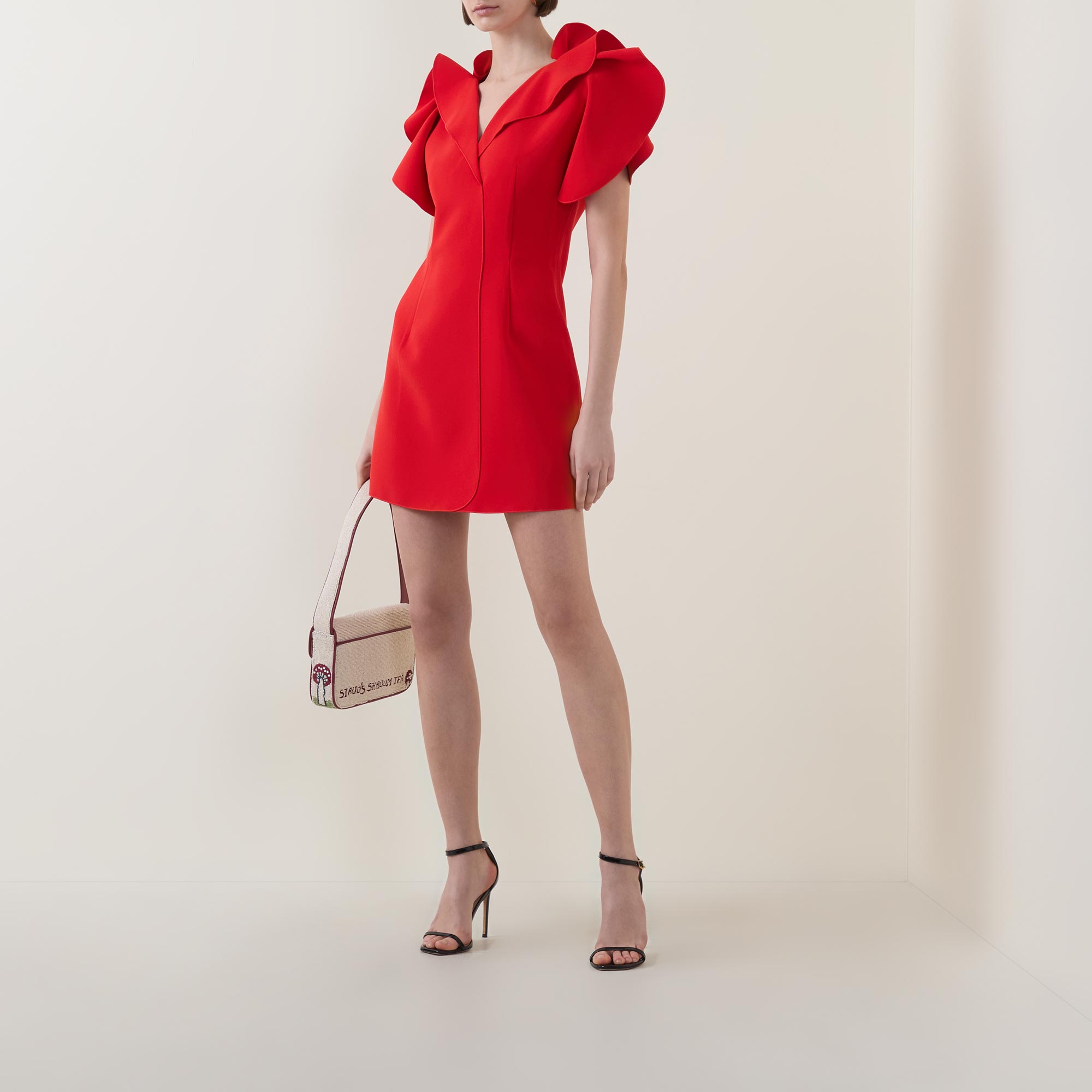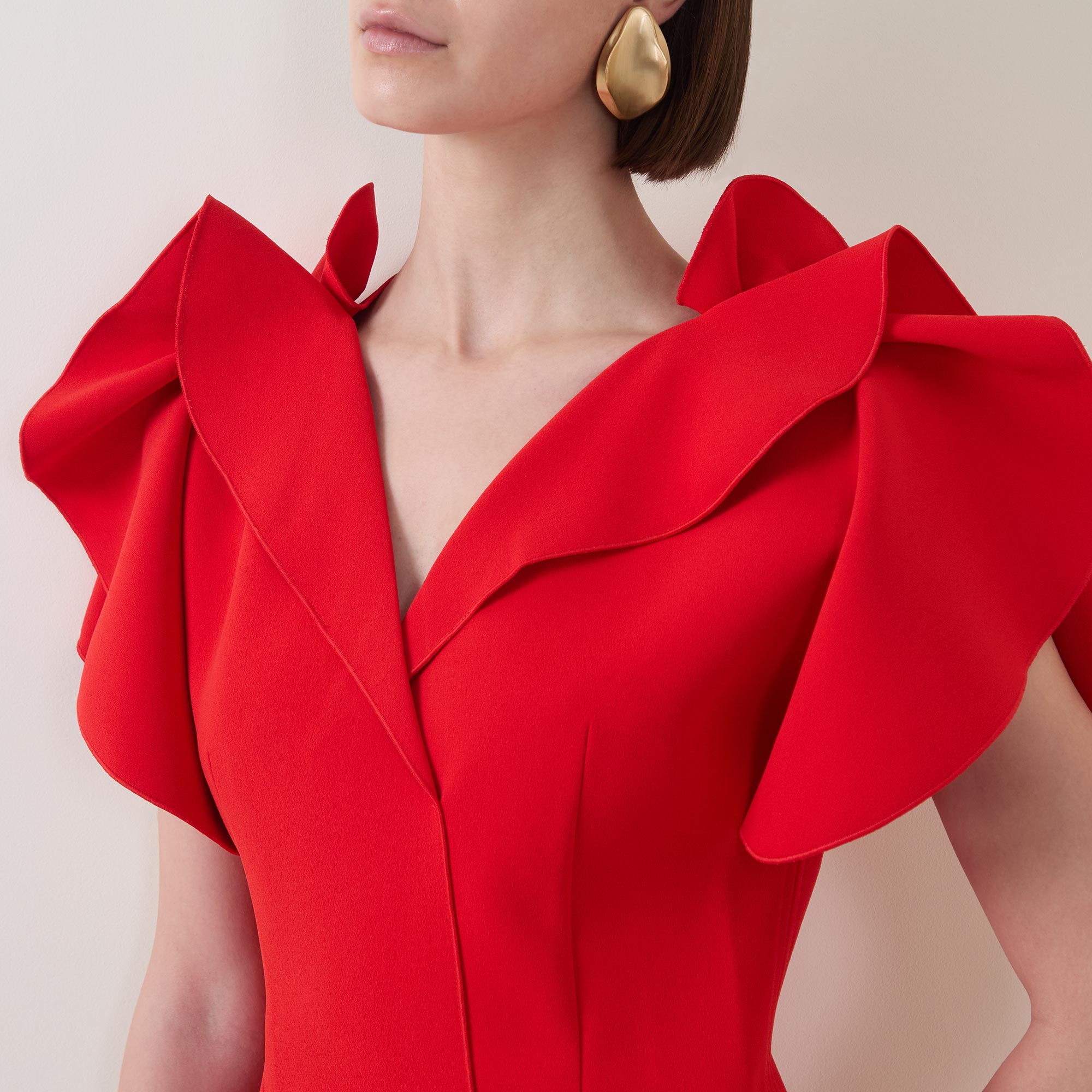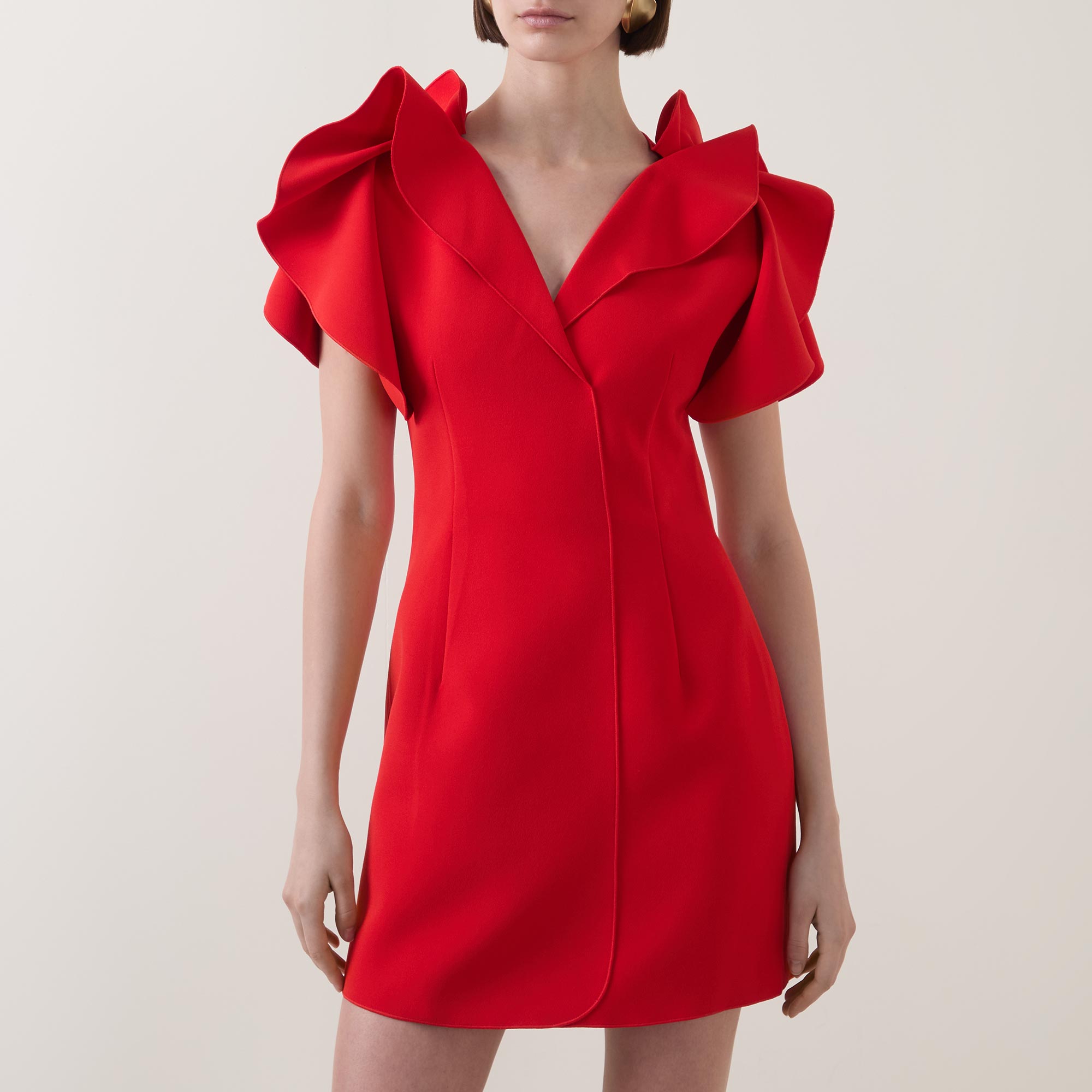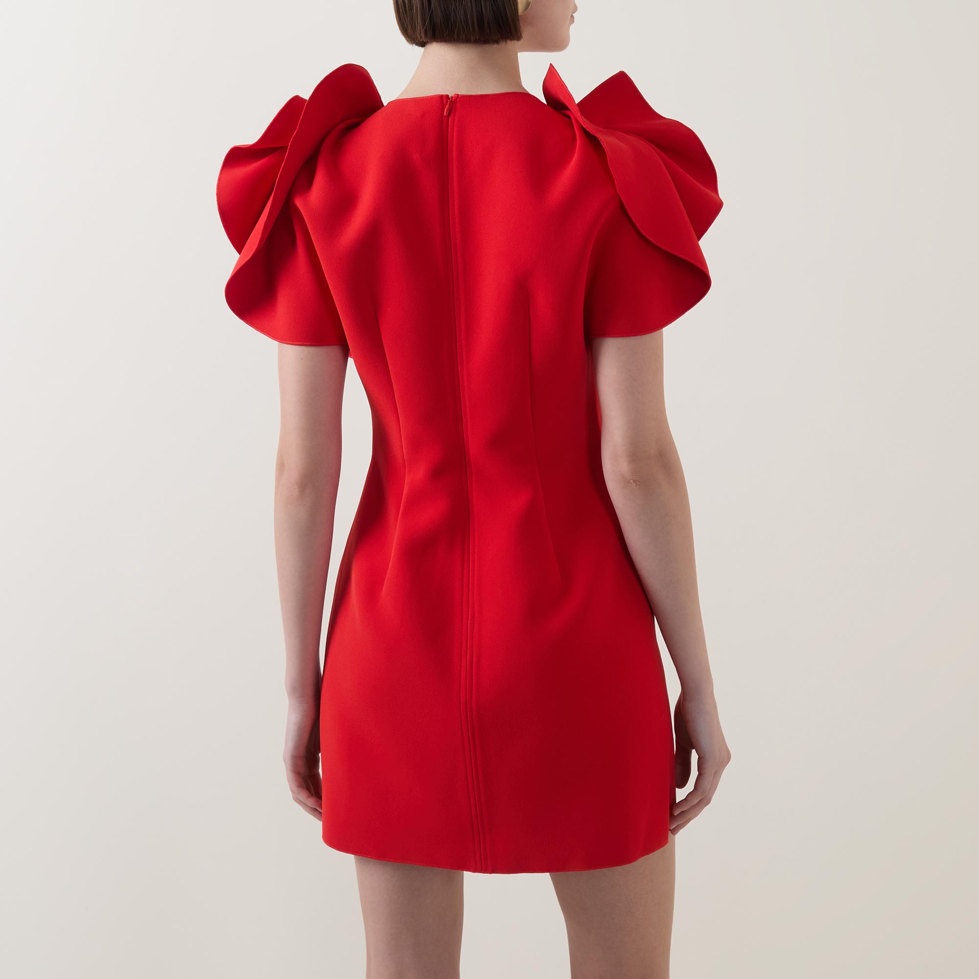 - V-neckline, short sleeves, sculptural detailing, fitted through the waist, wrap-style effect, rear zip fastening, straight hem, tonal stitching, mini length, smooth finish
