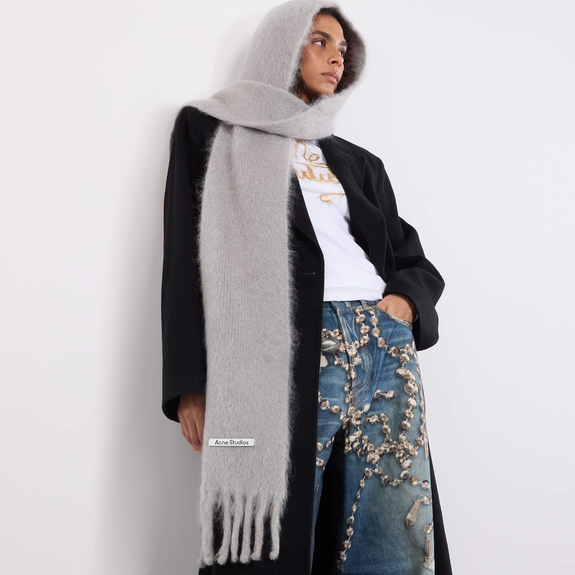 - Oblong-shaped, fringed edges, logo label, brushed mohair finish