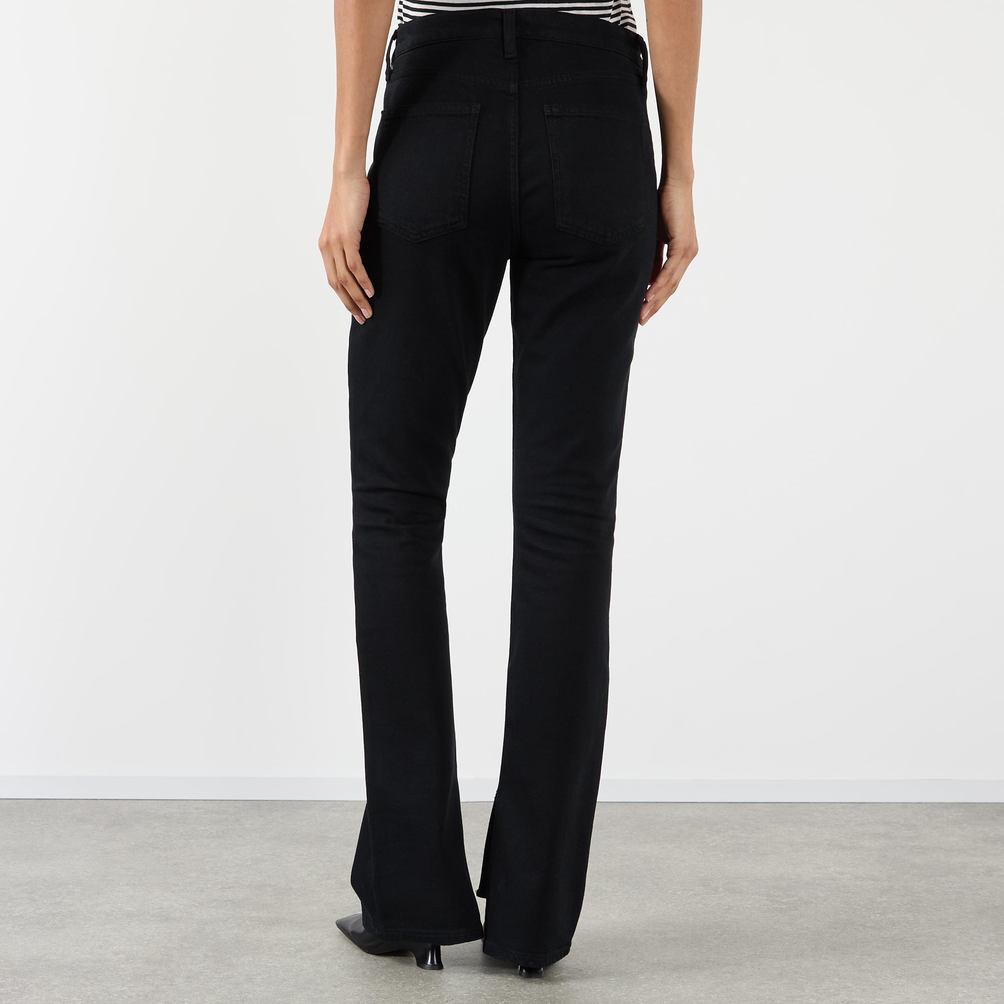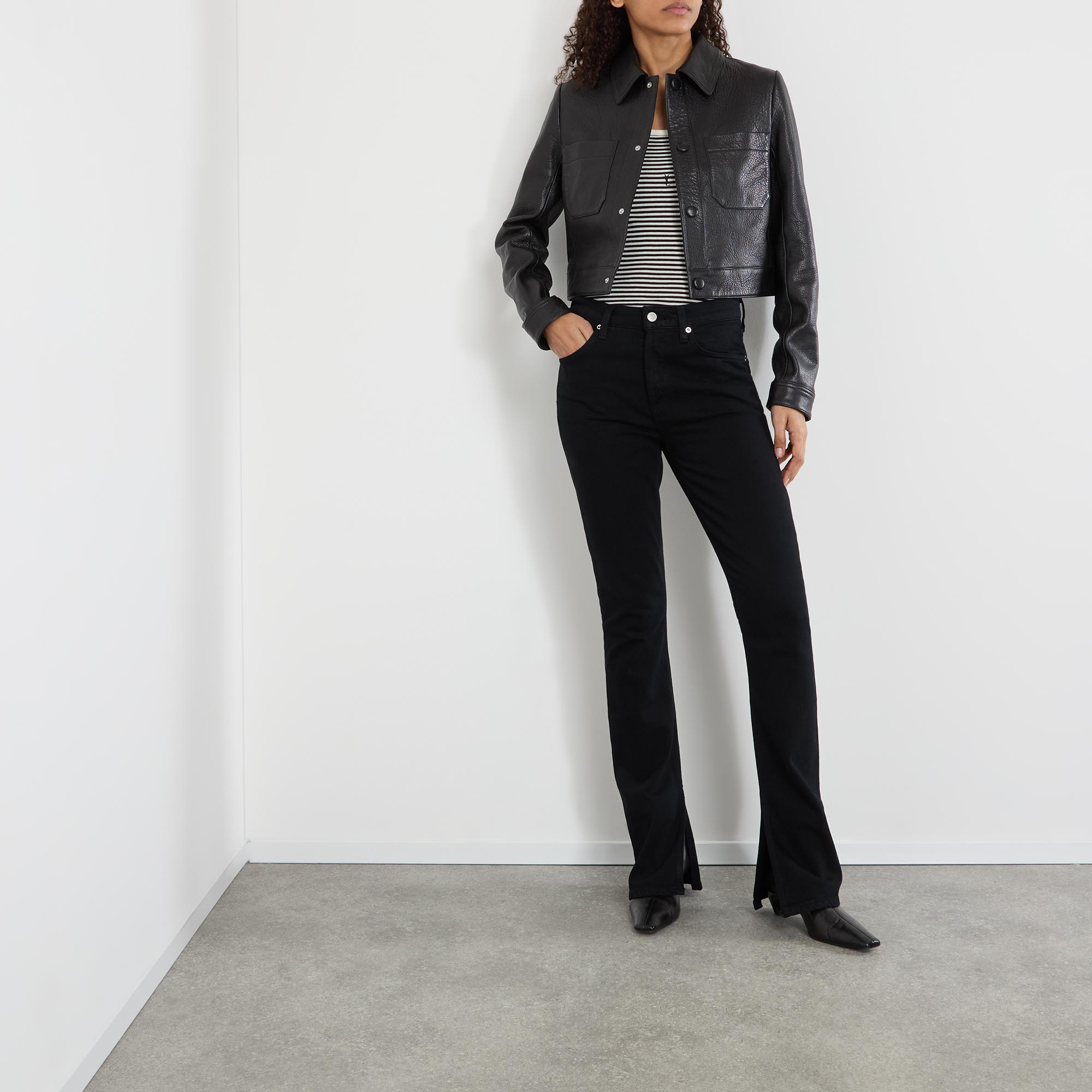 - Zip-fly and button fastening, belt loops, five-pocket design, tonal stitching, open-cut side hems, high-rise, skinny-cut leg, smooth denim finish