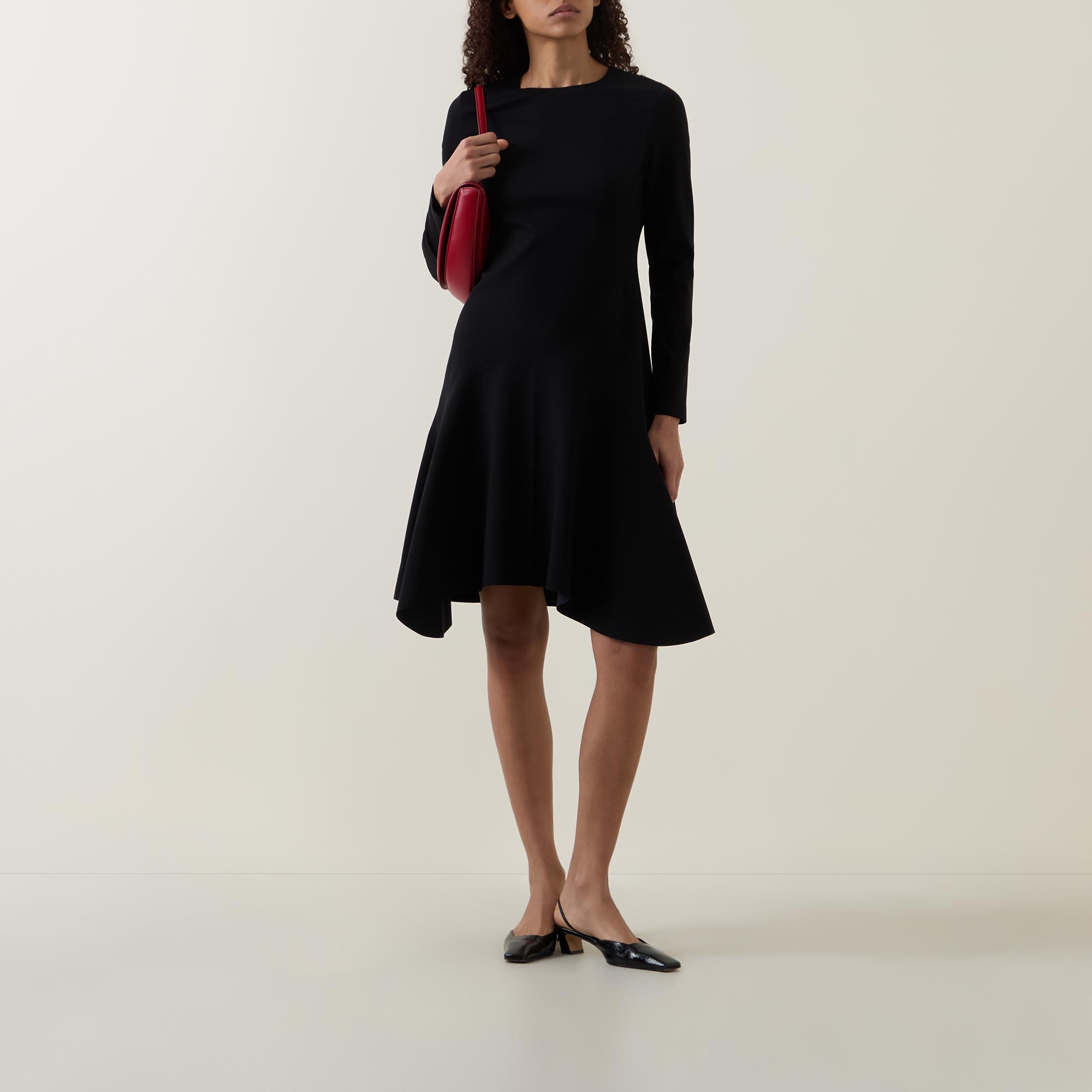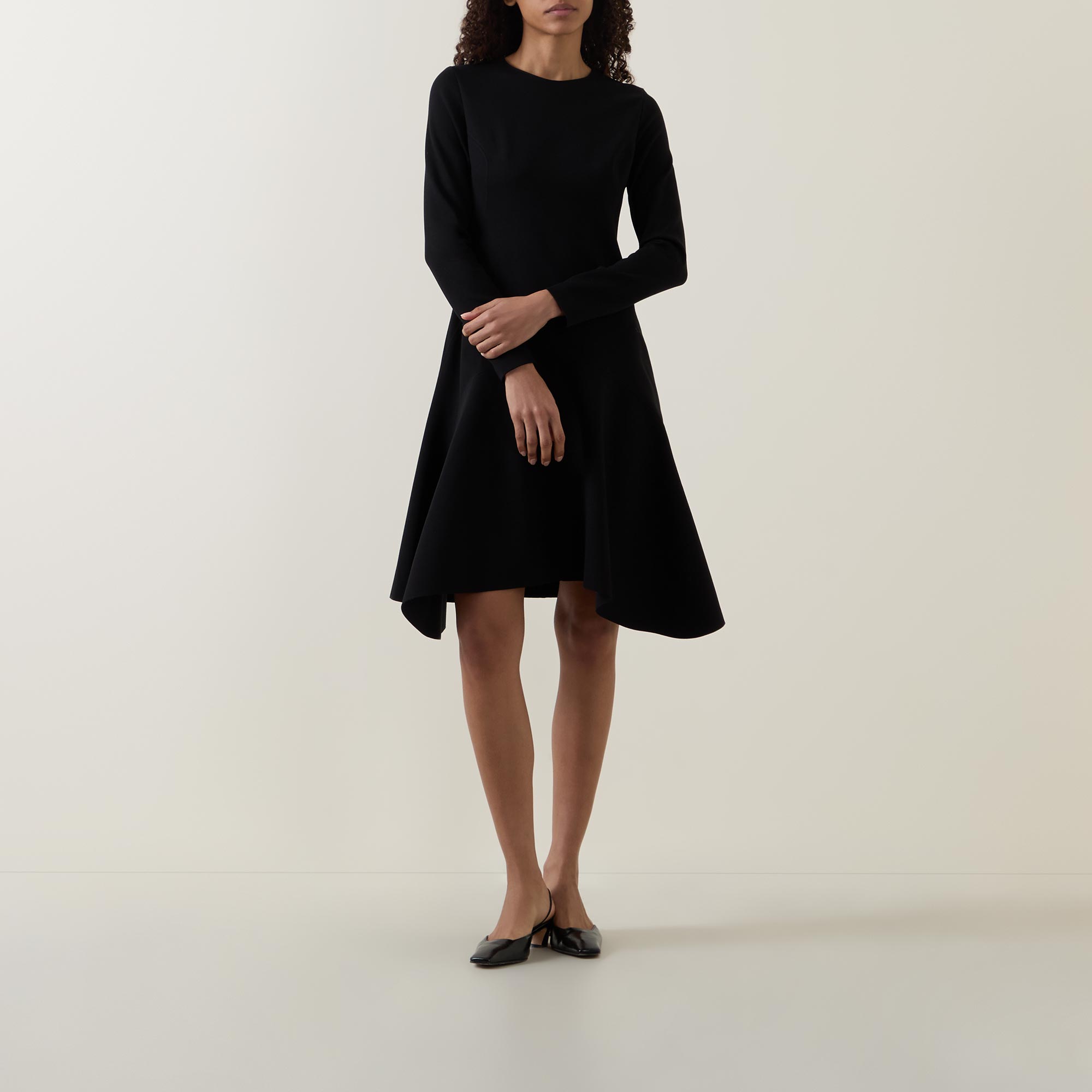 - Crew neckline, long sleeves, back zip-fastening closure, flared silhouette, asymmetric hemline, mini length, smooth fabric