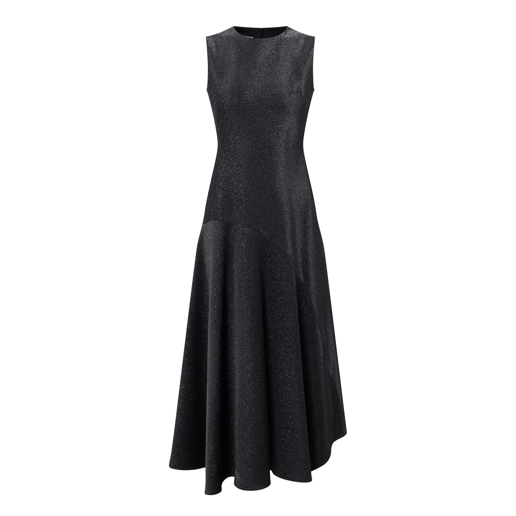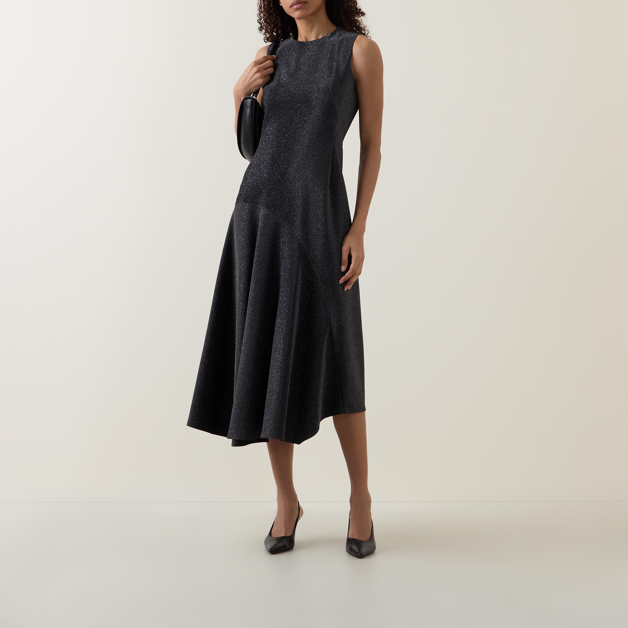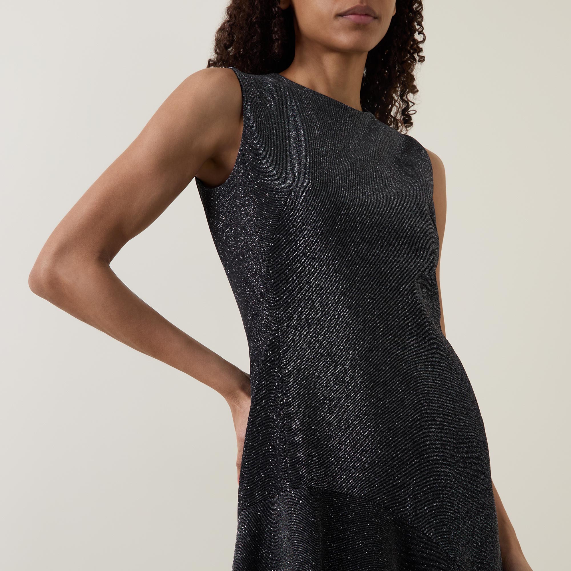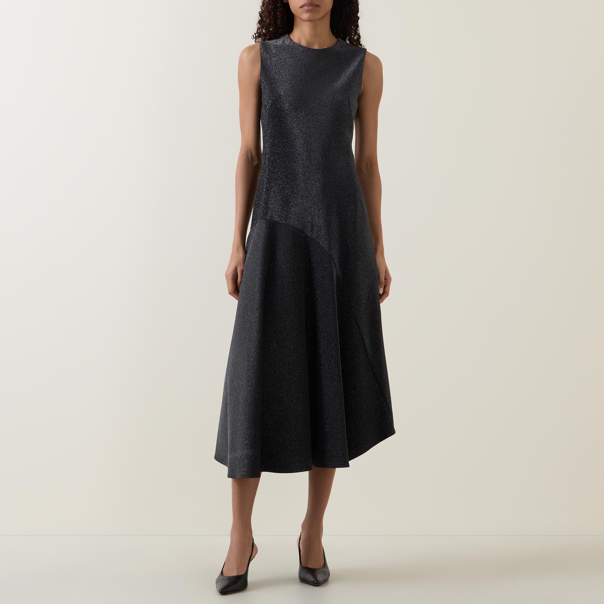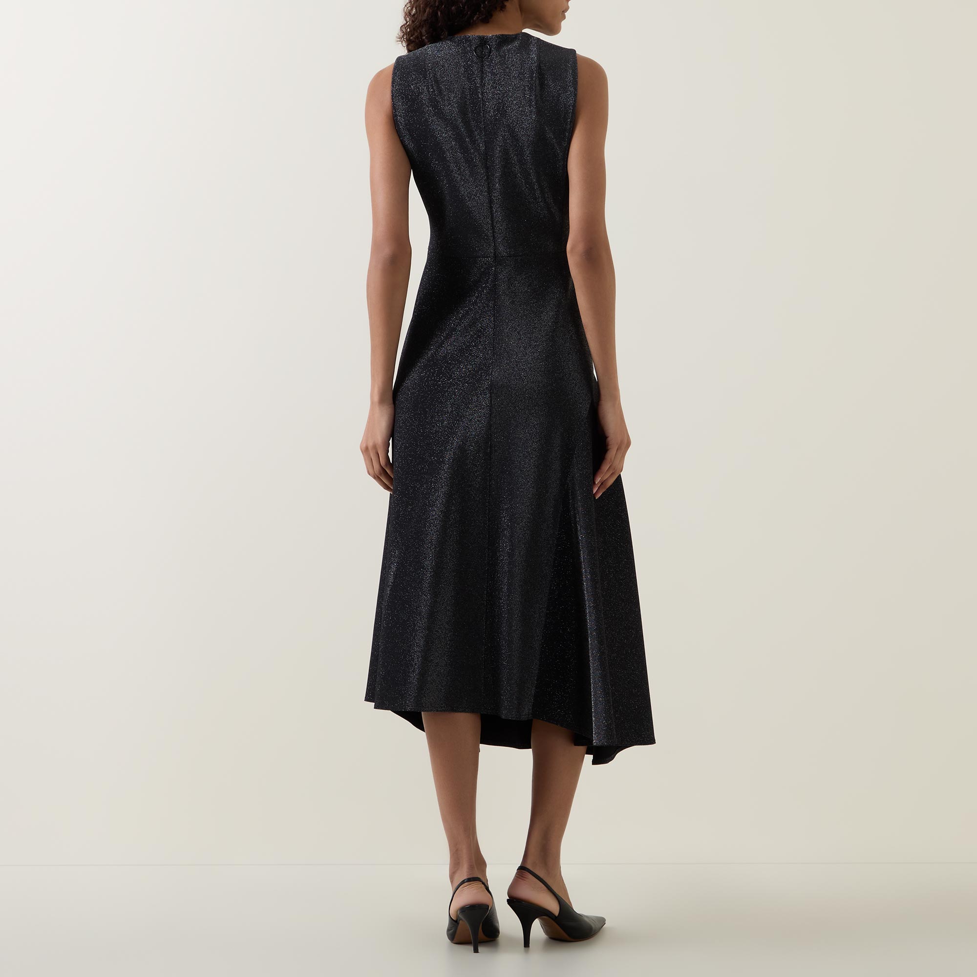 - Crew neckline, sleeveless, back zip-fastening closure, flared silhouette, asymmetric hemline, midi length, metallic finish