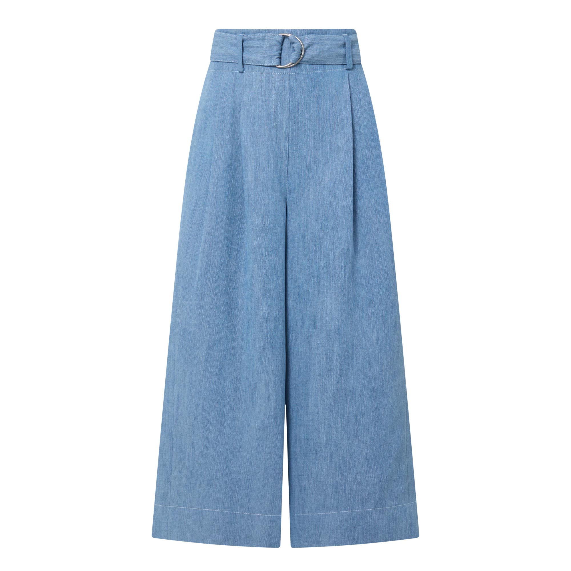 - High rise, wide leg, cropped length, belt loops, matching belt with D-ring hardware, front pleats, two side entry pockets, clean hems, light wash