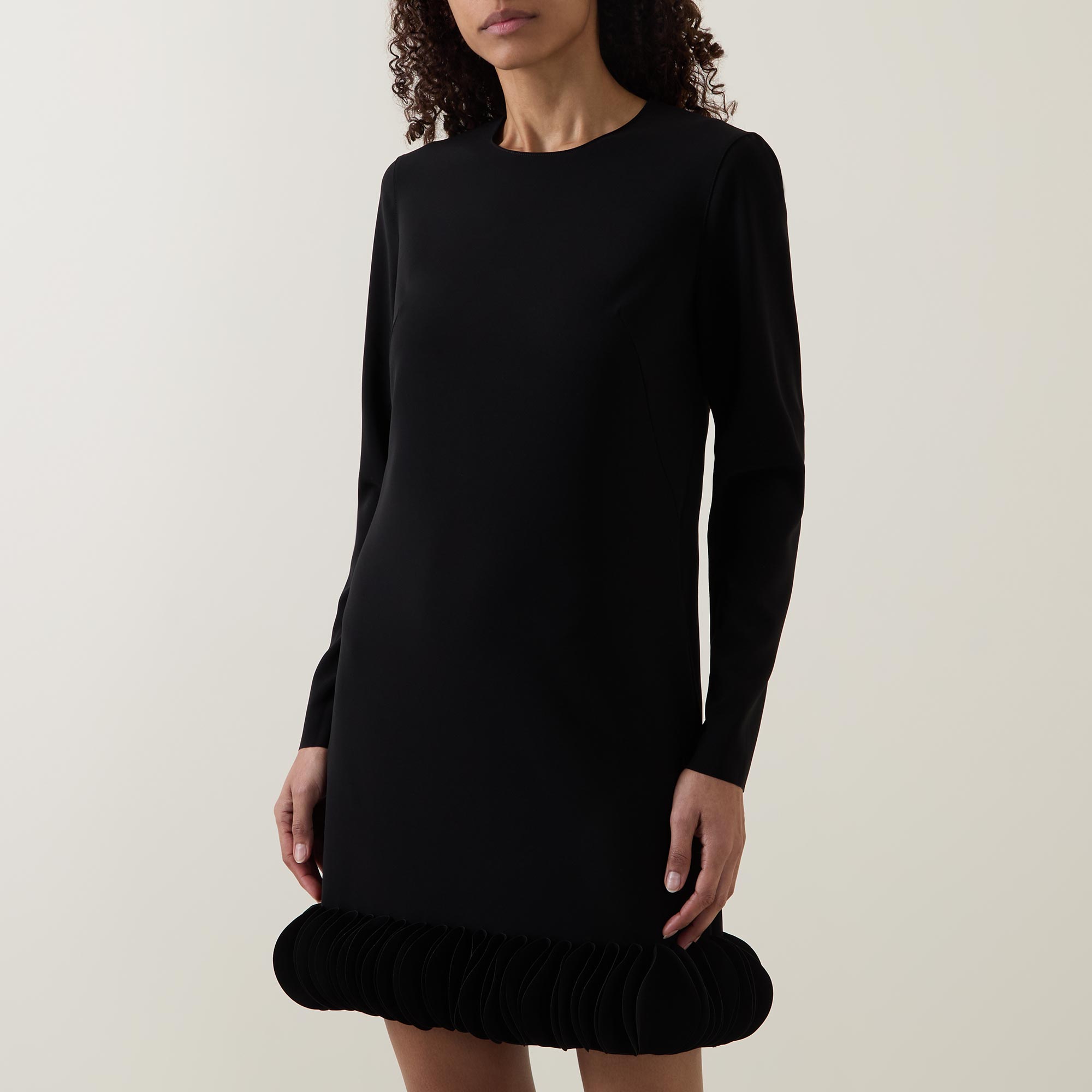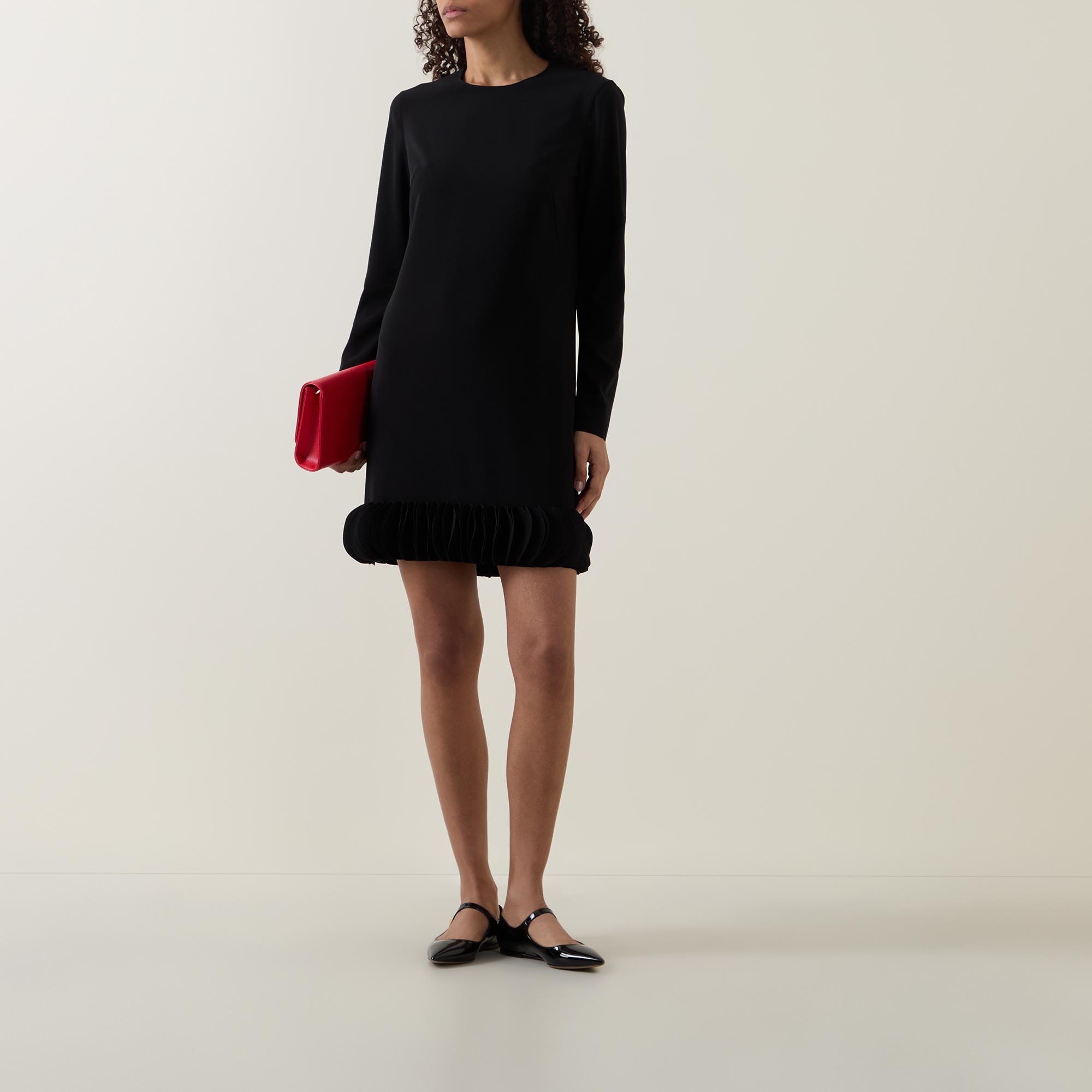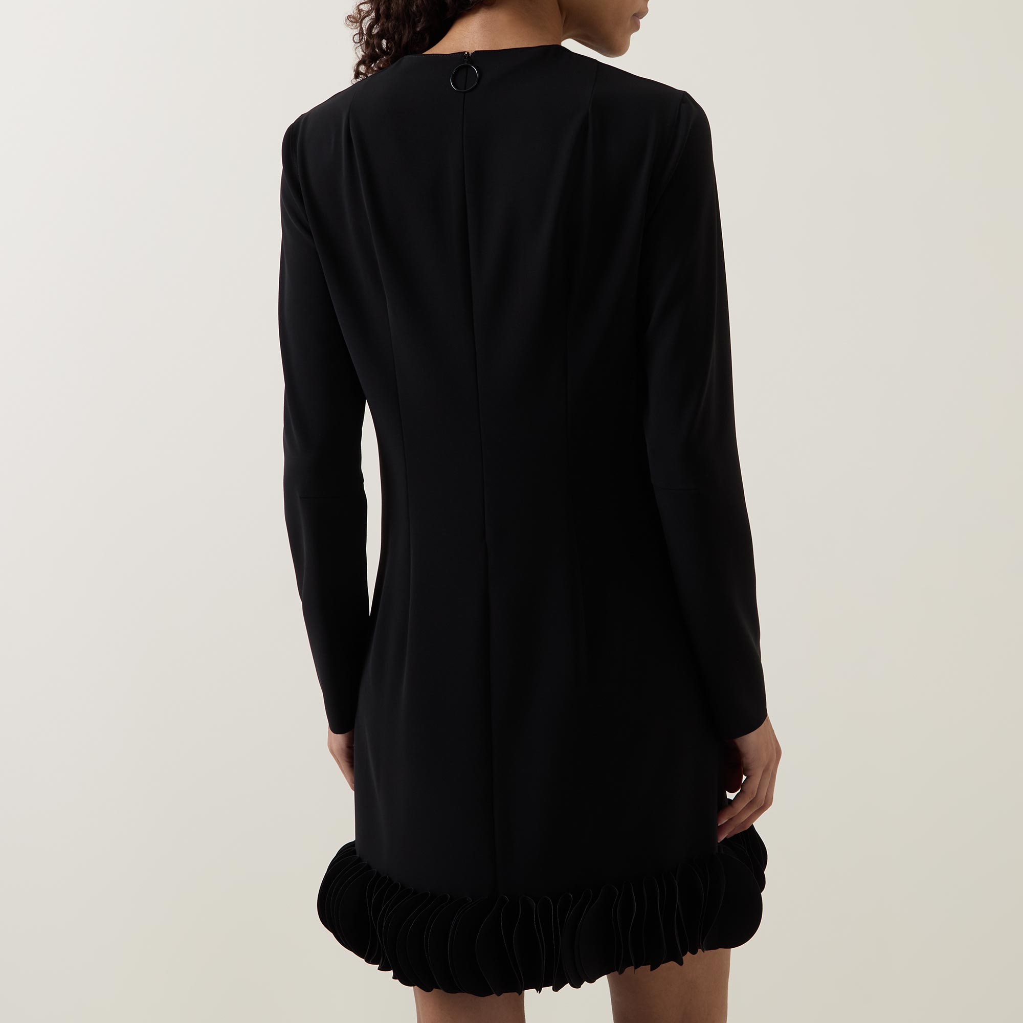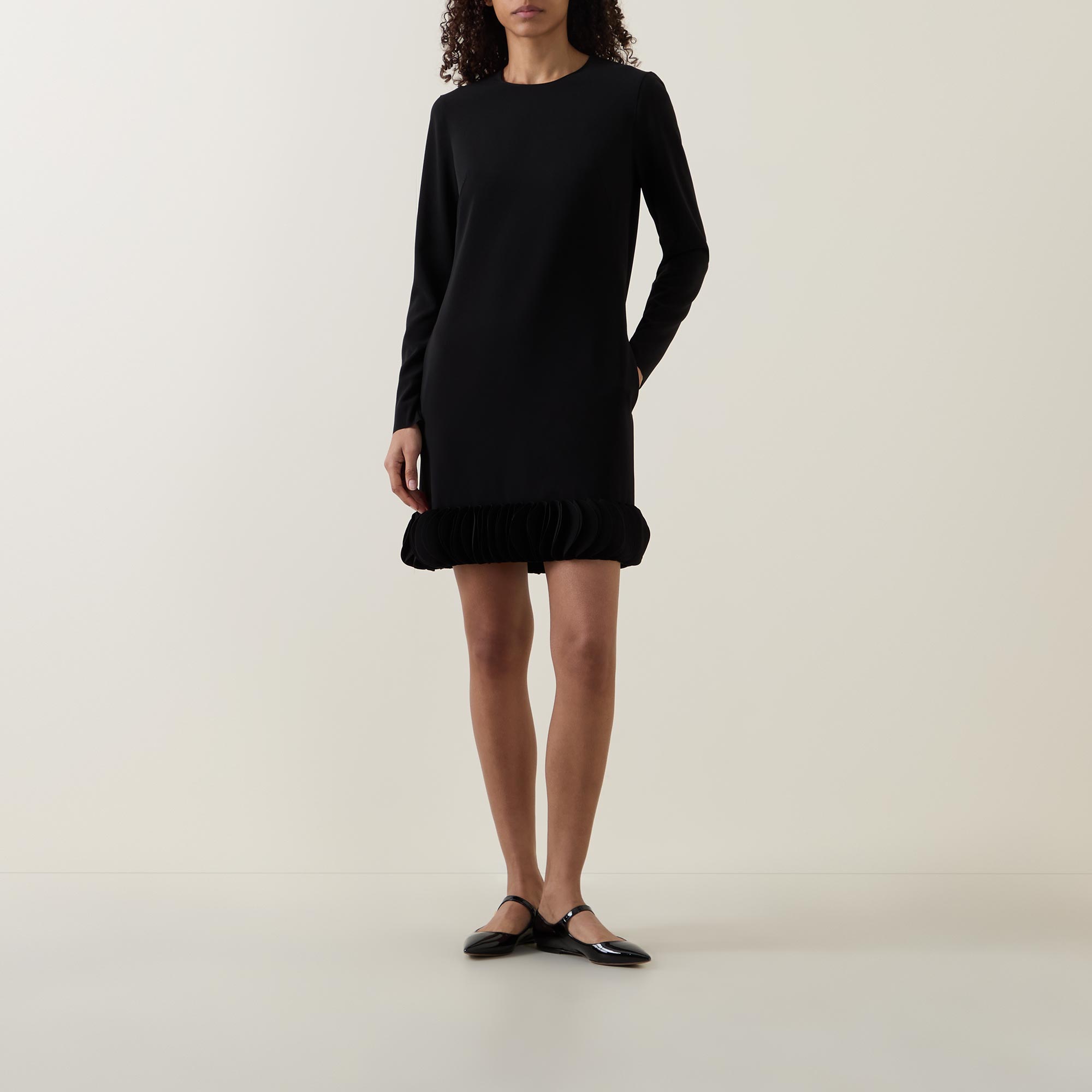 - Round neckline, long sleeves, back zip-fastening closure, shift silhouette, two side in-seam pockets, mini length, frill hem, smooth fabric