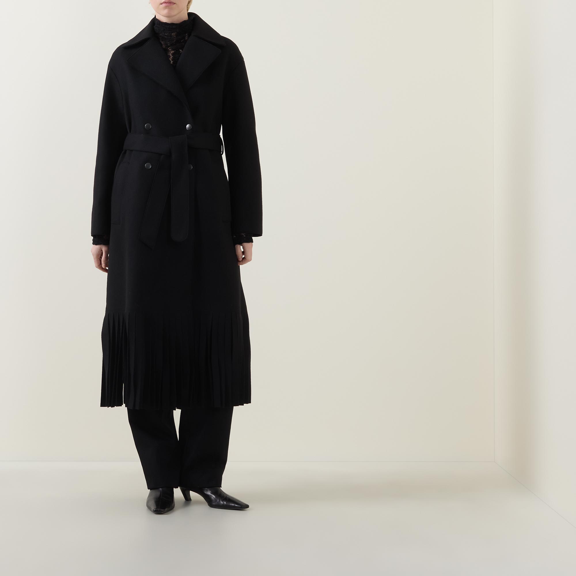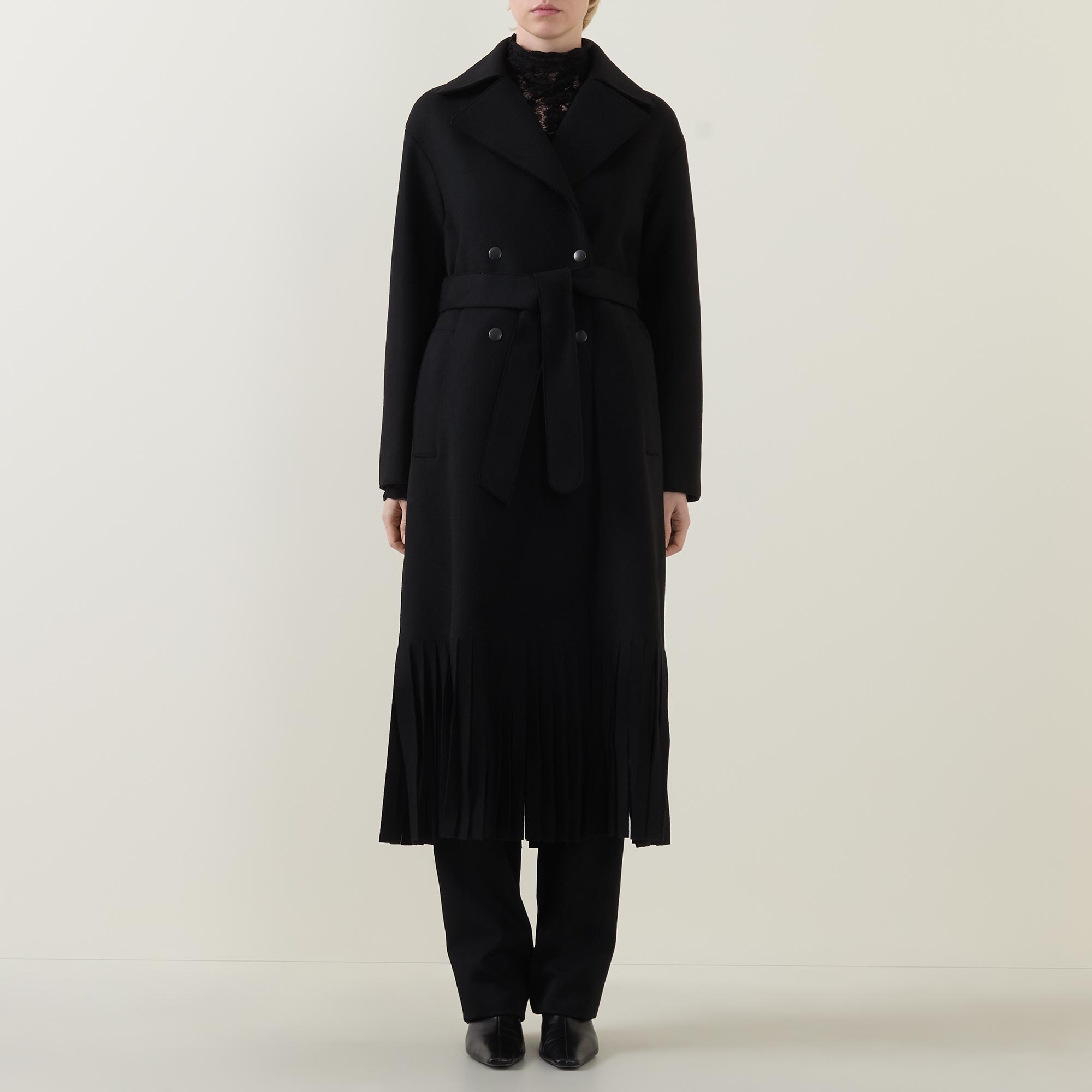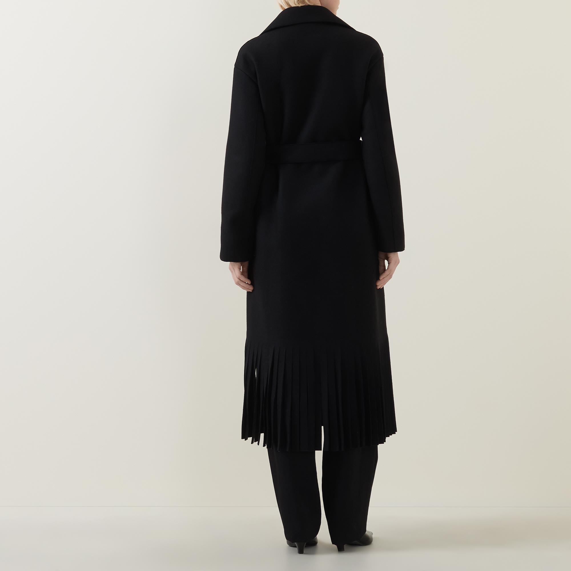 • Notched-lapel collar, double-breasted front, long sleeves, dropped shoulders, tonal button fastenings, belt loops, self-fabric tie-fastening belt, two side in-seam pockets, tape-fringe lasercut hem