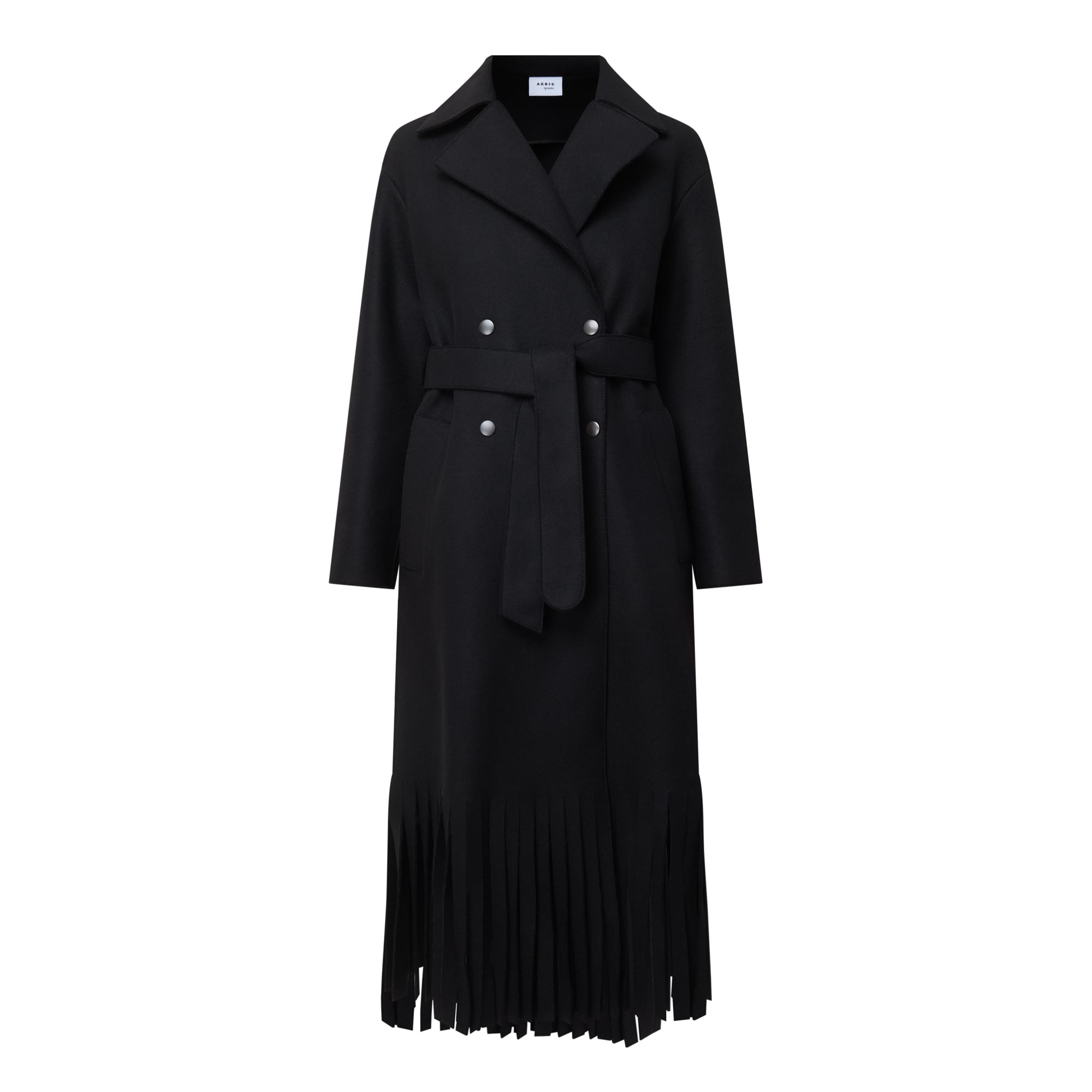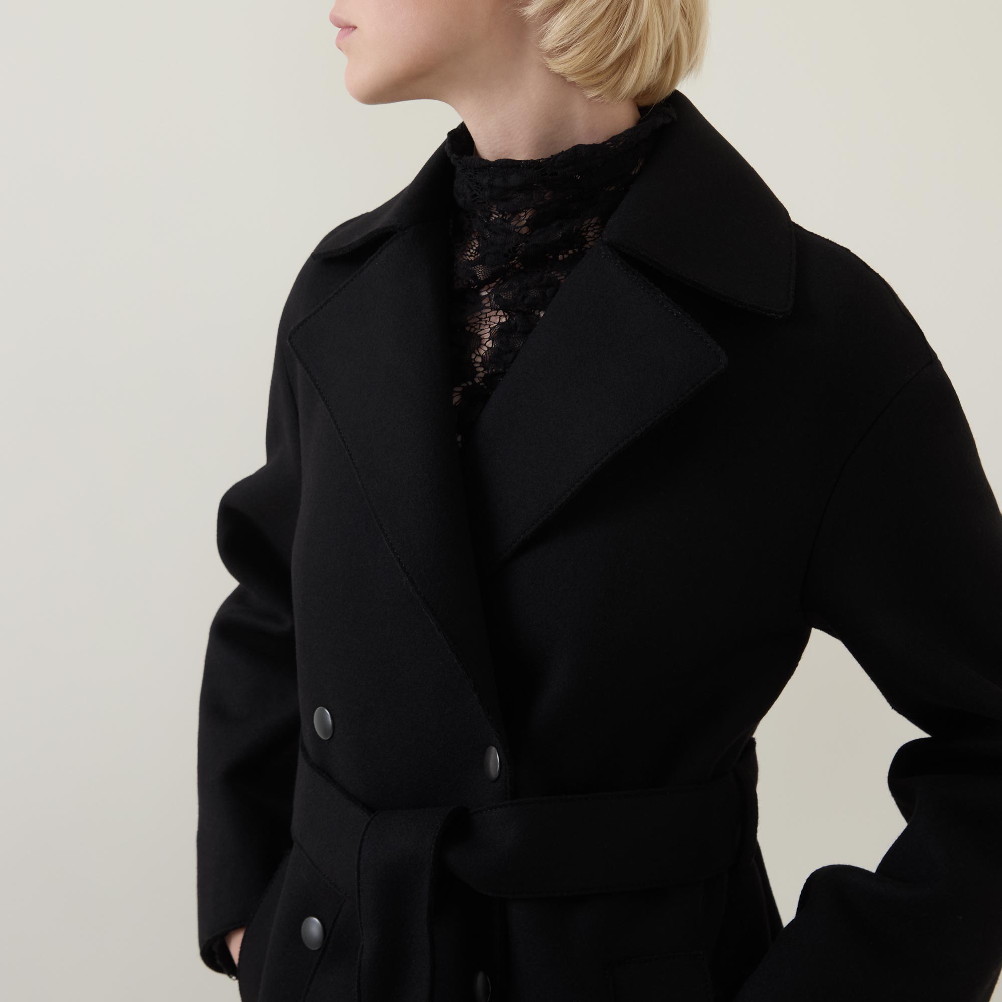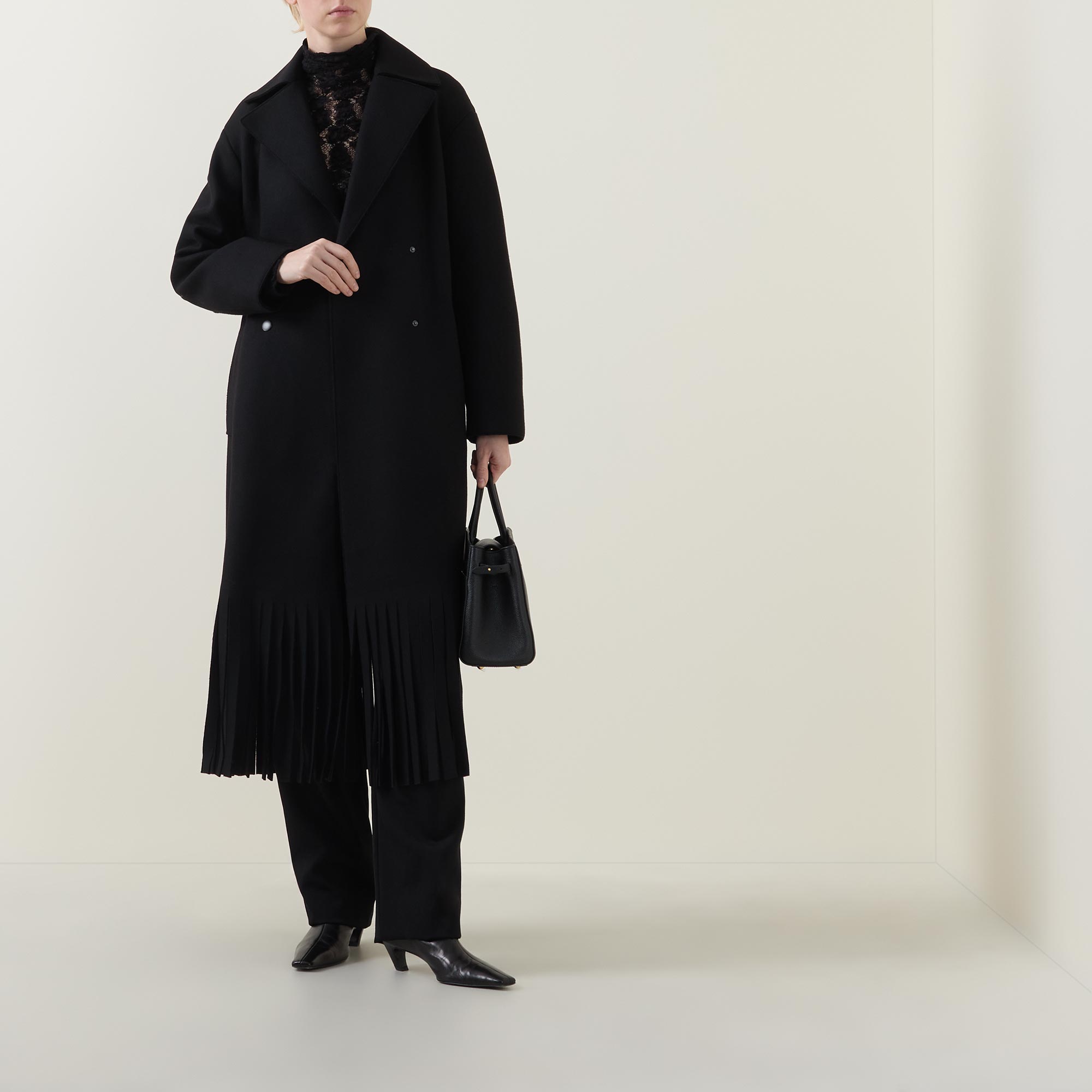 • Notched-lapel collar, double-breasted front, long sleeves, dropped shoulders, tonal button fastenings, belt loops, self-fabric tie-fastening belt, two side in-seam pockets, tape-fringe lasercut hem