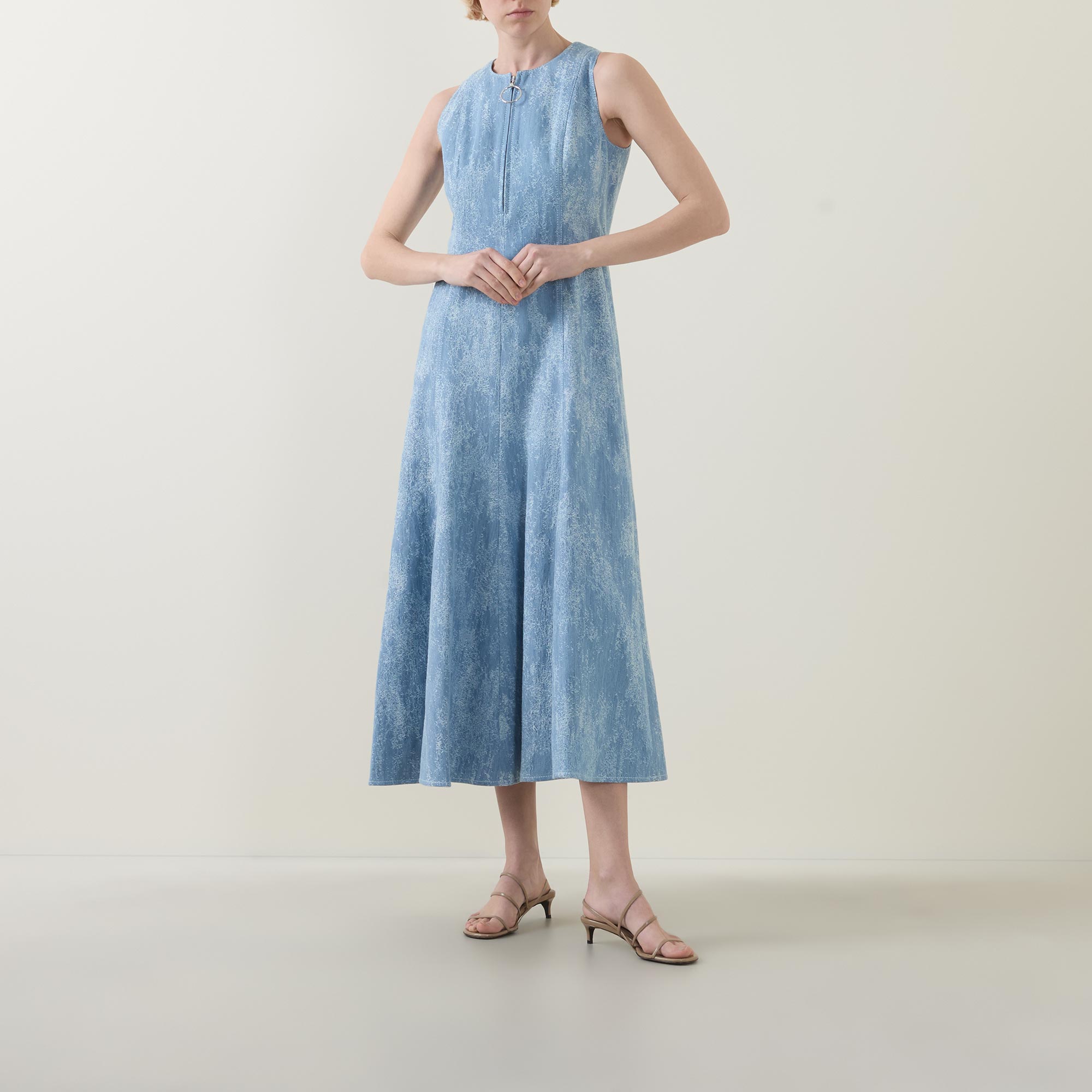 - Round neck, half placket with zip fastening, sleeveless design, fitted through the waist, flared skirt, jacquard design, midi length