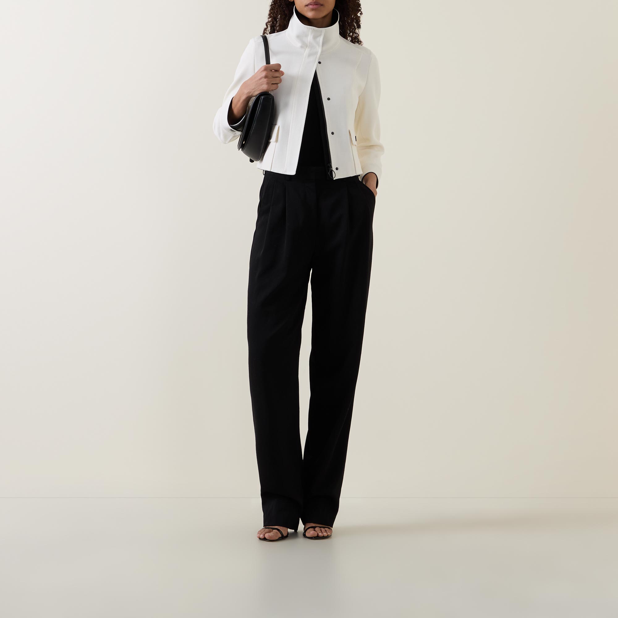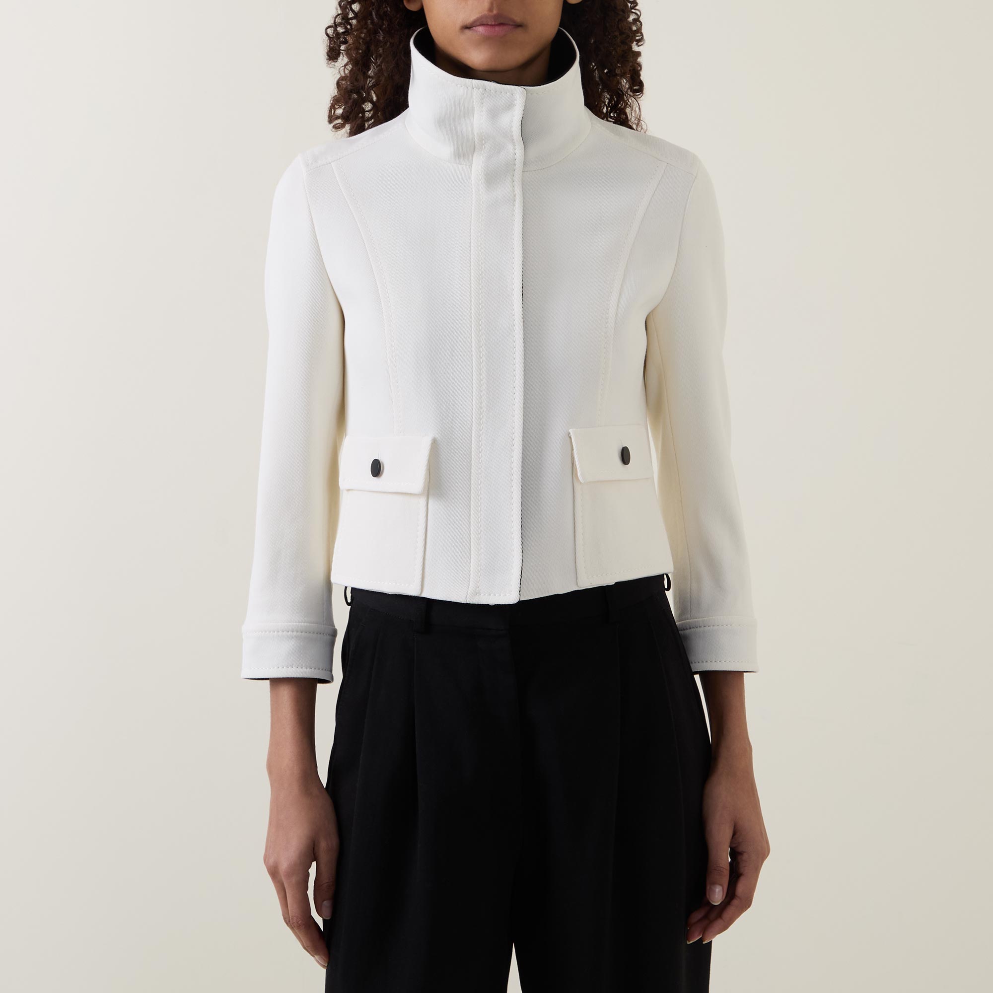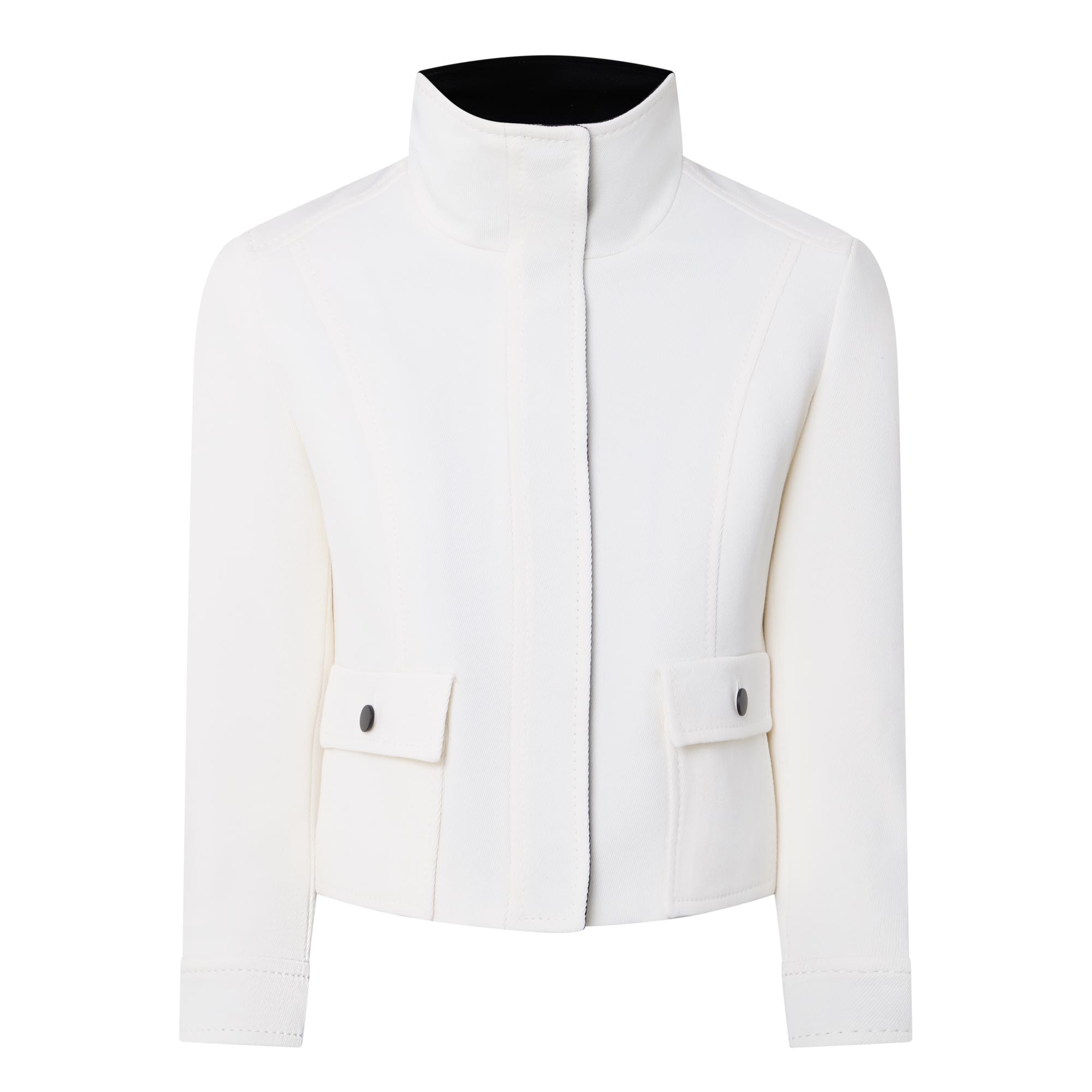 • Stand-up collar, long sleeves, concealed snap-button placket, two side flap pockets with button fastenings, inverted seams, single-button cuffs, smooth fabric
