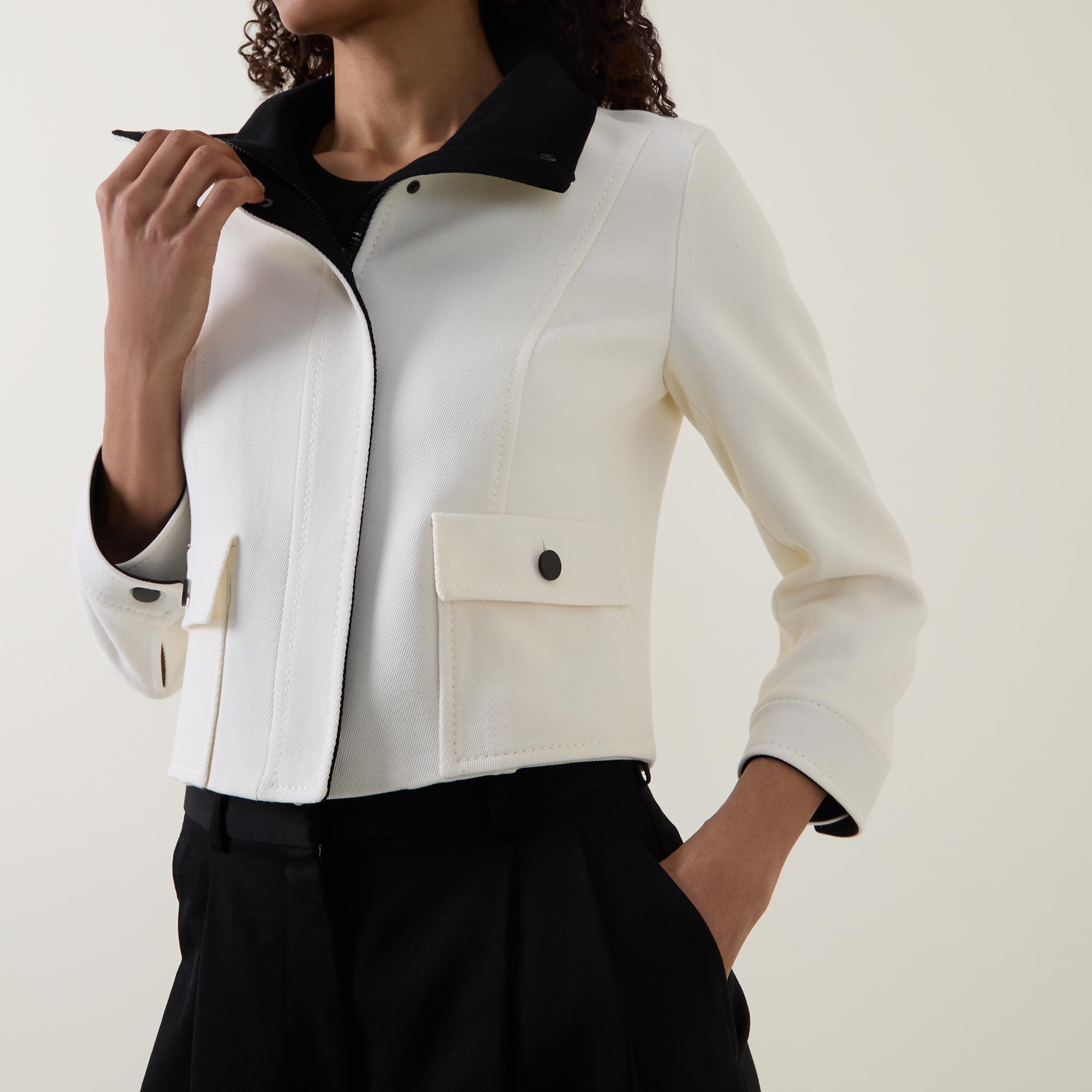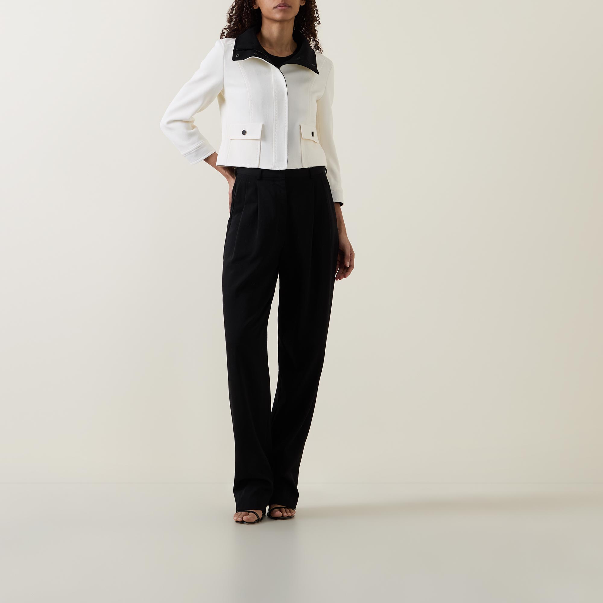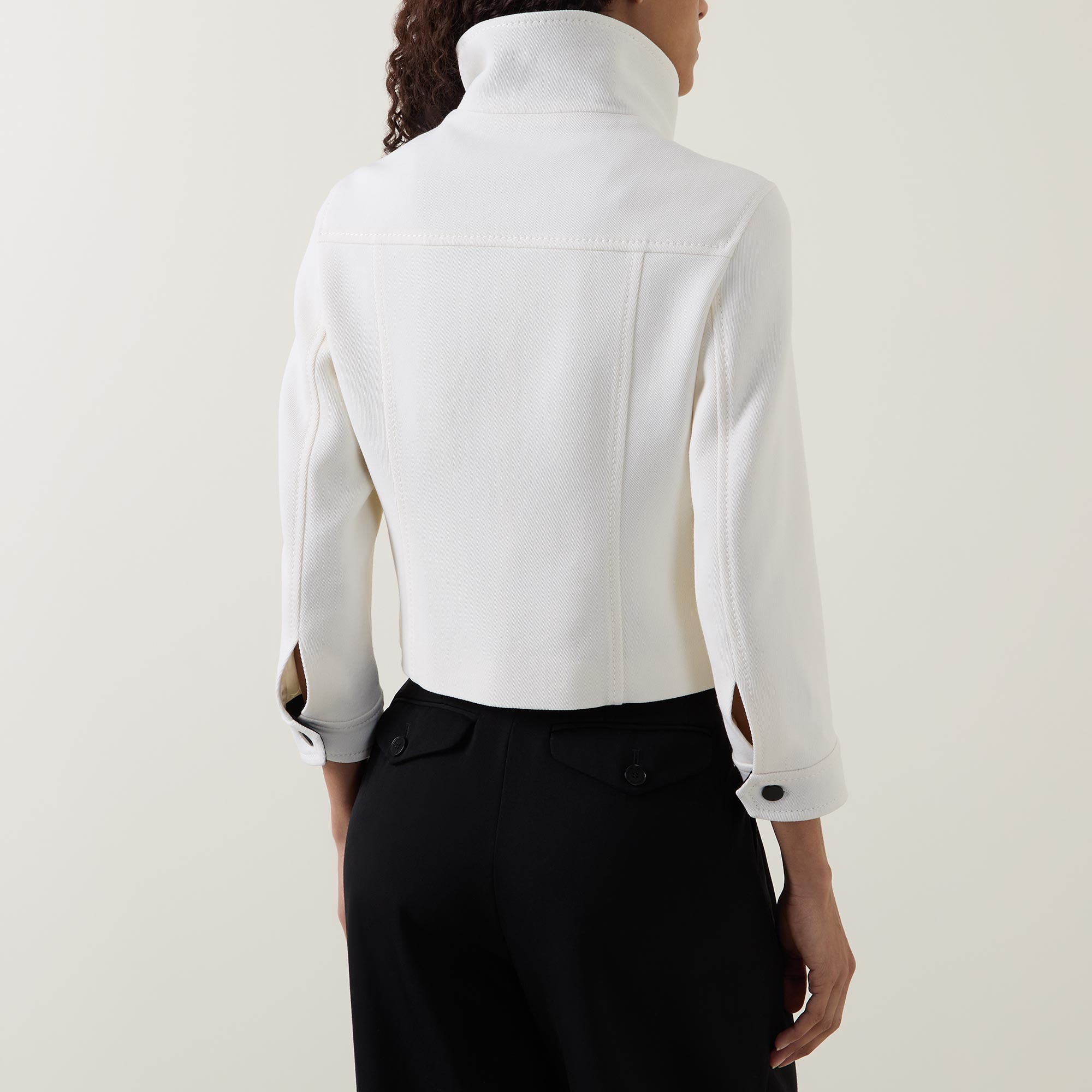 • Stand-up collar, long sleeves, concealed snap-button placket, two side flap pockets with button fastenings, inverted seams, single-button cuffs, smooth fabric