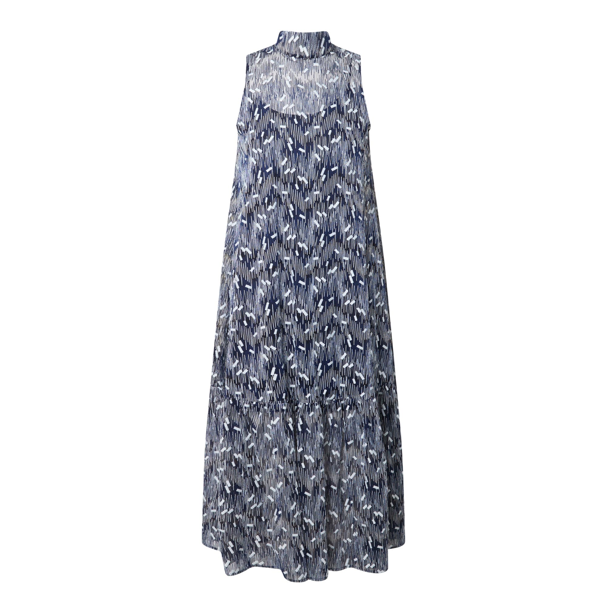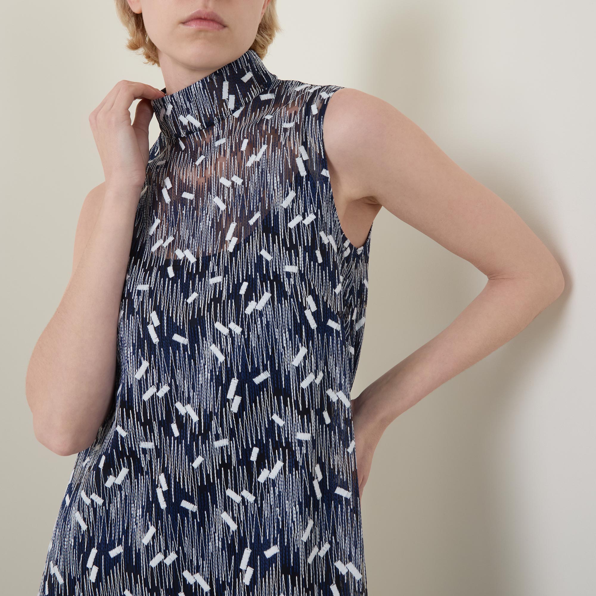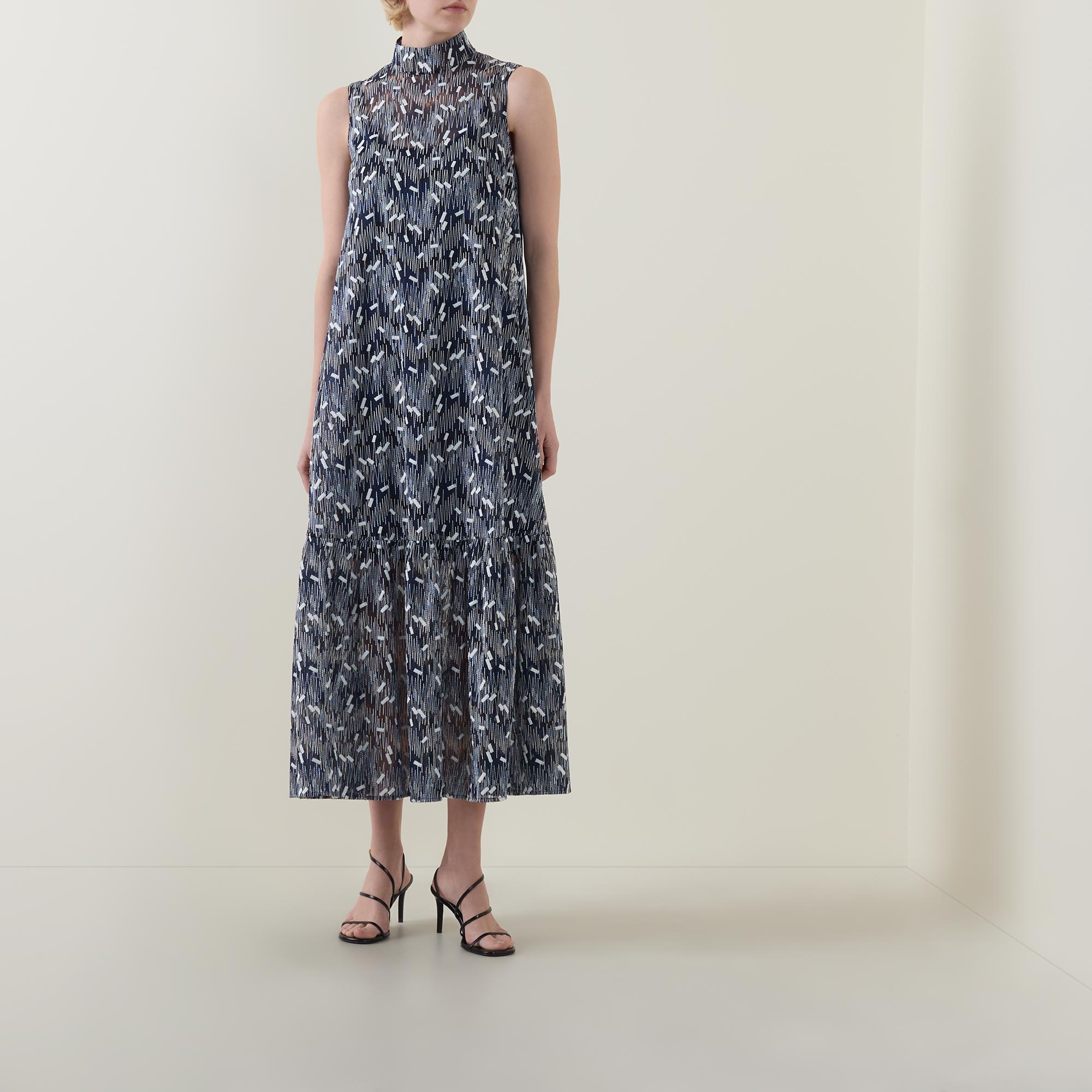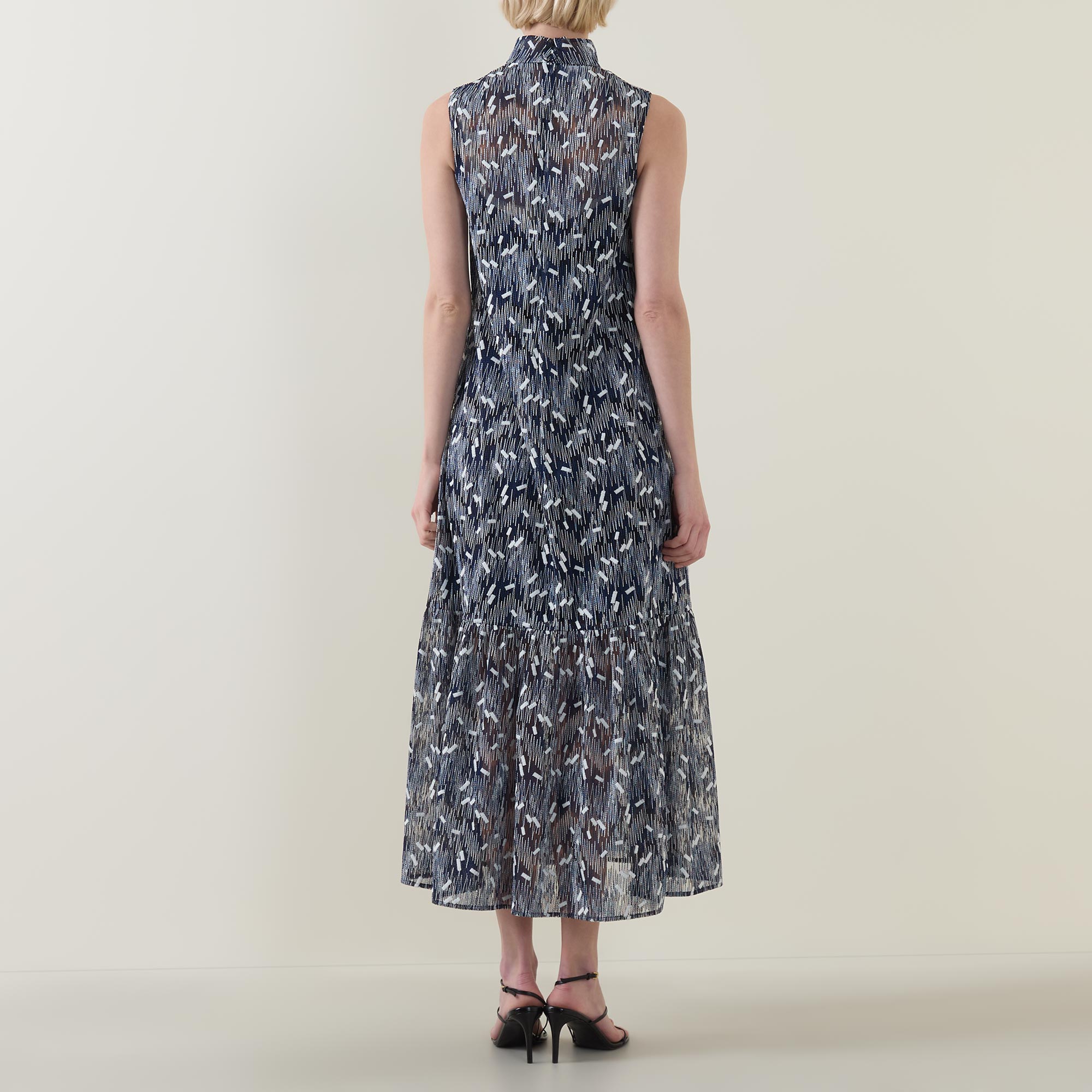- Stand collar, sleeveless design, rear zip fastening, flared design, dropped waistline, straight hem, embroidered detailing, midi length