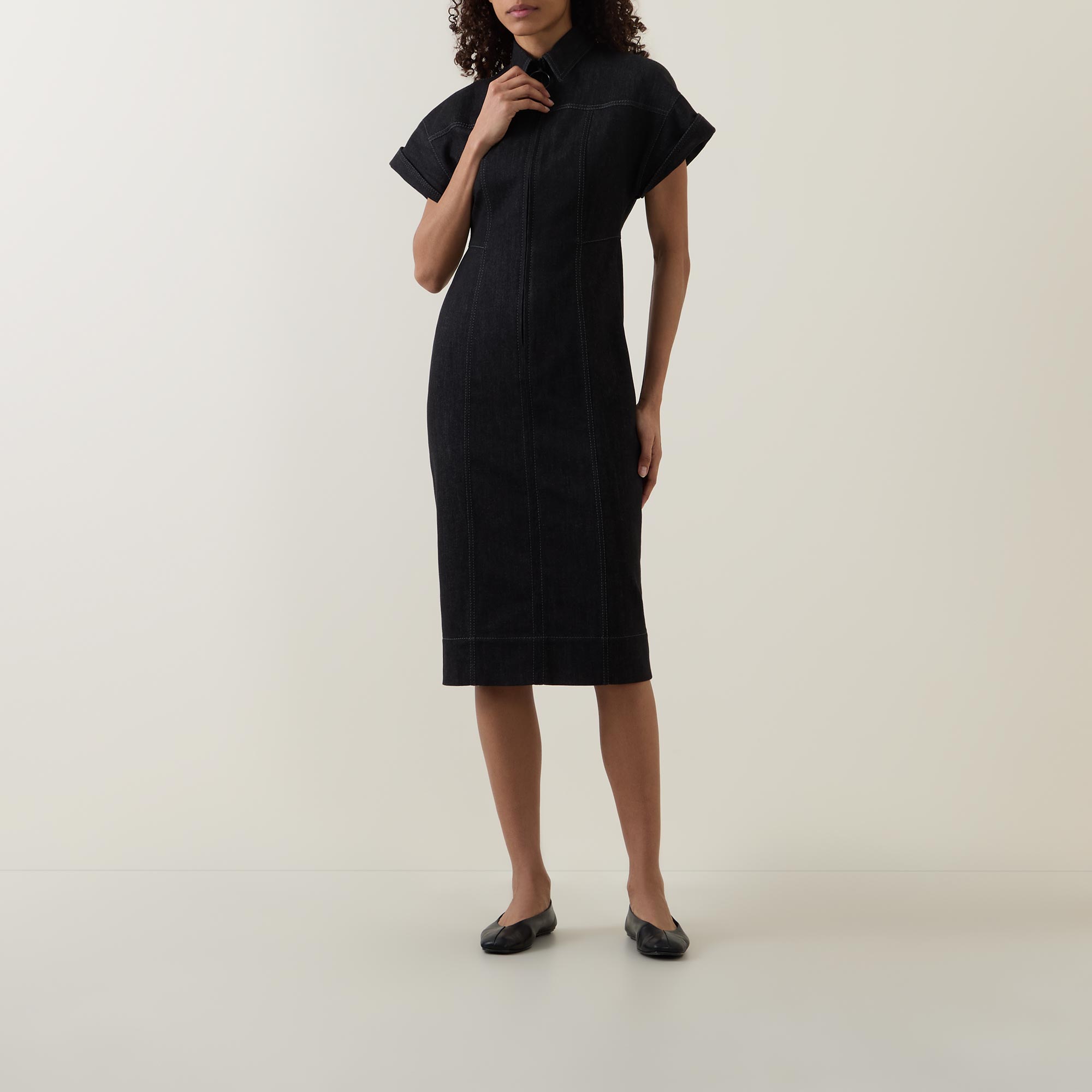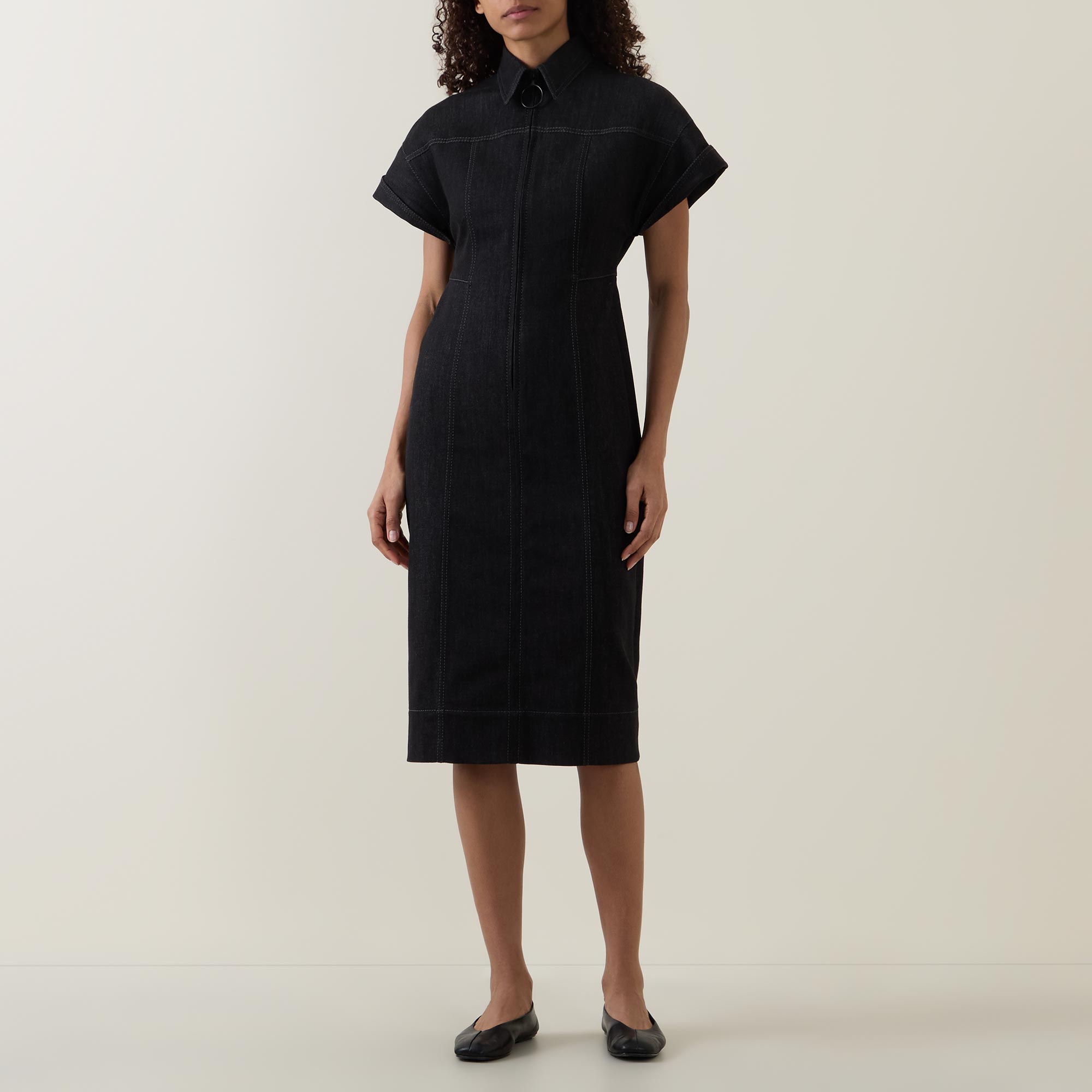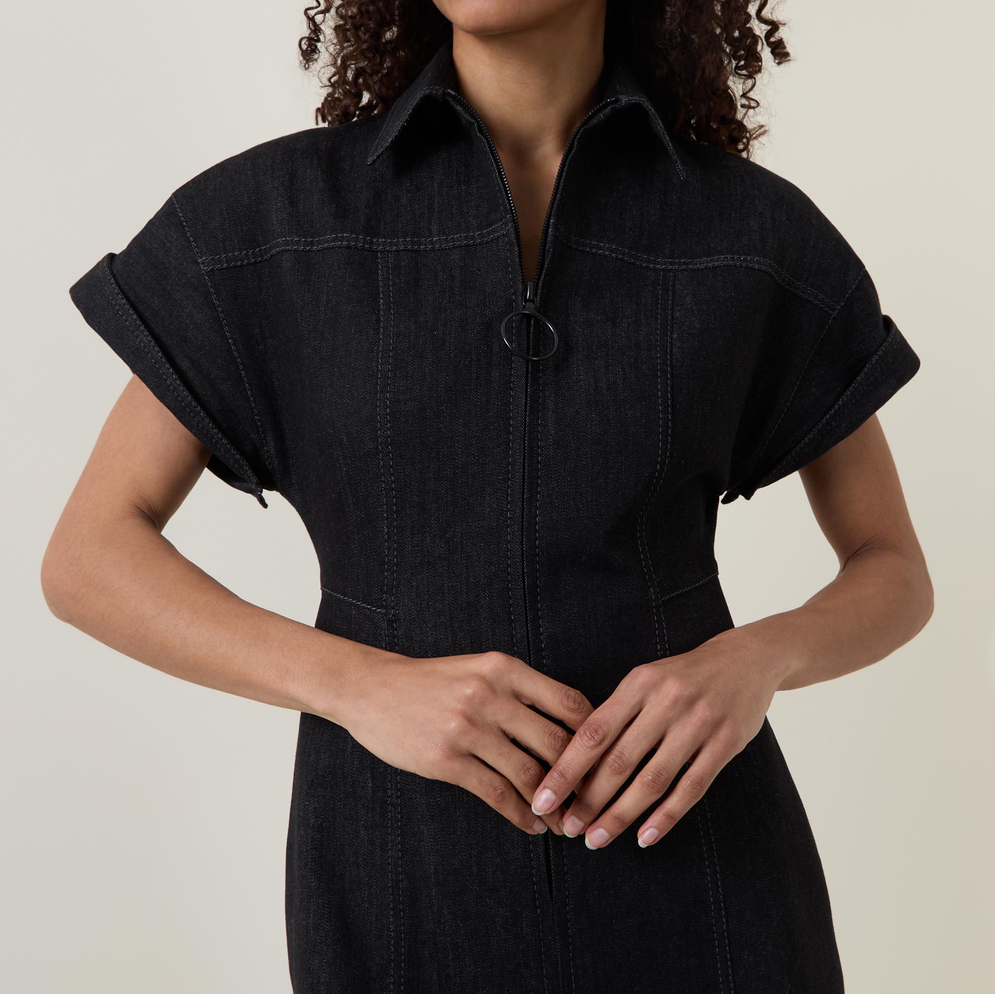 • Point collar, short sleeves, turned-up cuffs, full zip-through fastening, tonal stitching, fitted silhouette, smooth denim finish