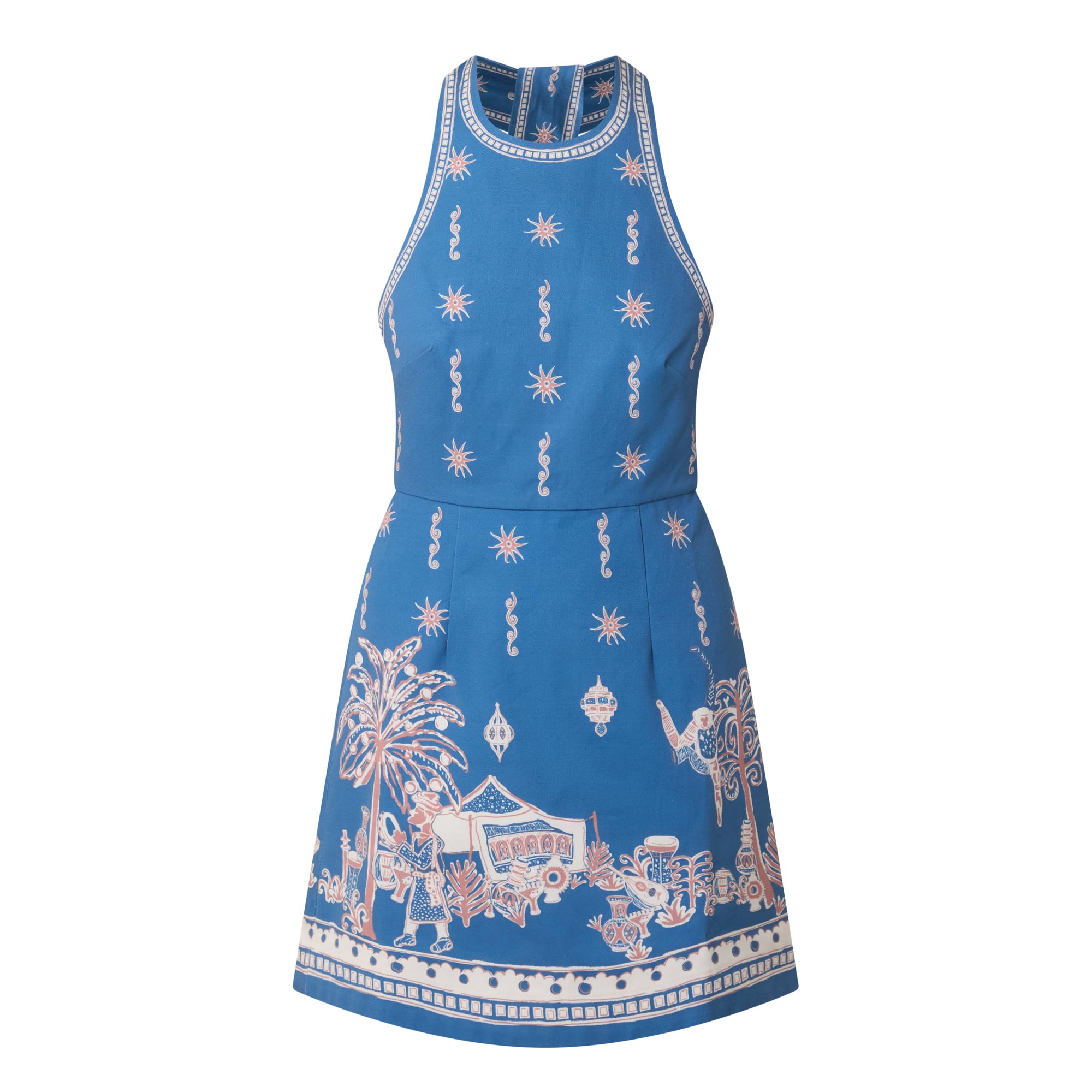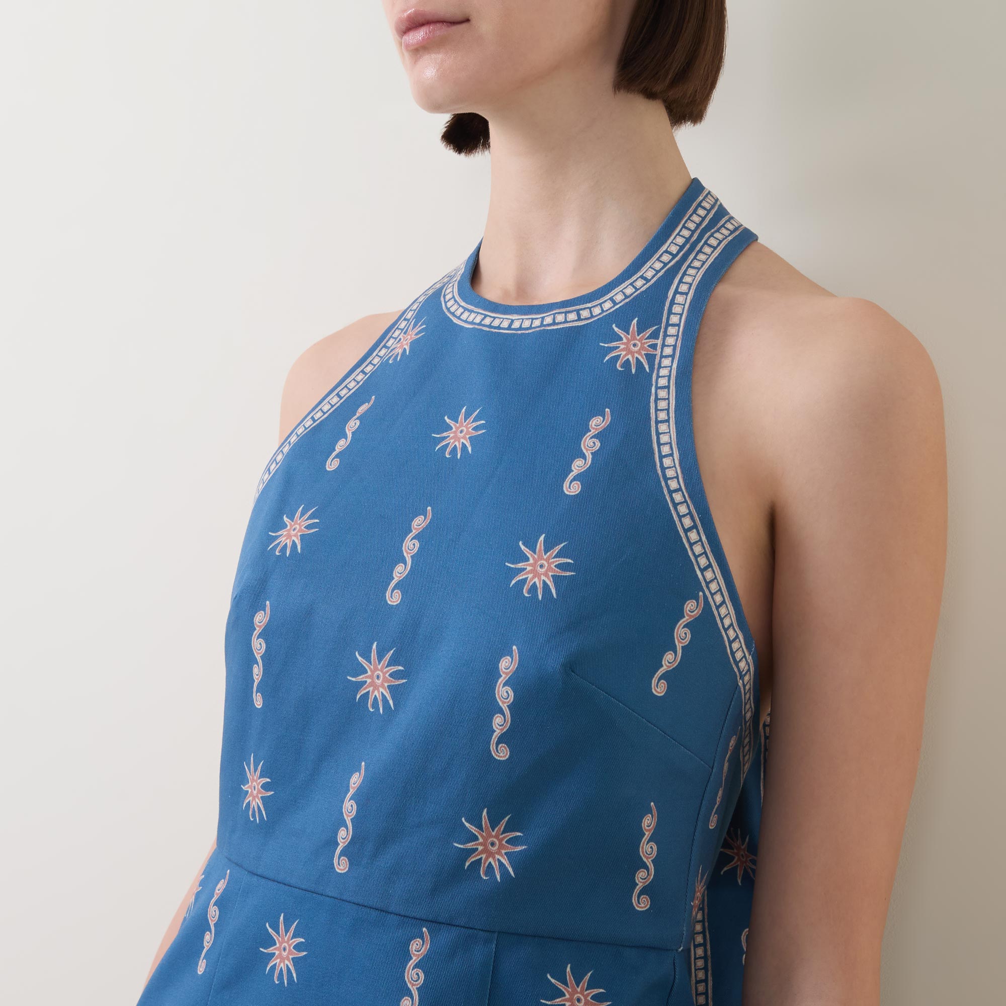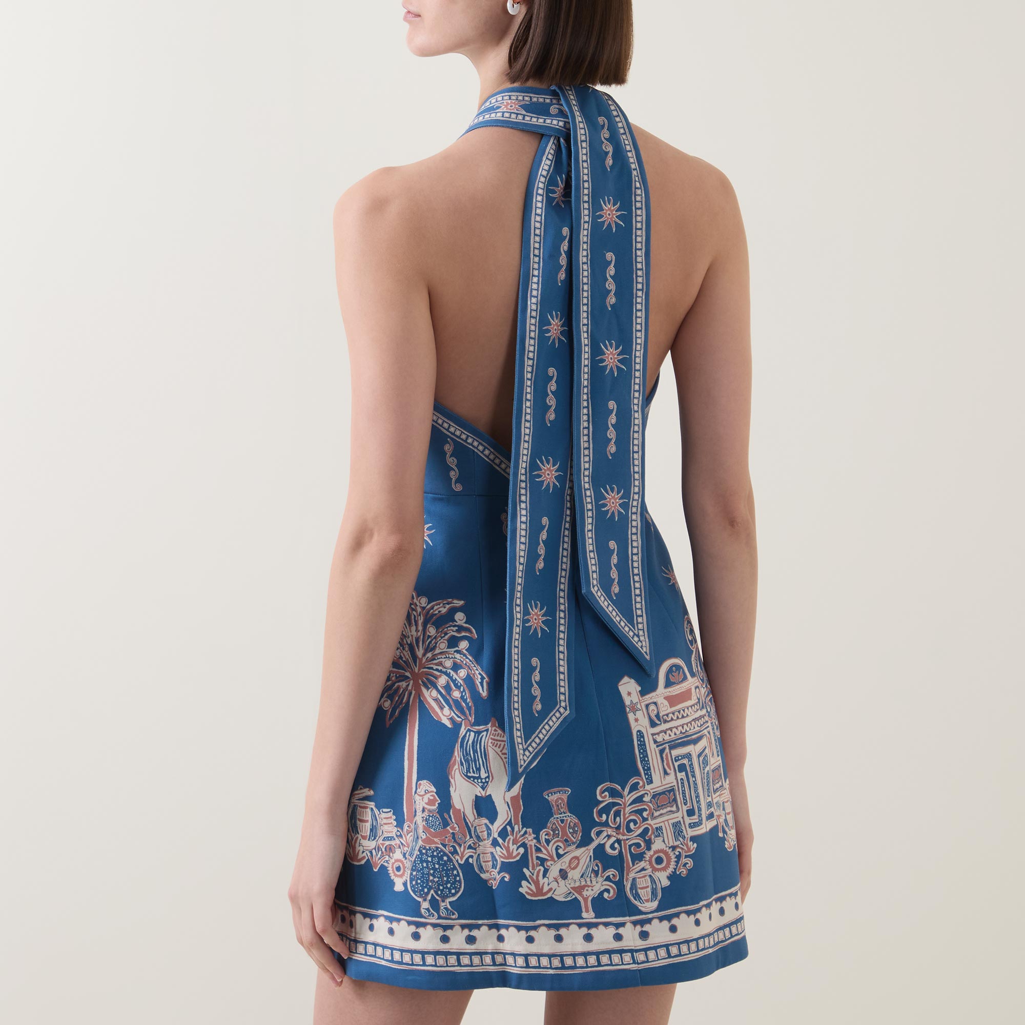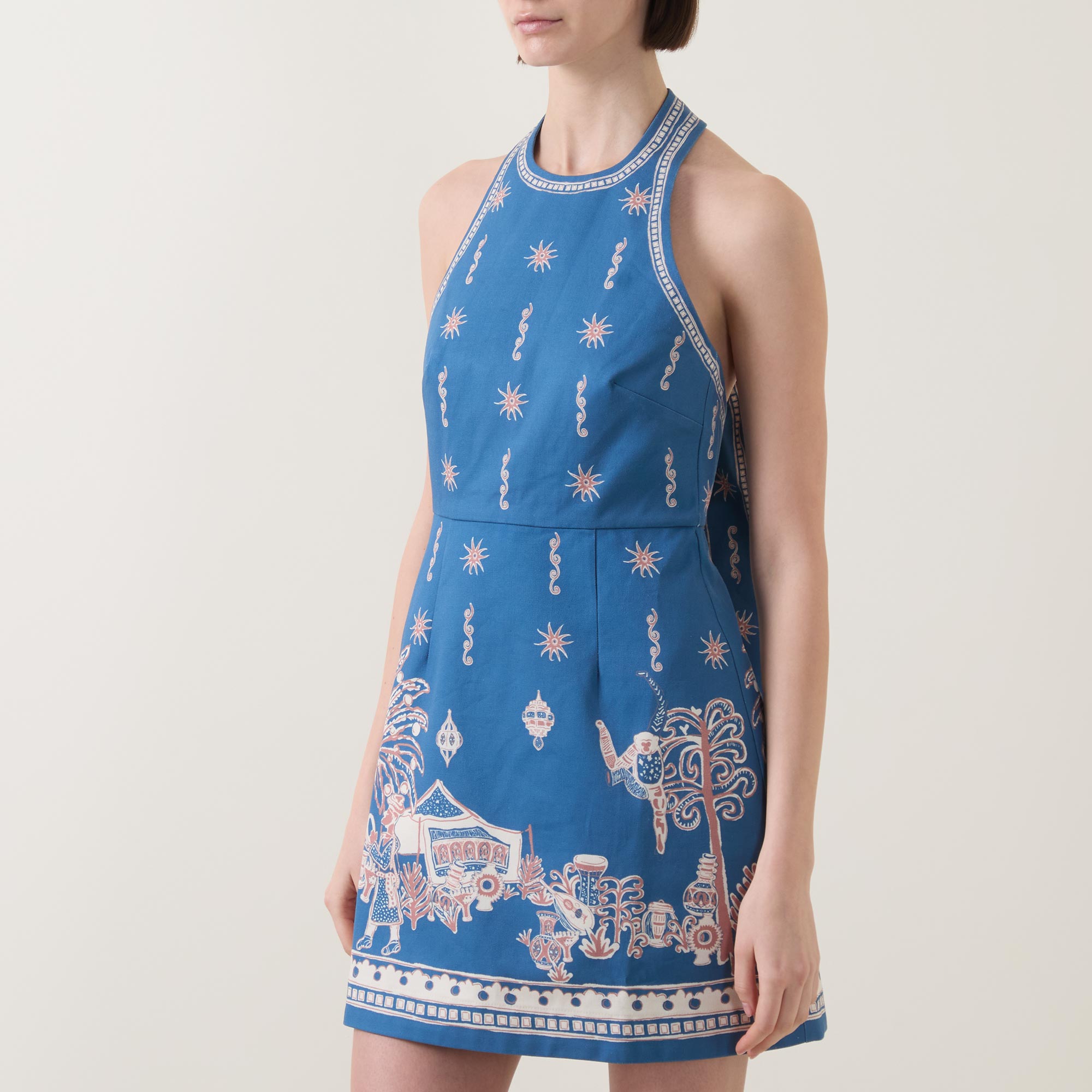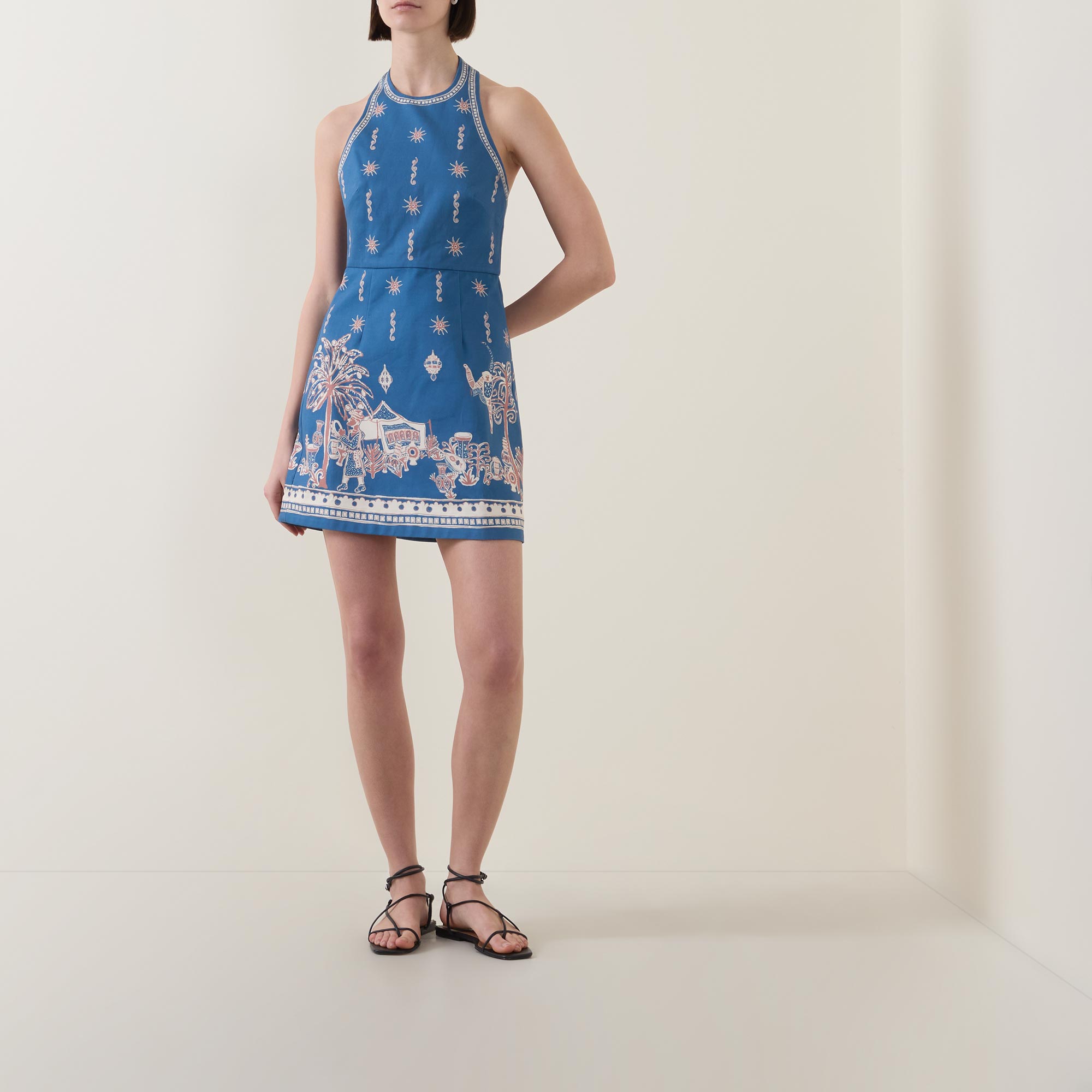 • Halterneck with self tie fastening, sleeveless design, concealed zip fastening, fitted through the waist, flared skirt, straight hem, printed design, mini length