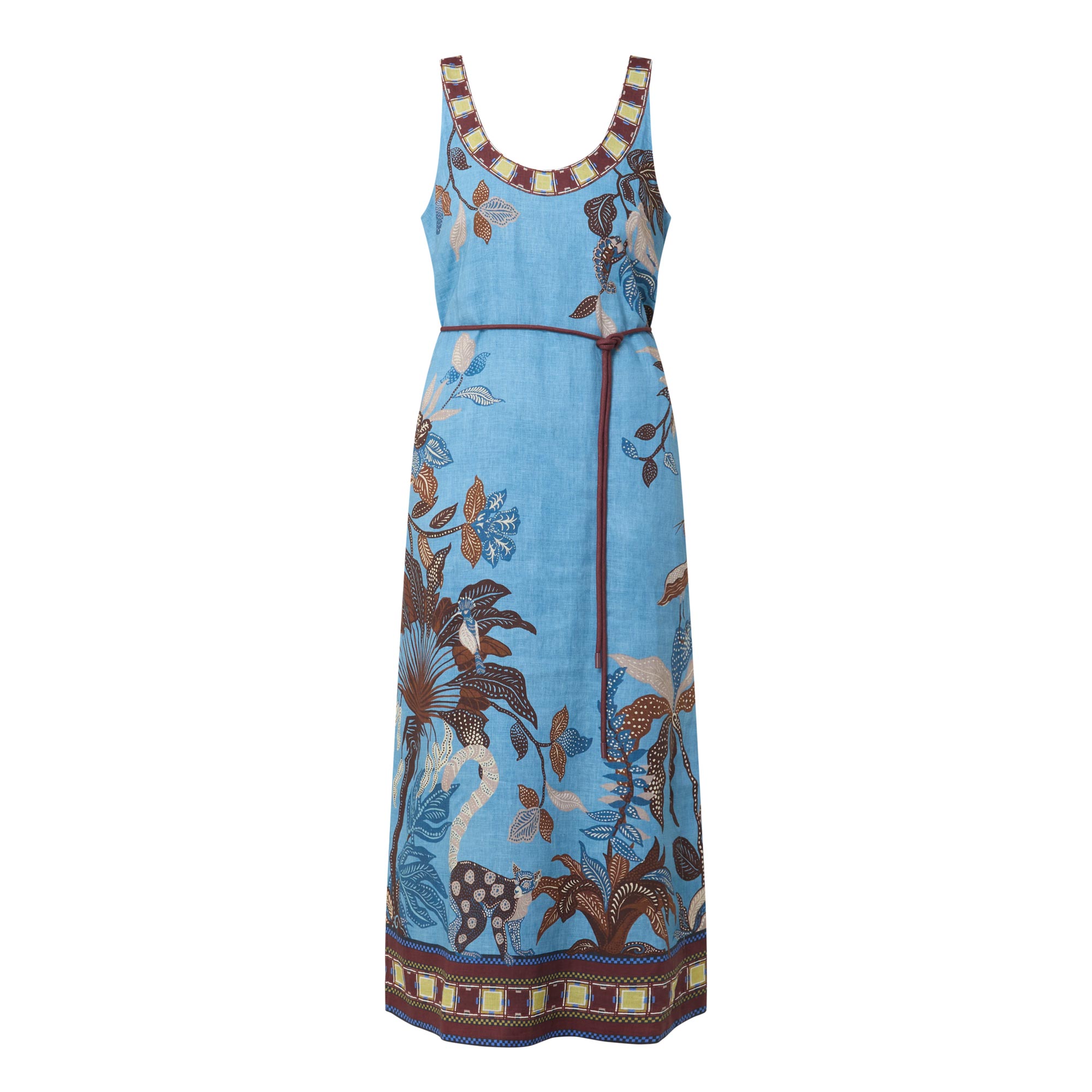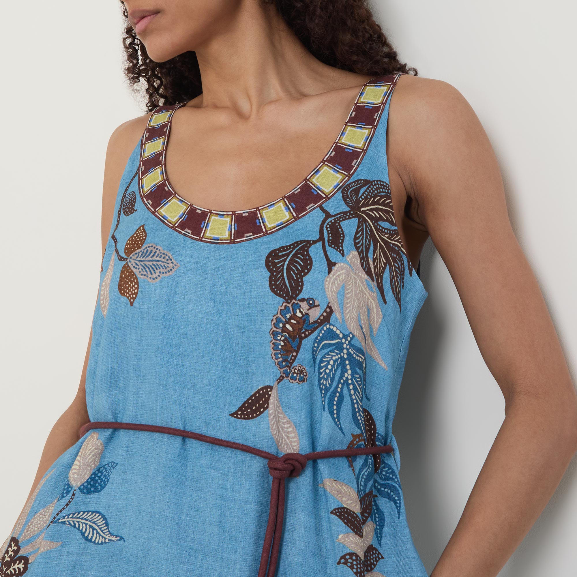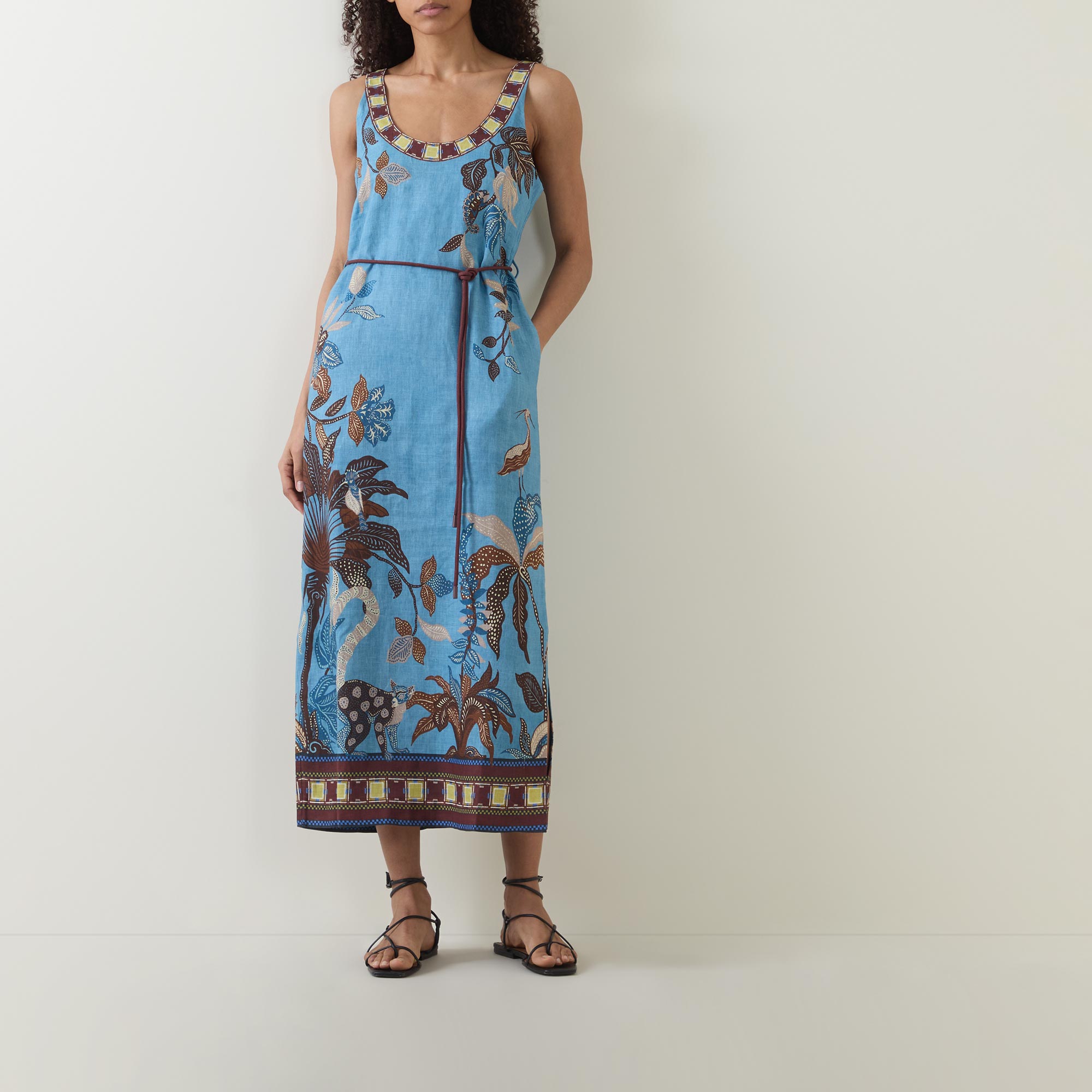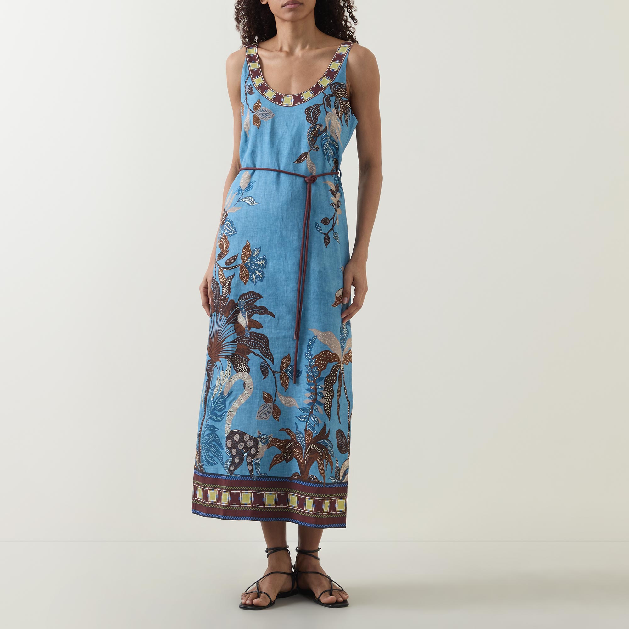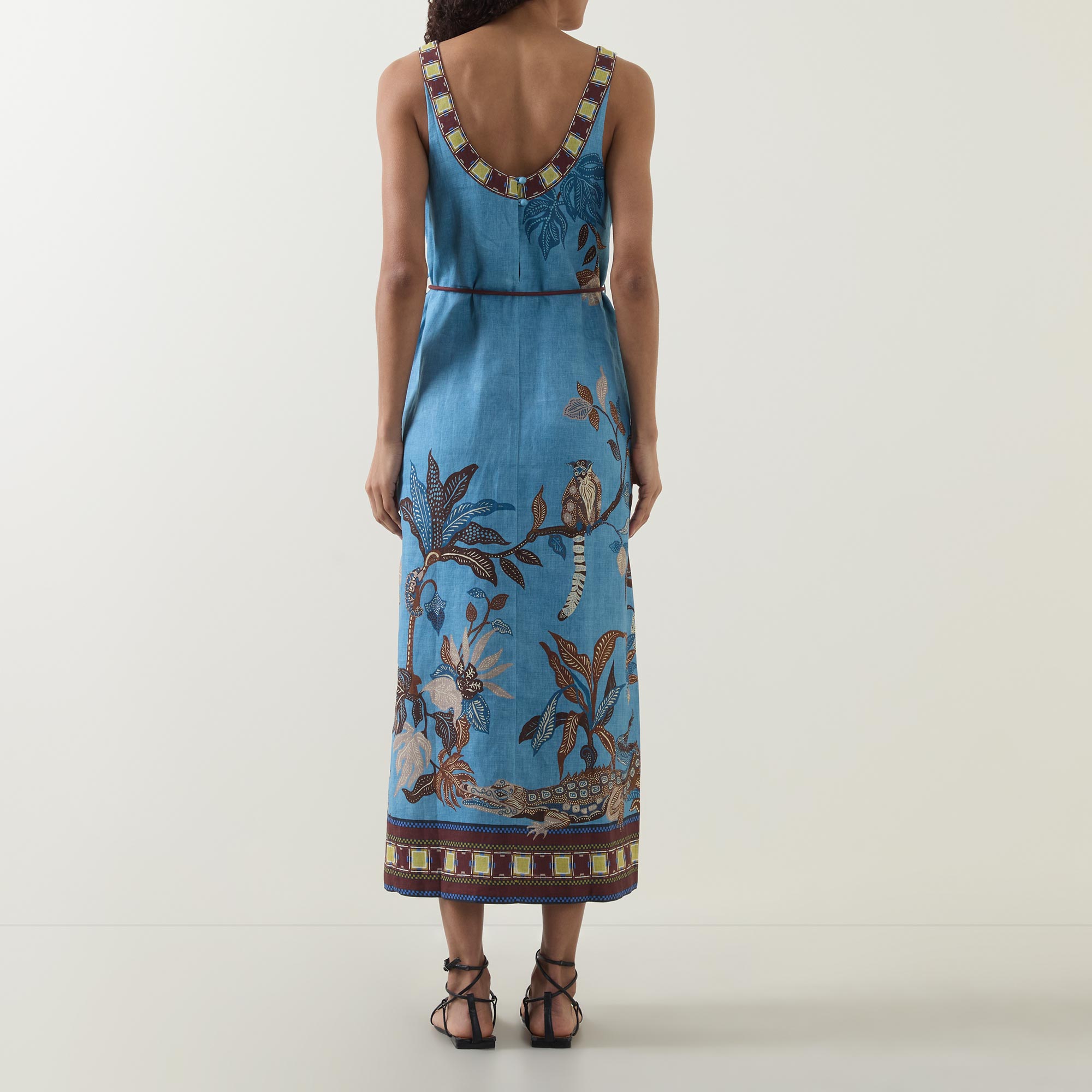 - Midi length, scoop neckline, fixed straps, button and loop fastening to the back, self-covered rouleau belt with toggle details, slit to the side, floral details, contrast hem