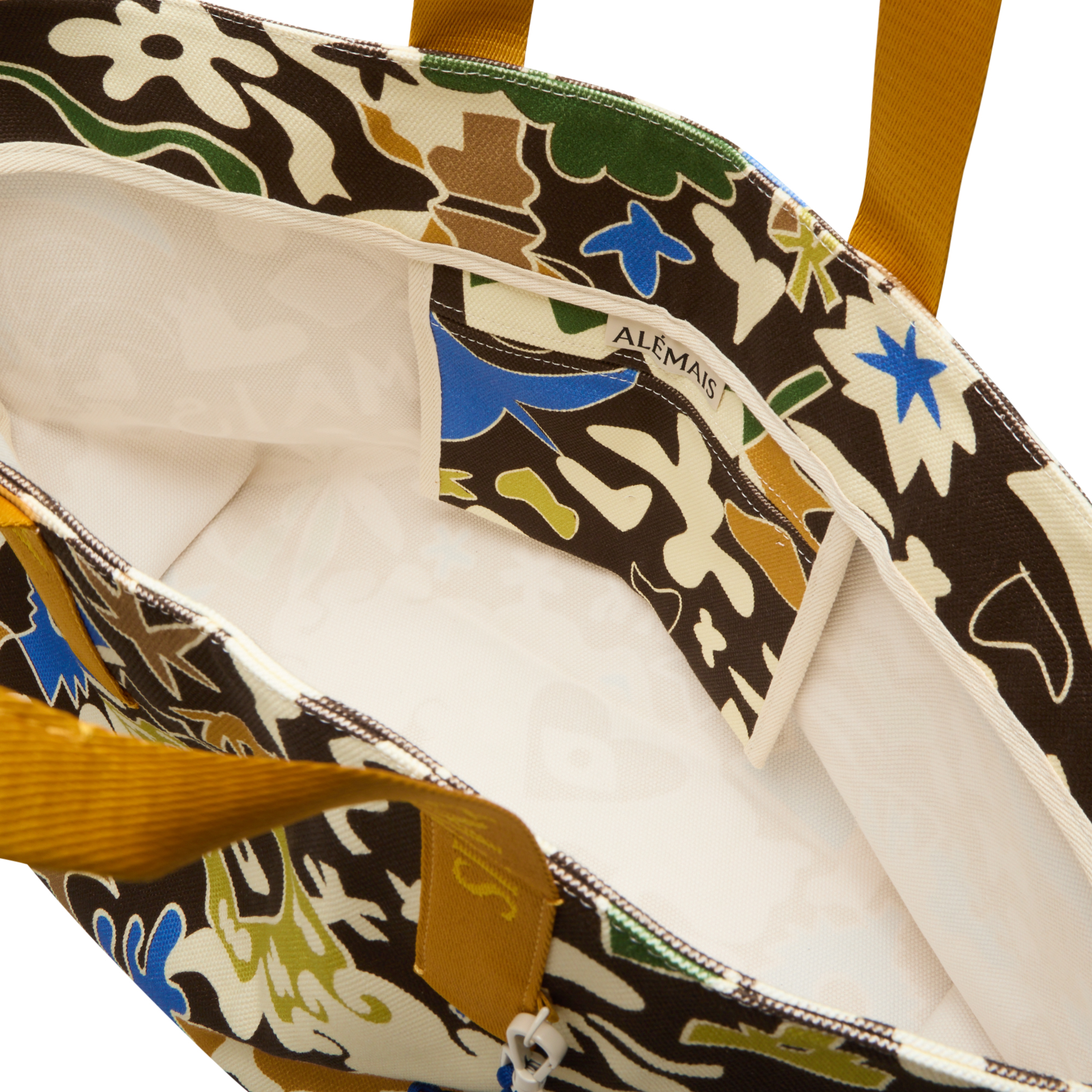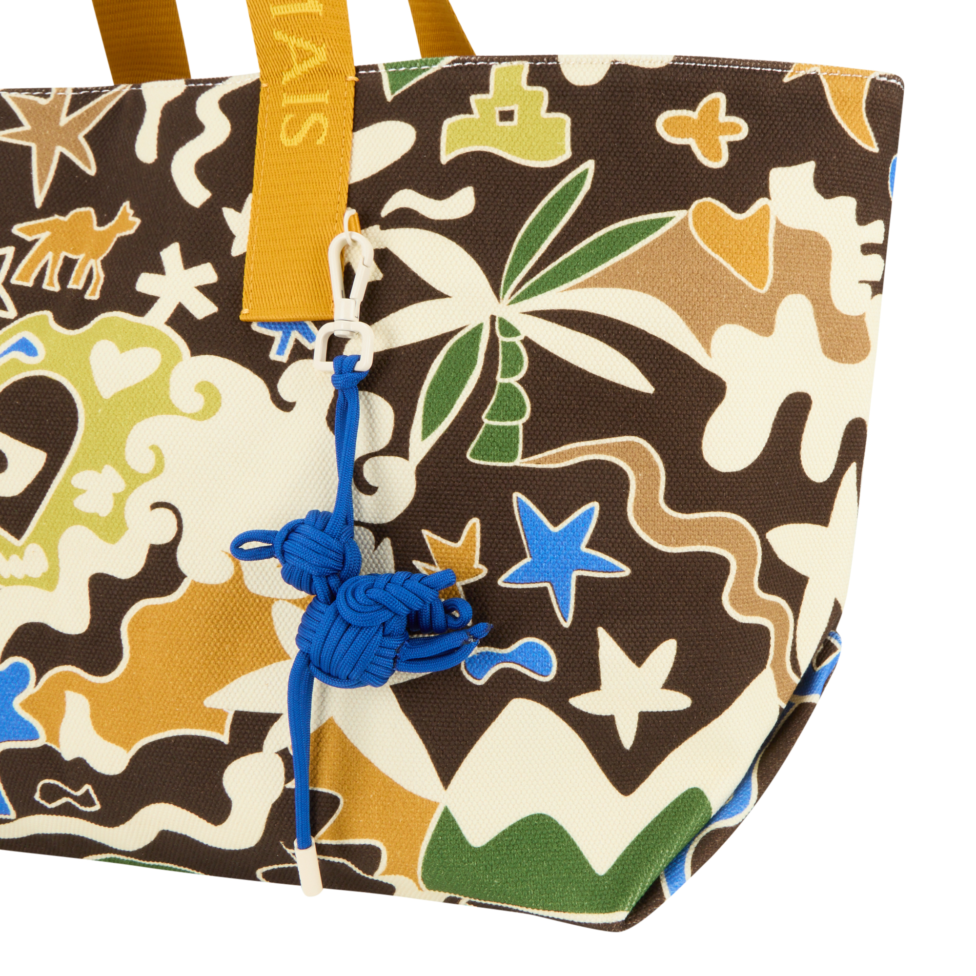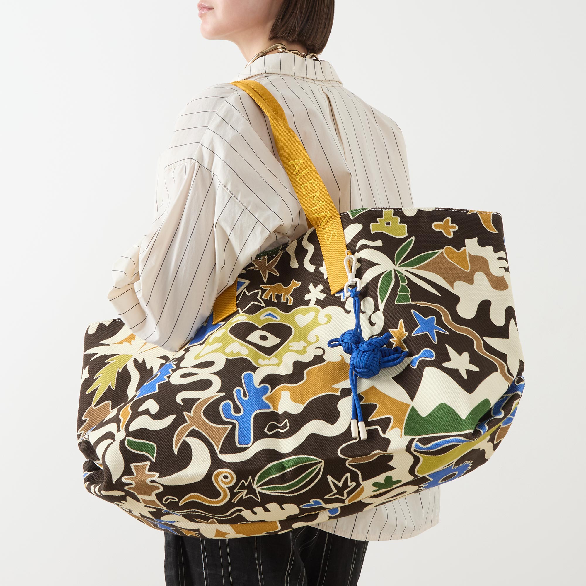 - Two logo webbed shoulder straps, open top design, woven jacquard pattern, contrasting colours, detachable monkey charm, canvas finish