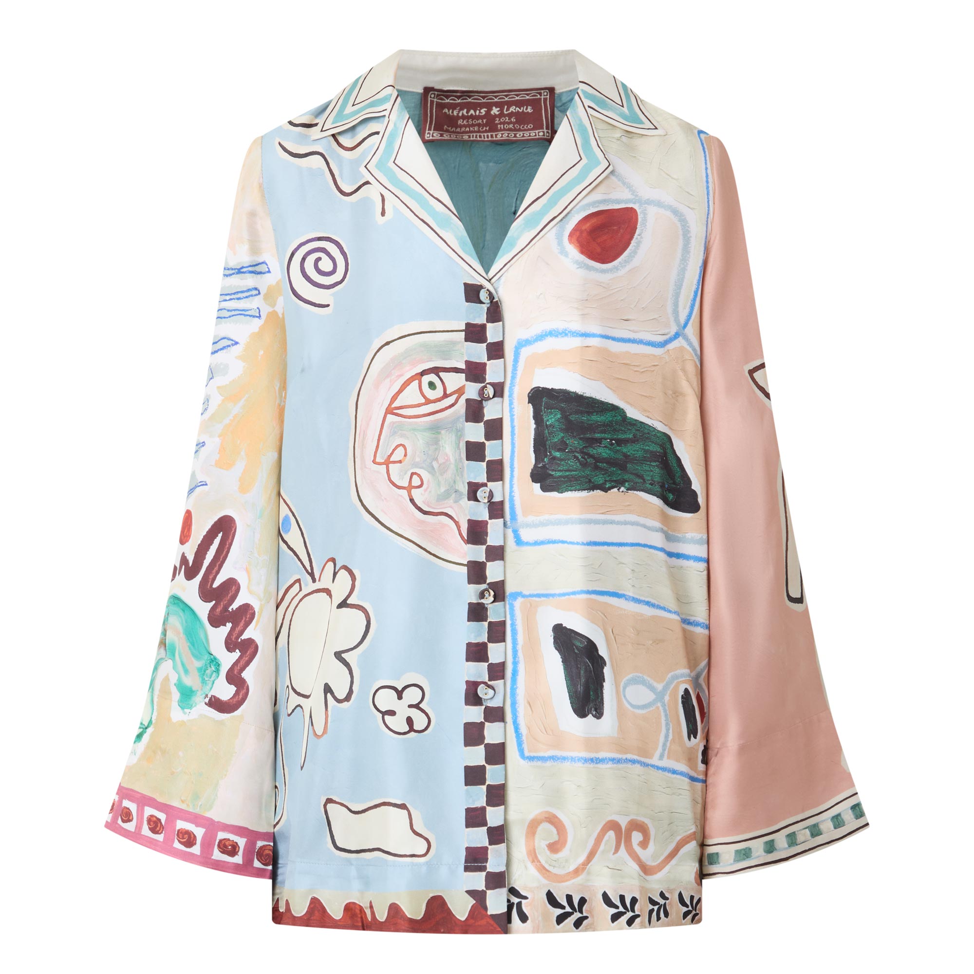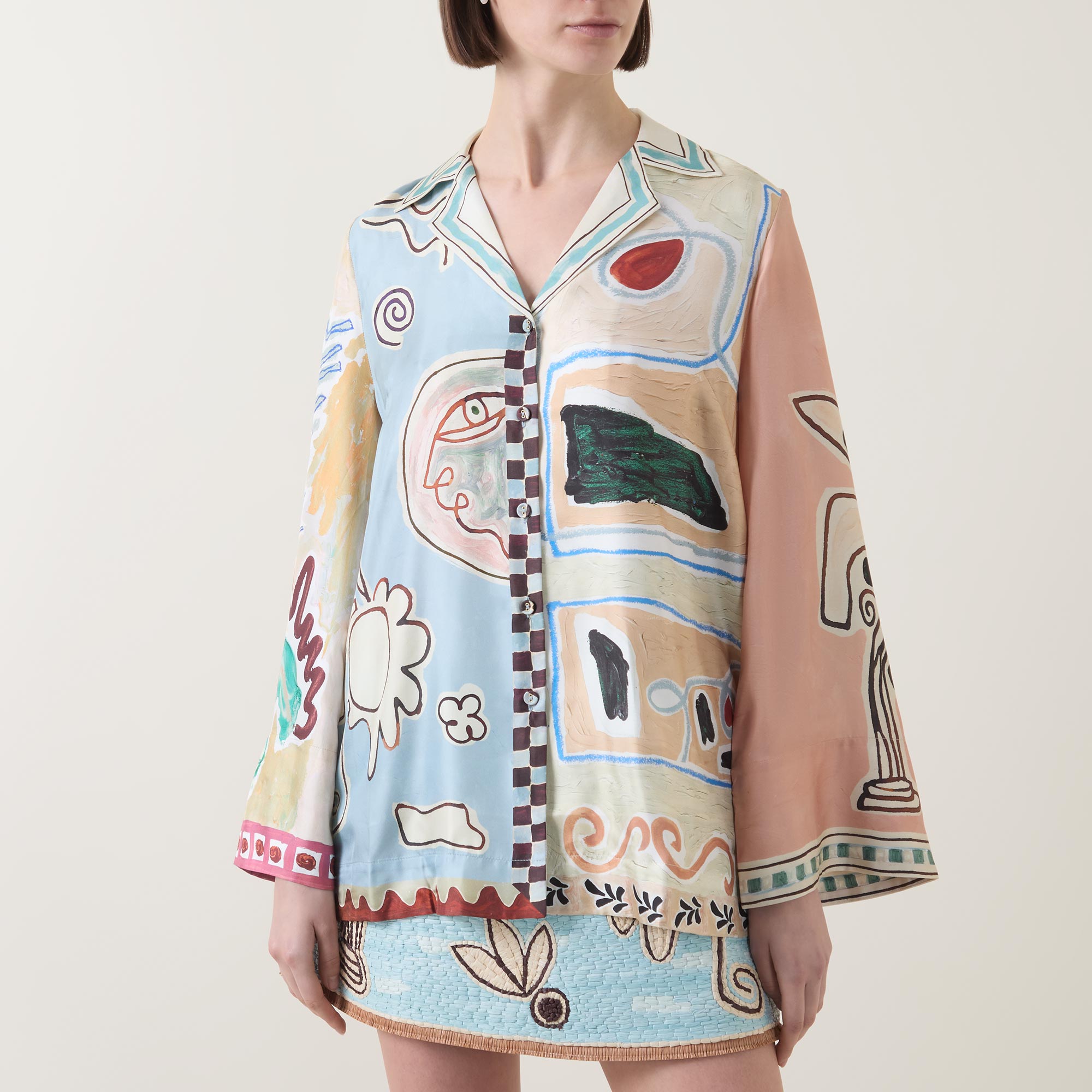 • Camp collar, wide long sleeves, front button fastening, straight hem, smooth finish, artwork in collaboration with Laurence Leenaert