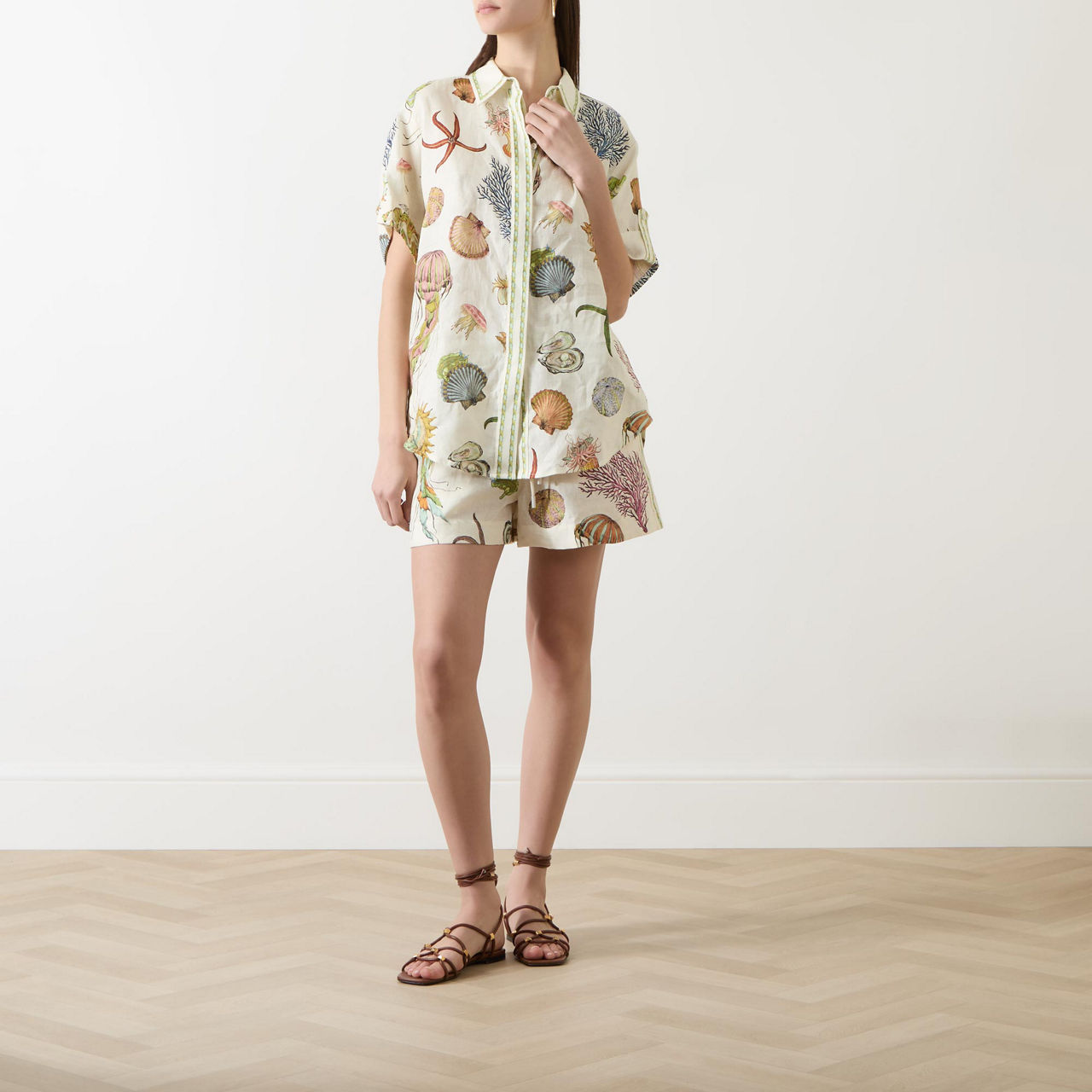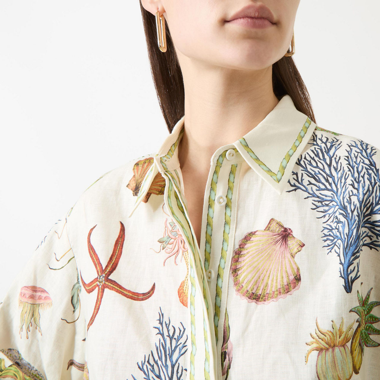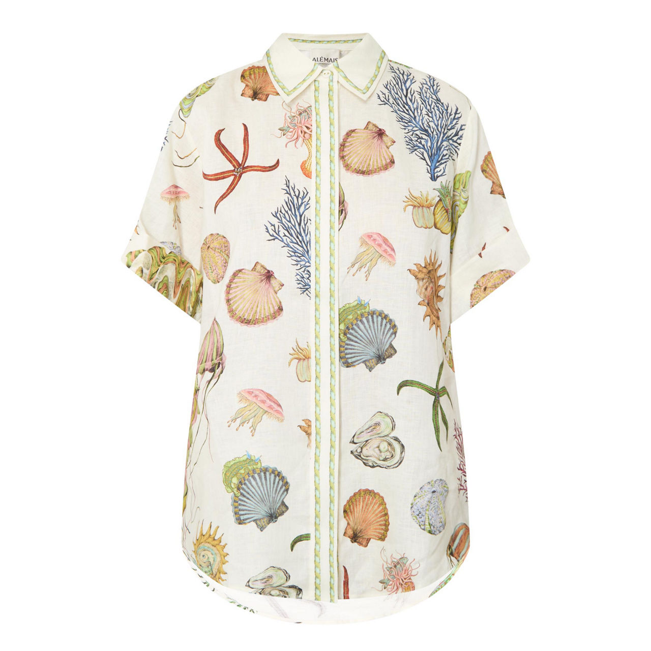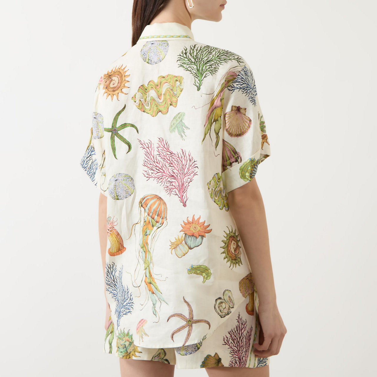 - Short sleeves, turned-up cuffs, pointed collar, concealed button placket, shell fish and sea printed design, curved hemline, smooth fabric