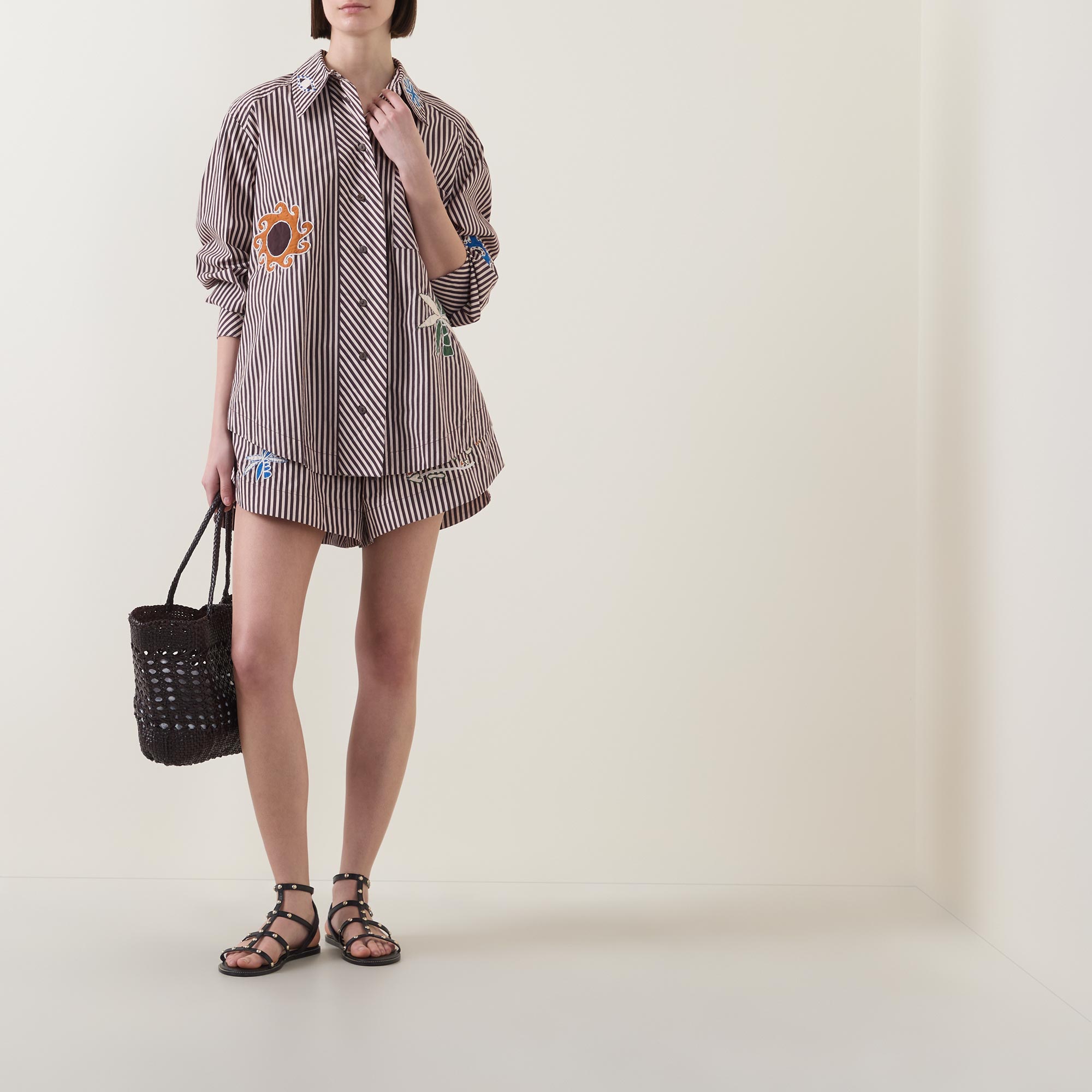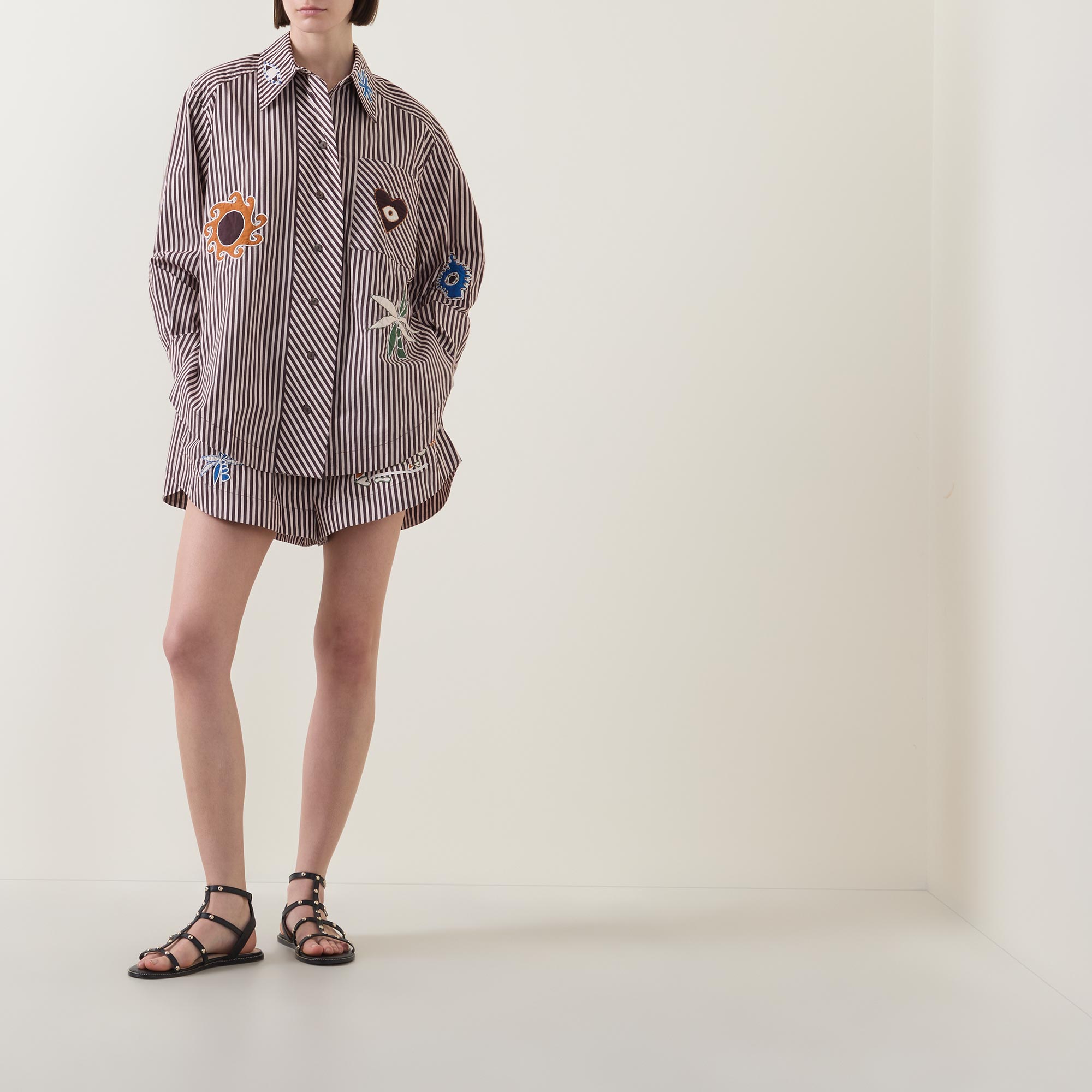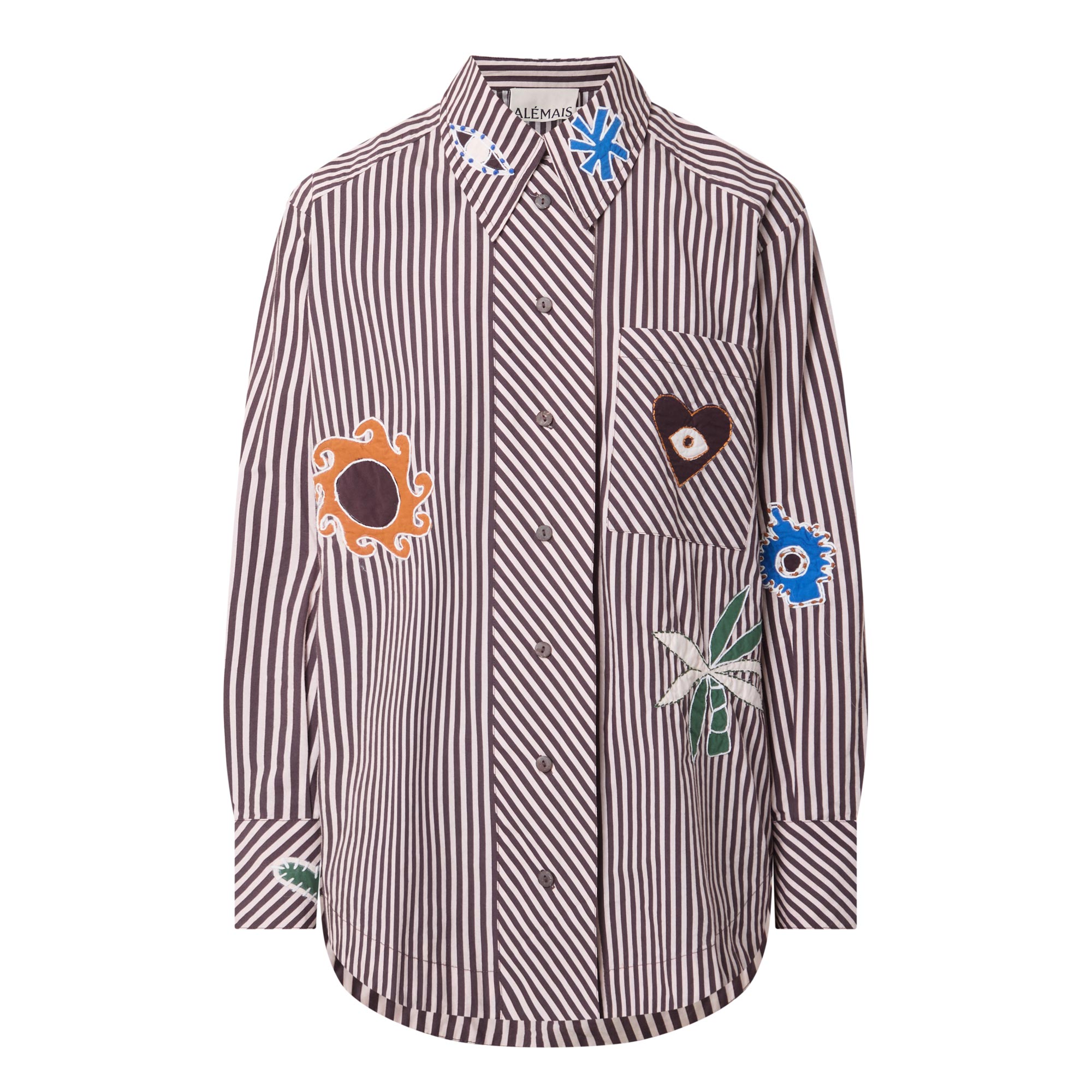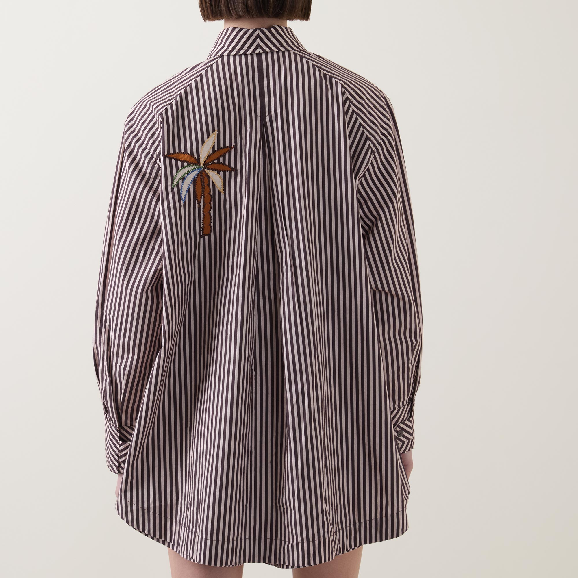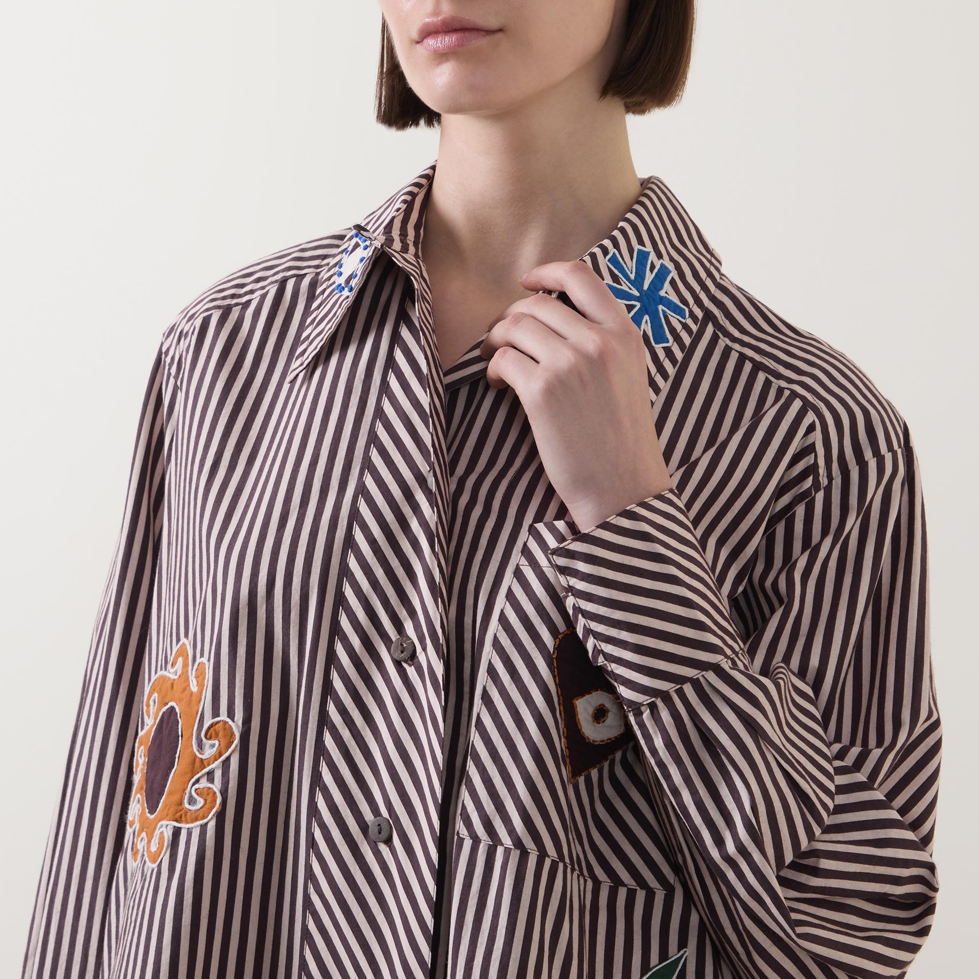 - Point collar, long sleeves, buttoned cuffs, one chest patch pocket, front button fastening, wide placket with coconut buttons, curved hem, striped pattern, embroidered motif detailing