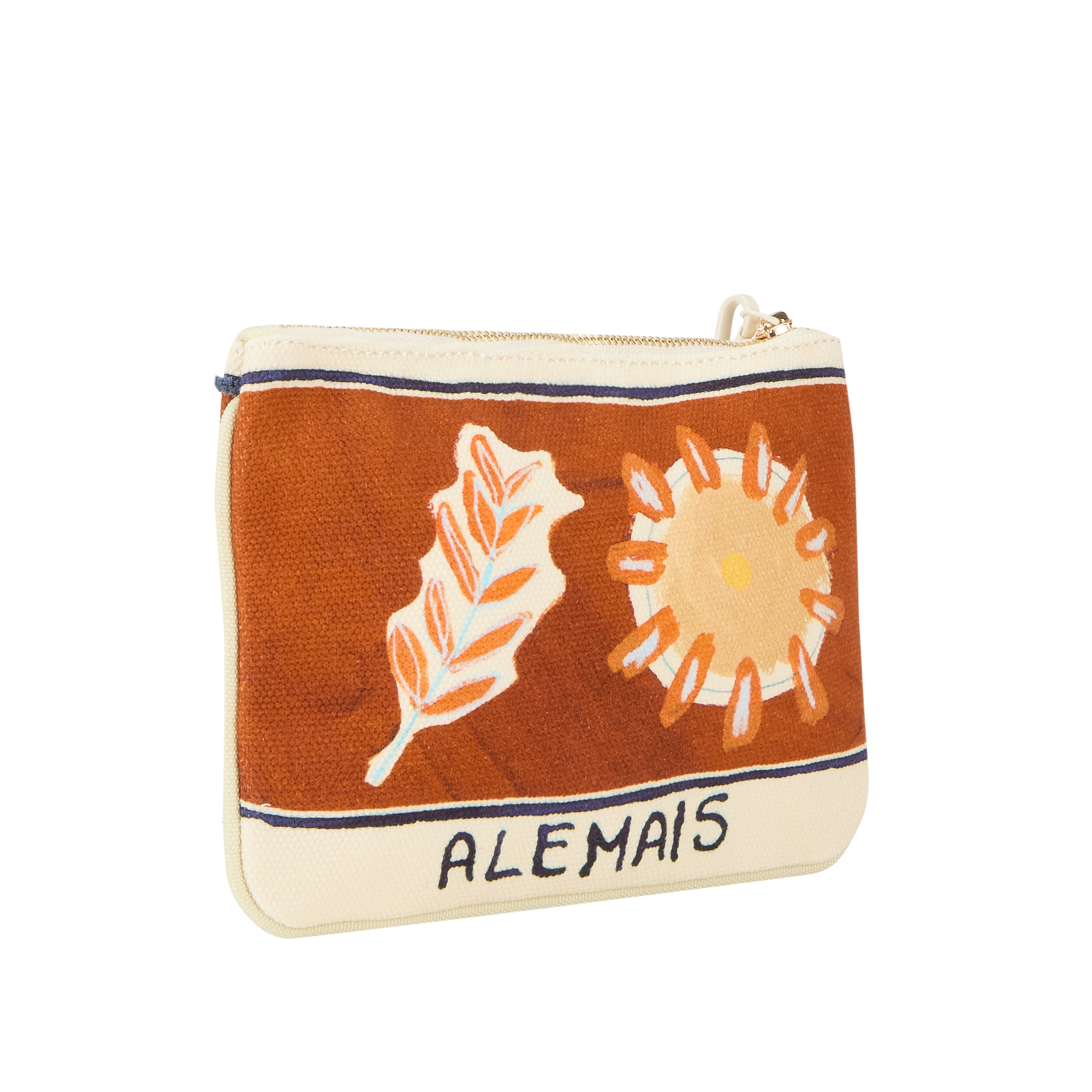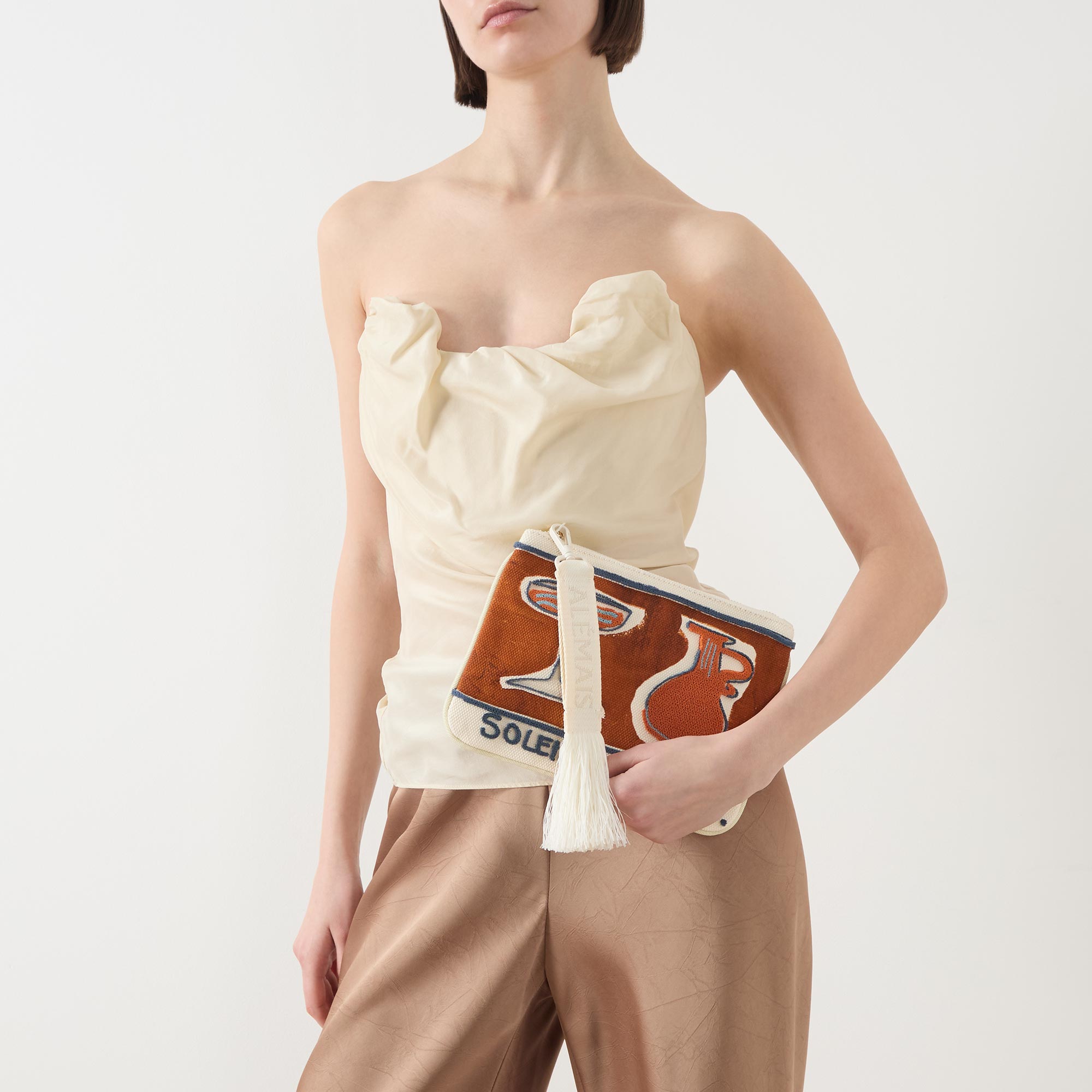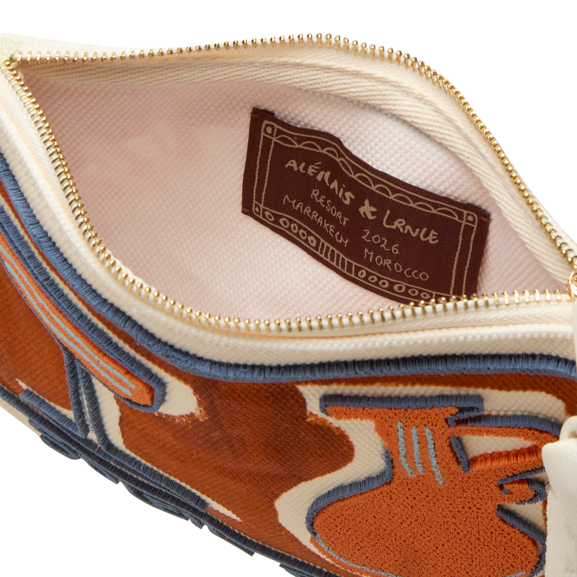 - Top zip-fastening closure, artwork in collaboration with Laurence Leenaert, branded woven jacquard webbing wristlet with tassel end which can be removed