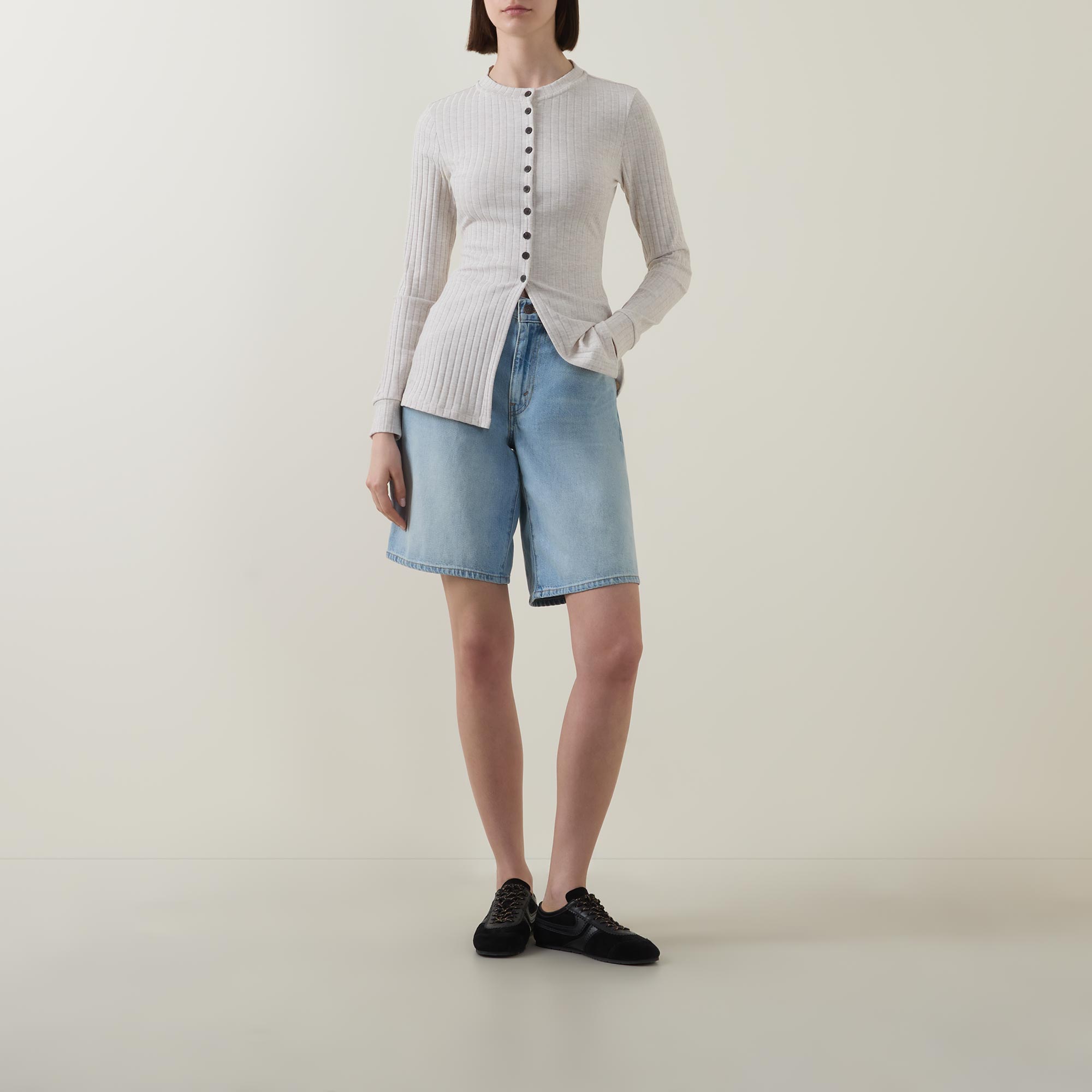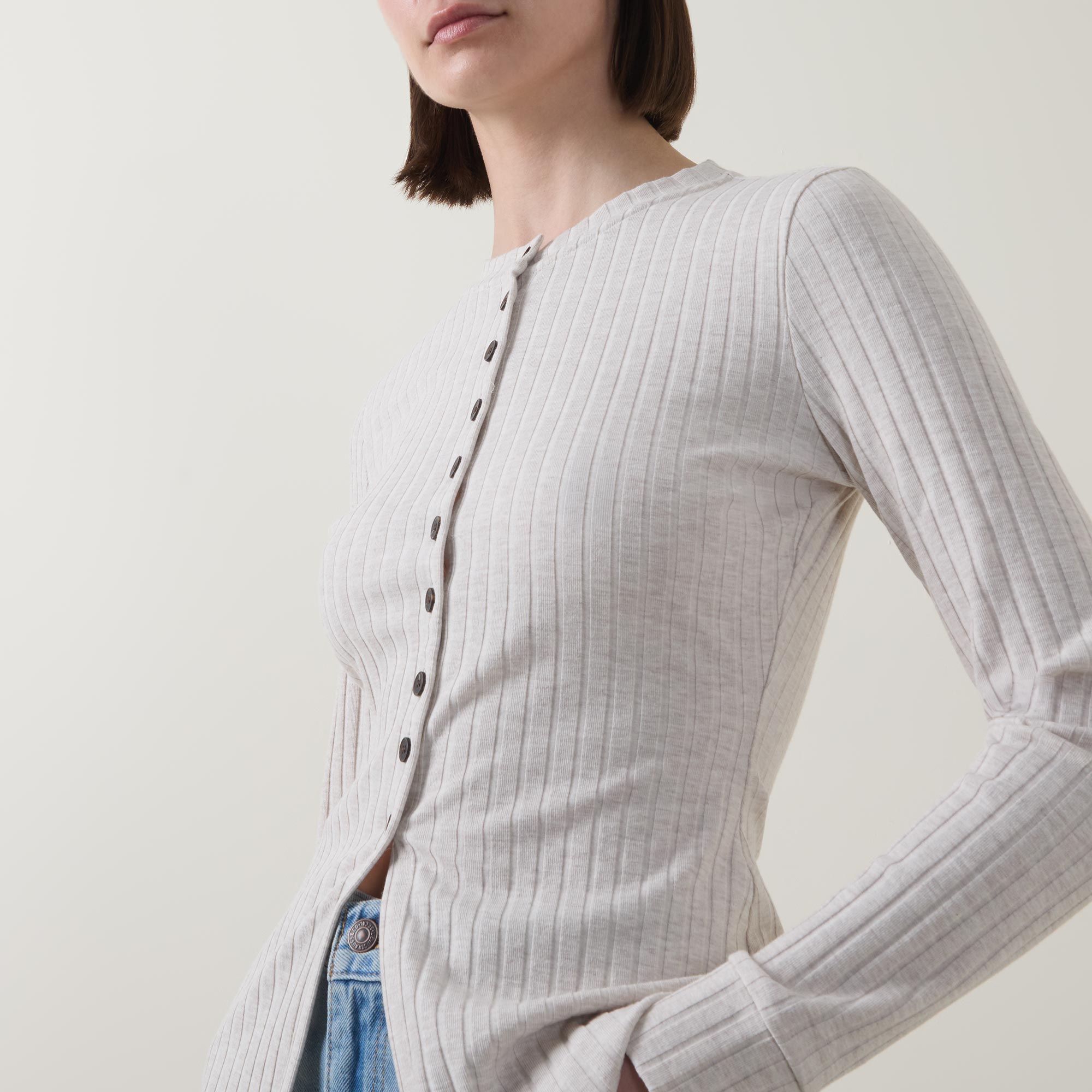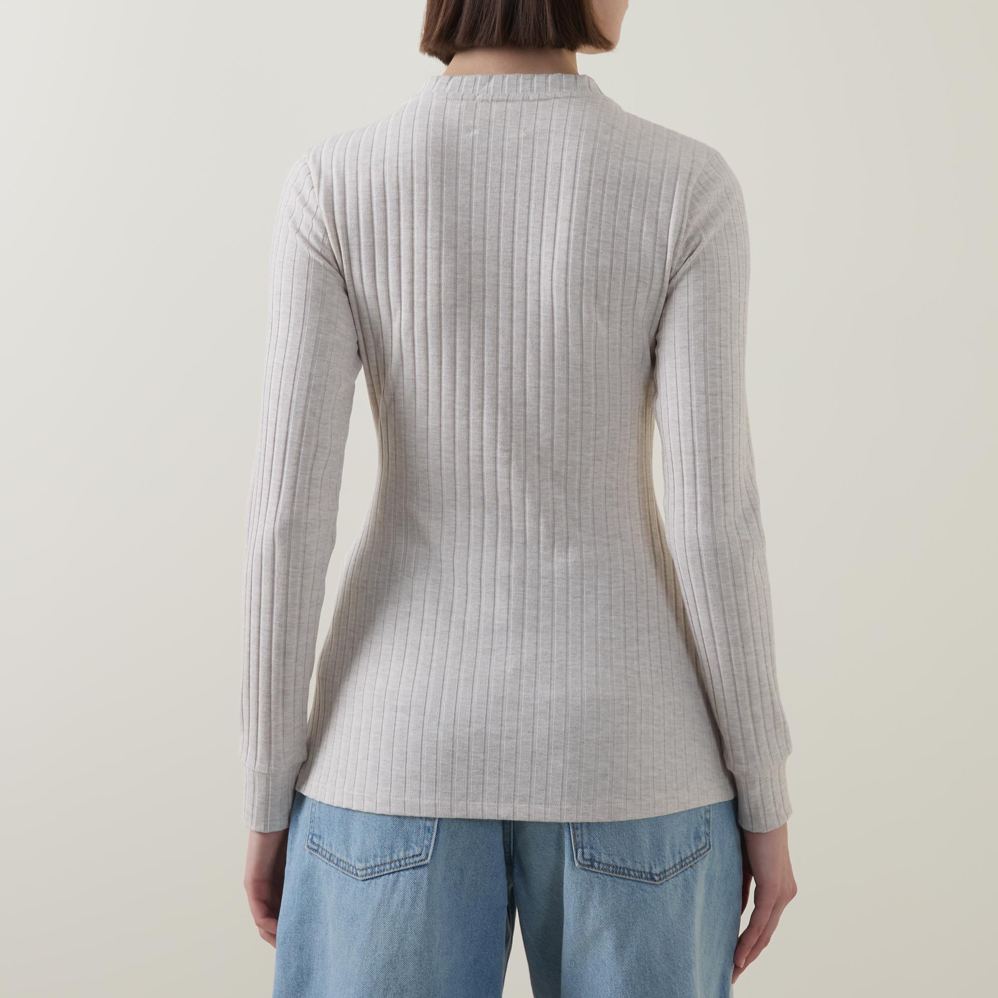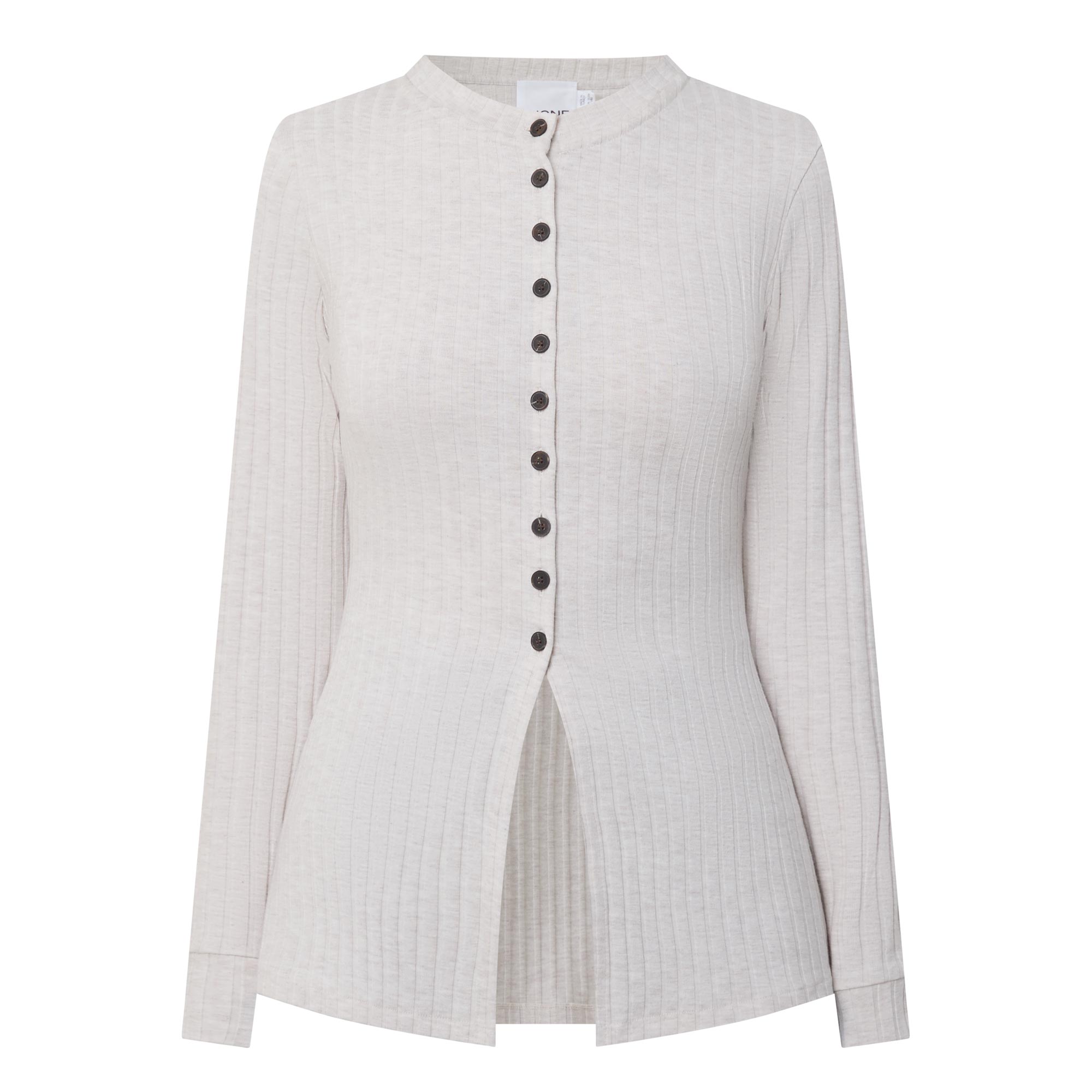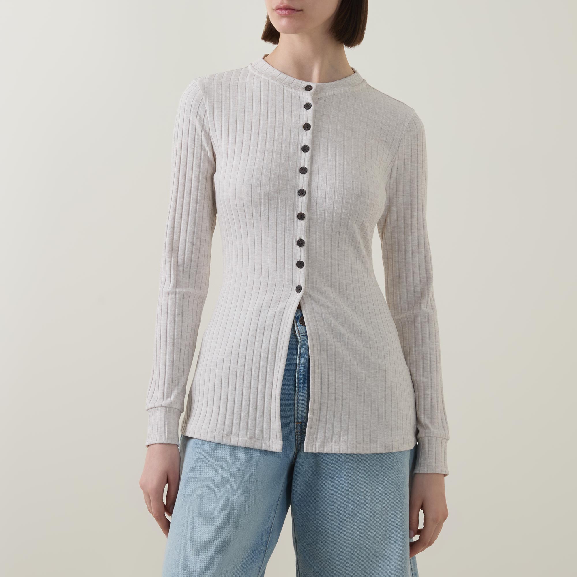 - Round neck, long sleeves, ribbed knit, split waist, button fastenings