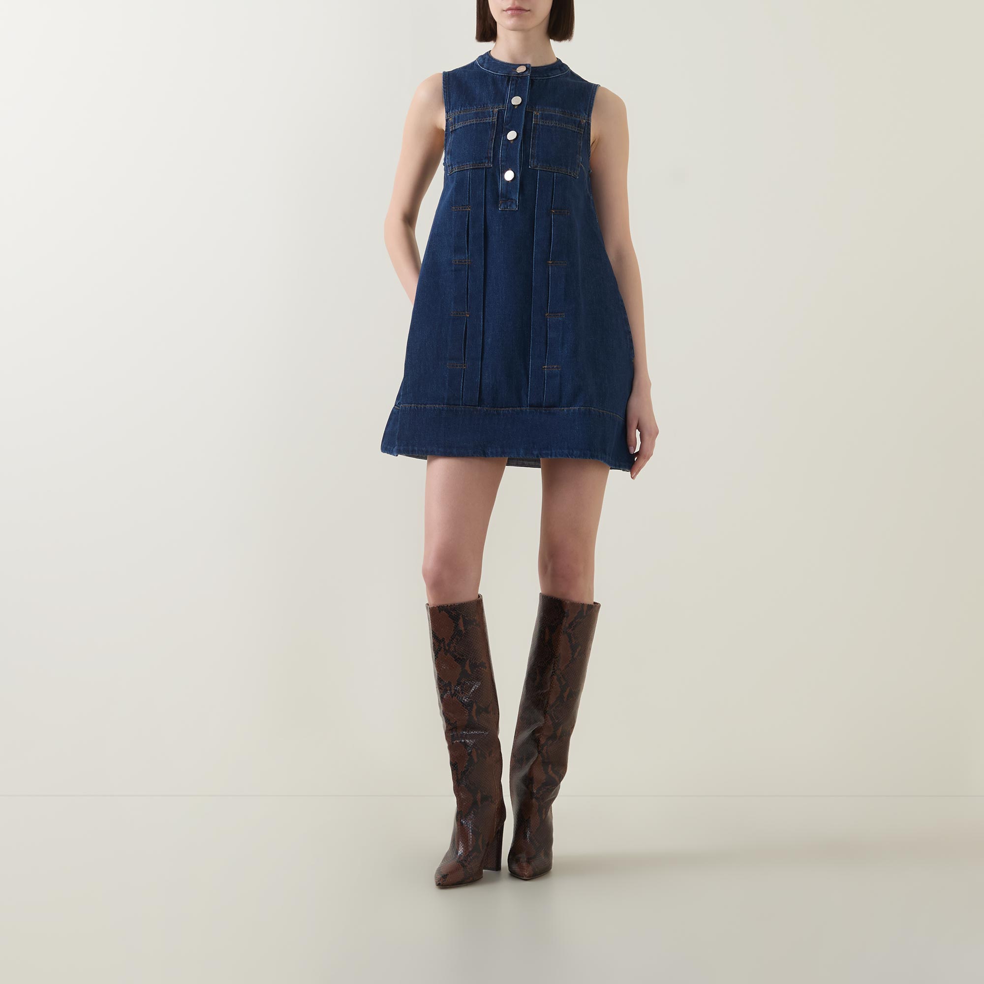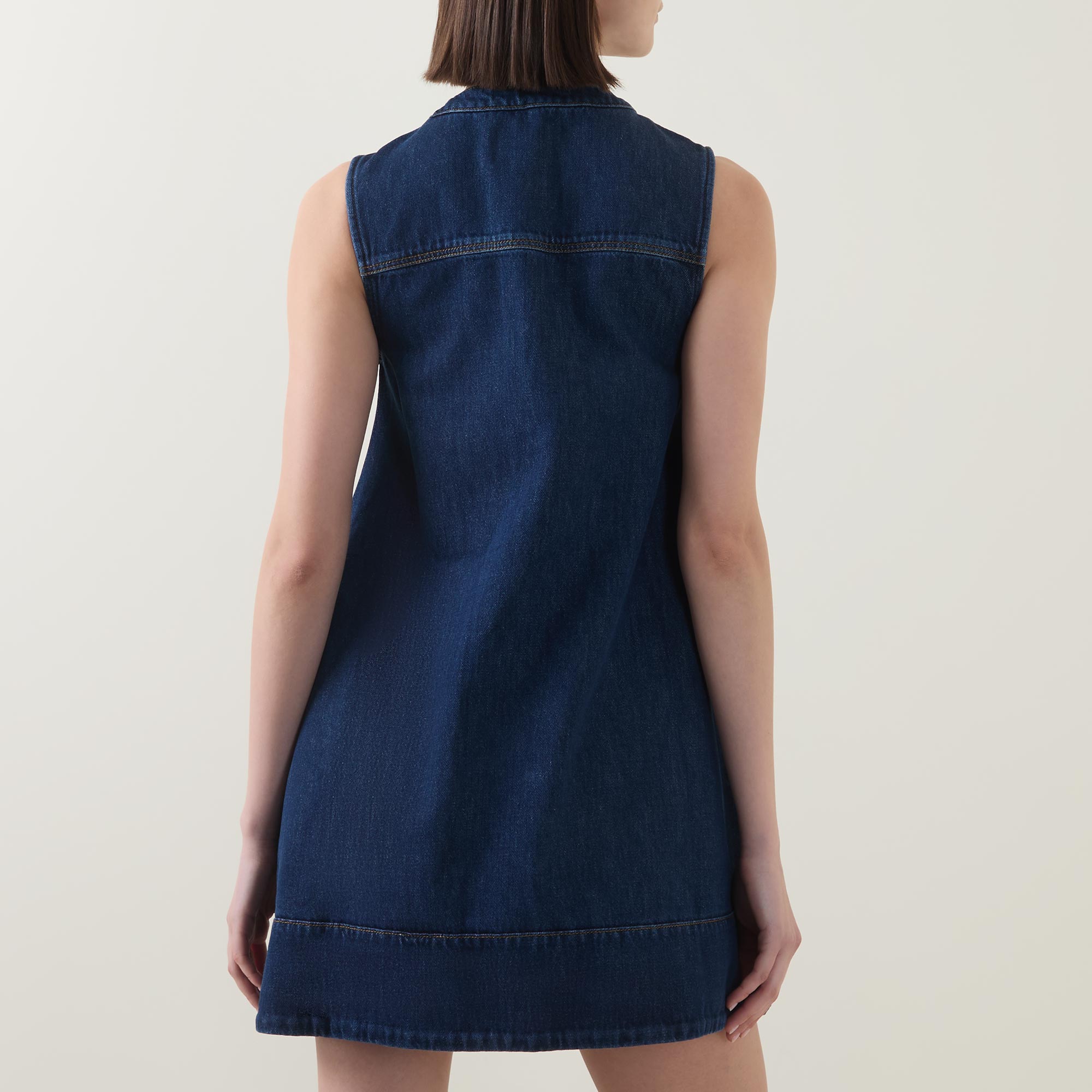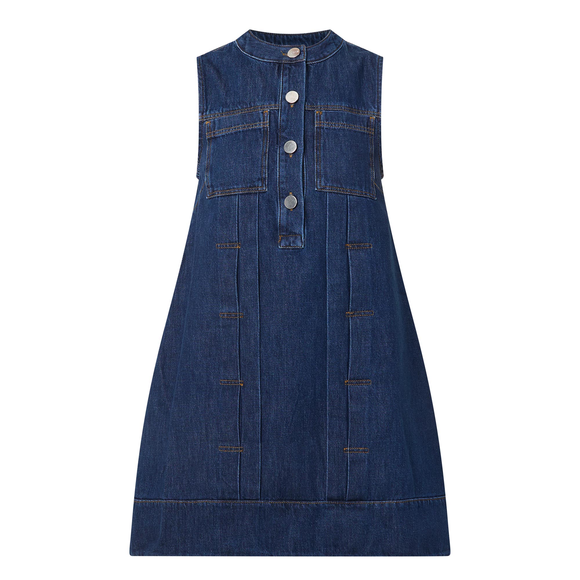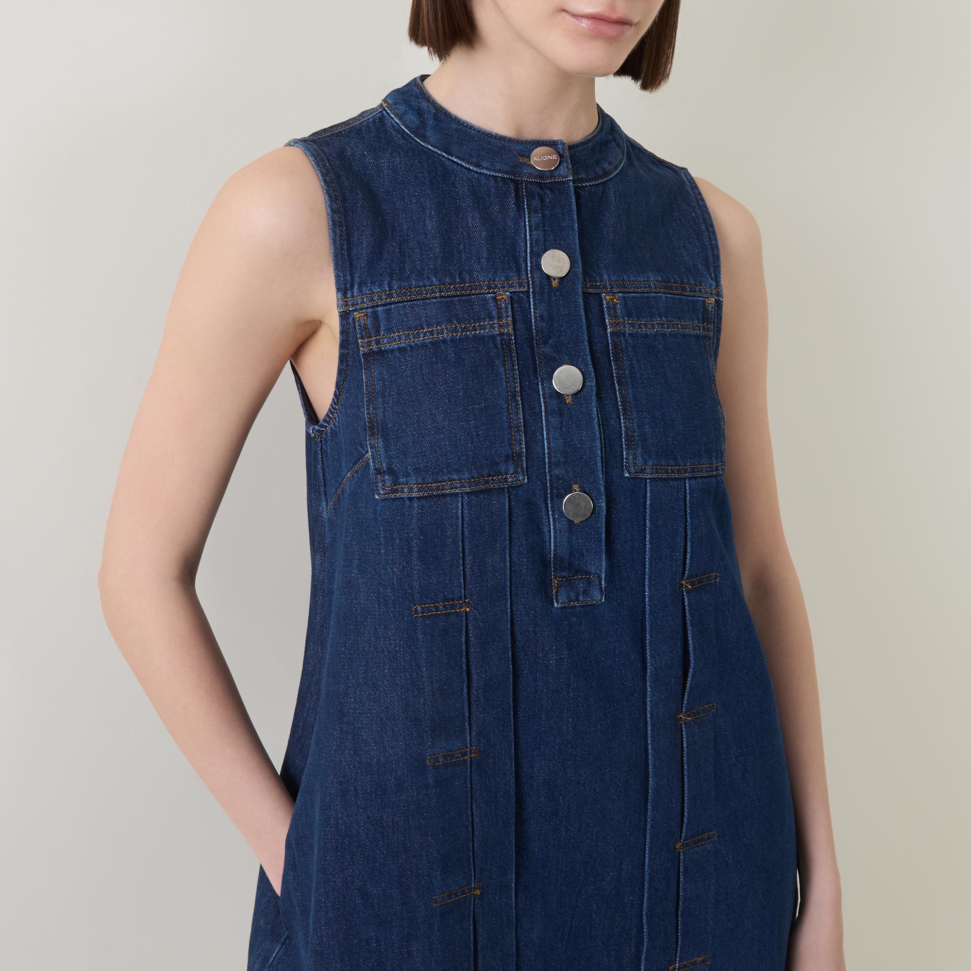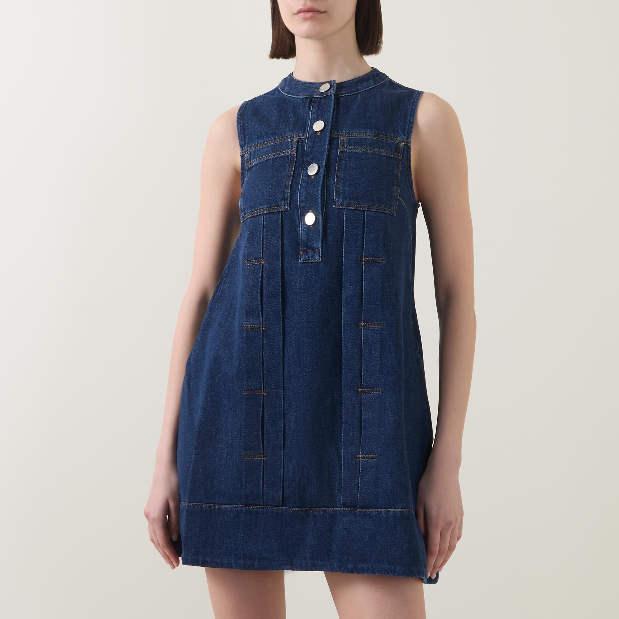 - Round neck, sleeveless, chest pockets, mini length, button fastenings