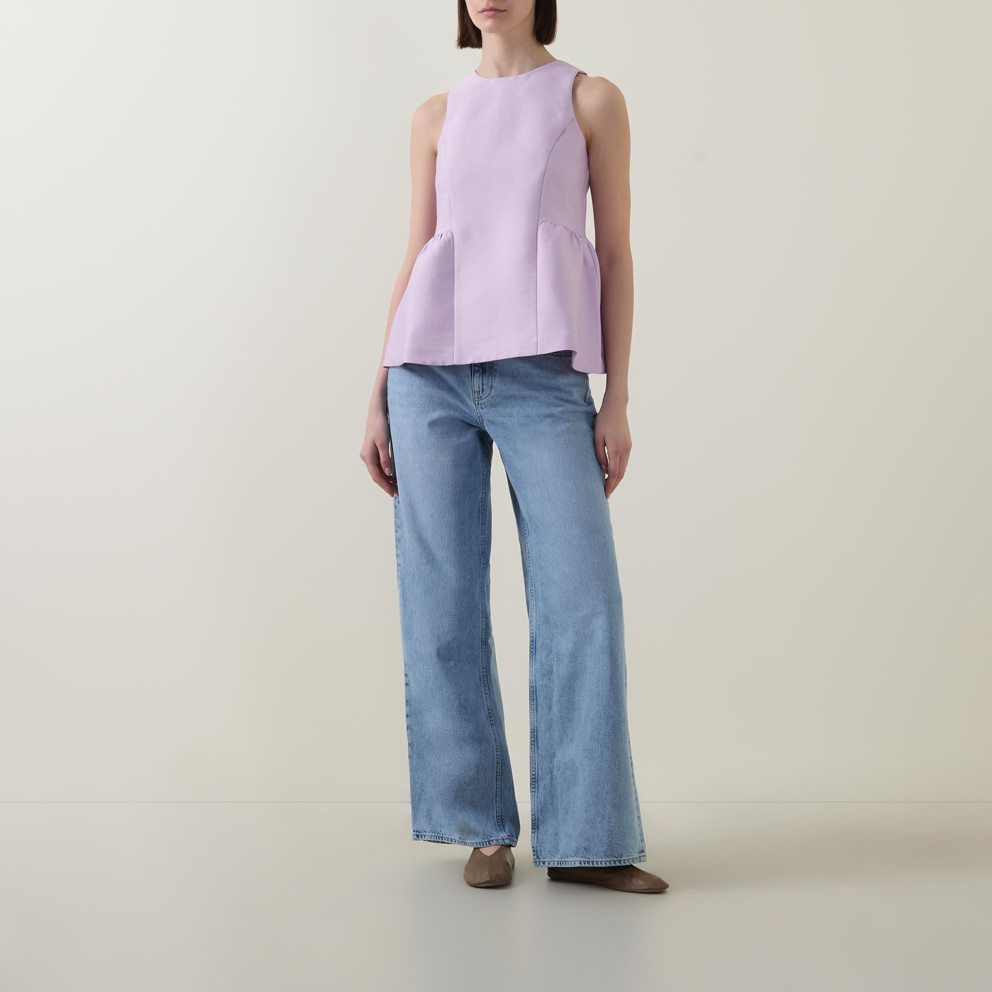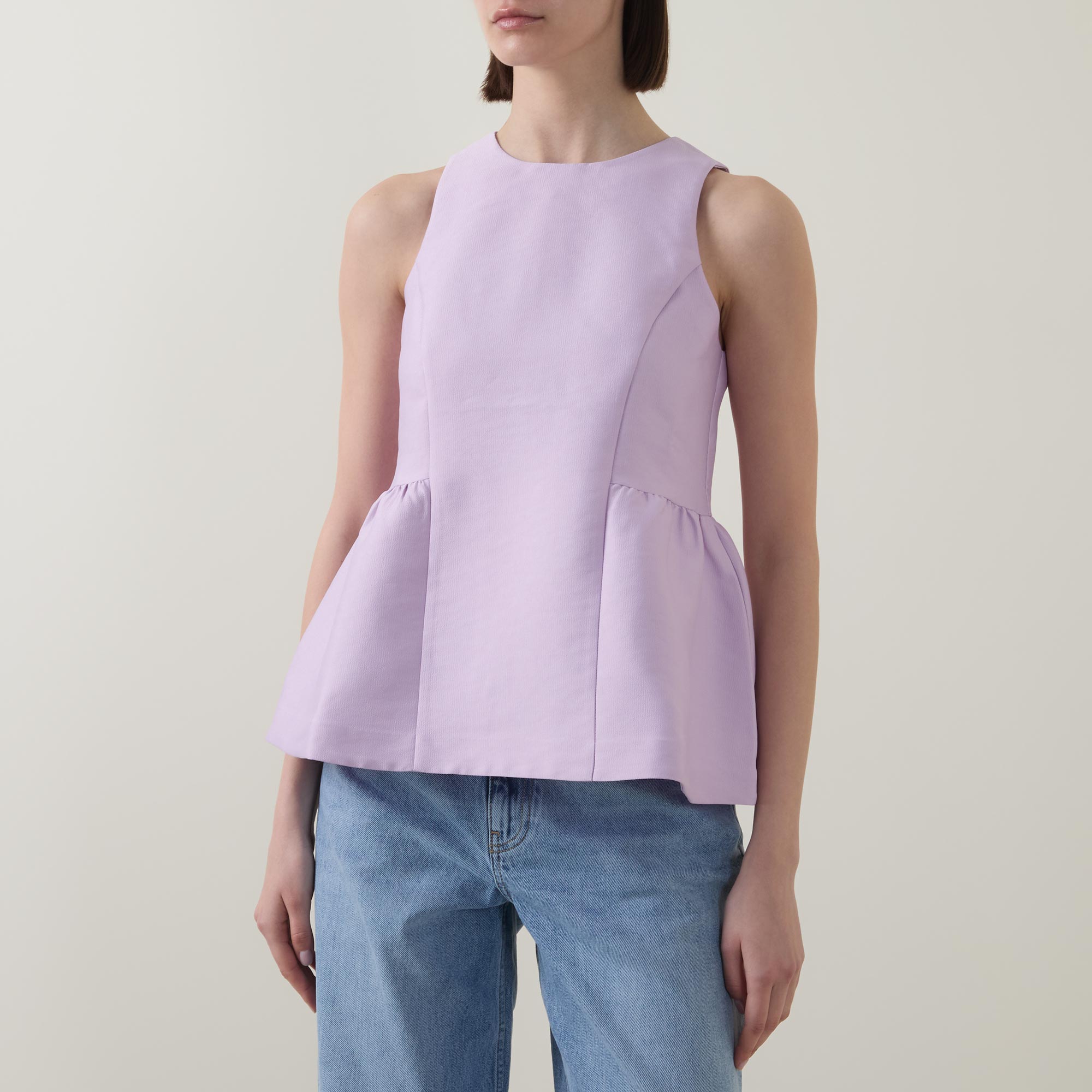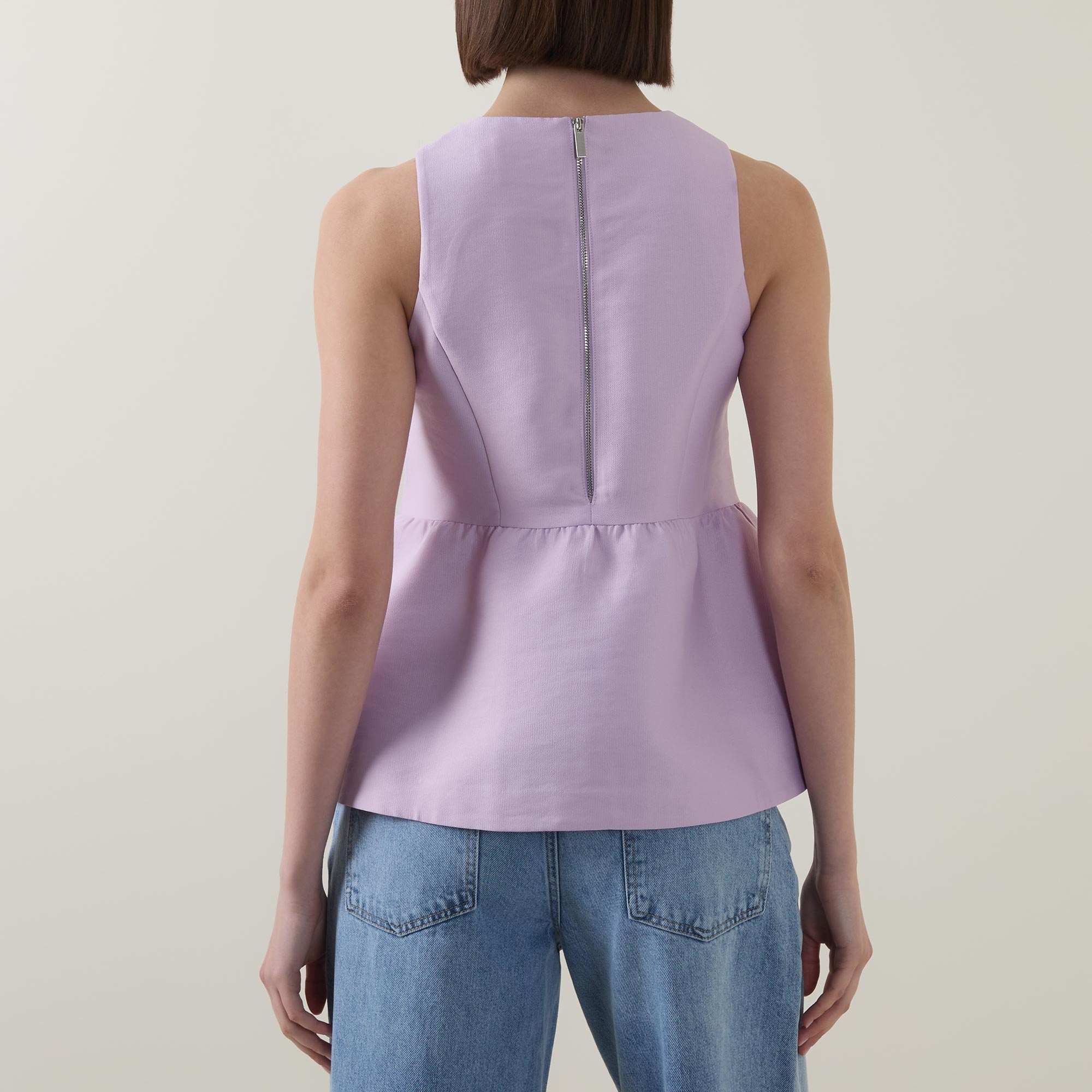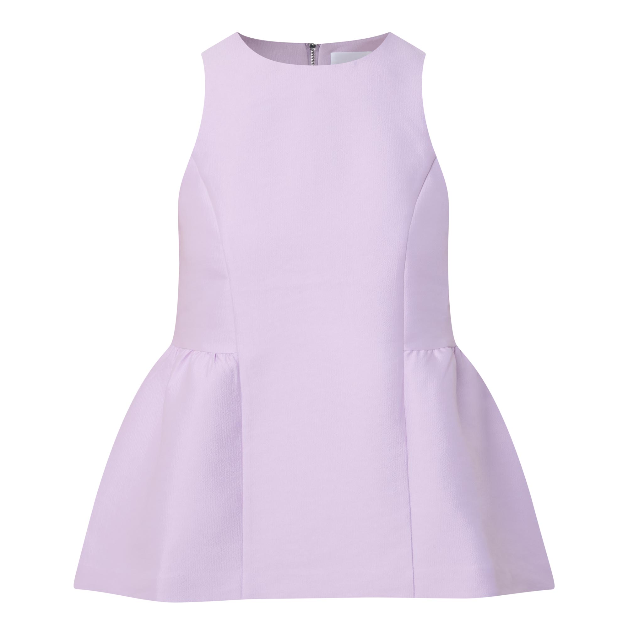 - Peplum hem, sleeveless, round neck, back zipper