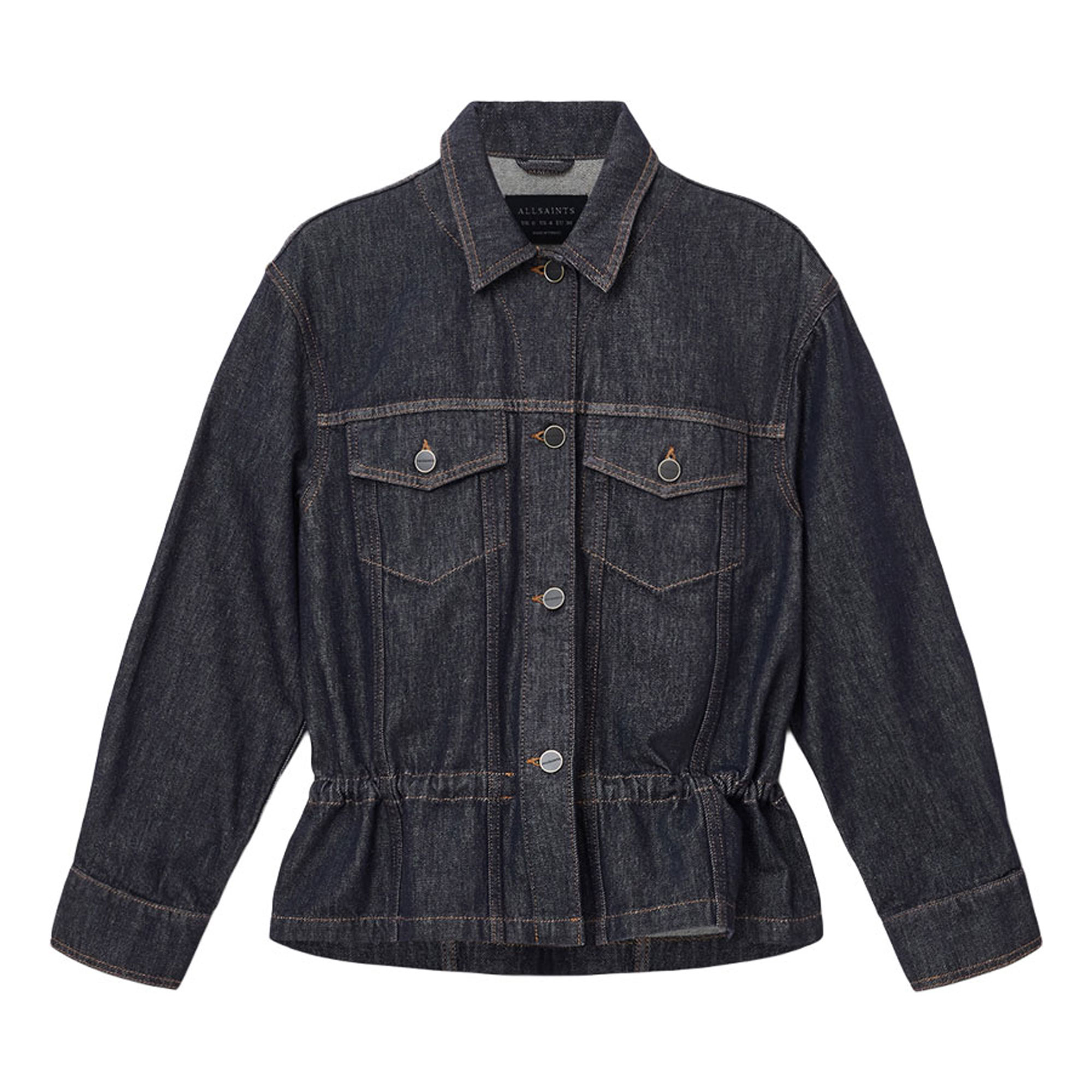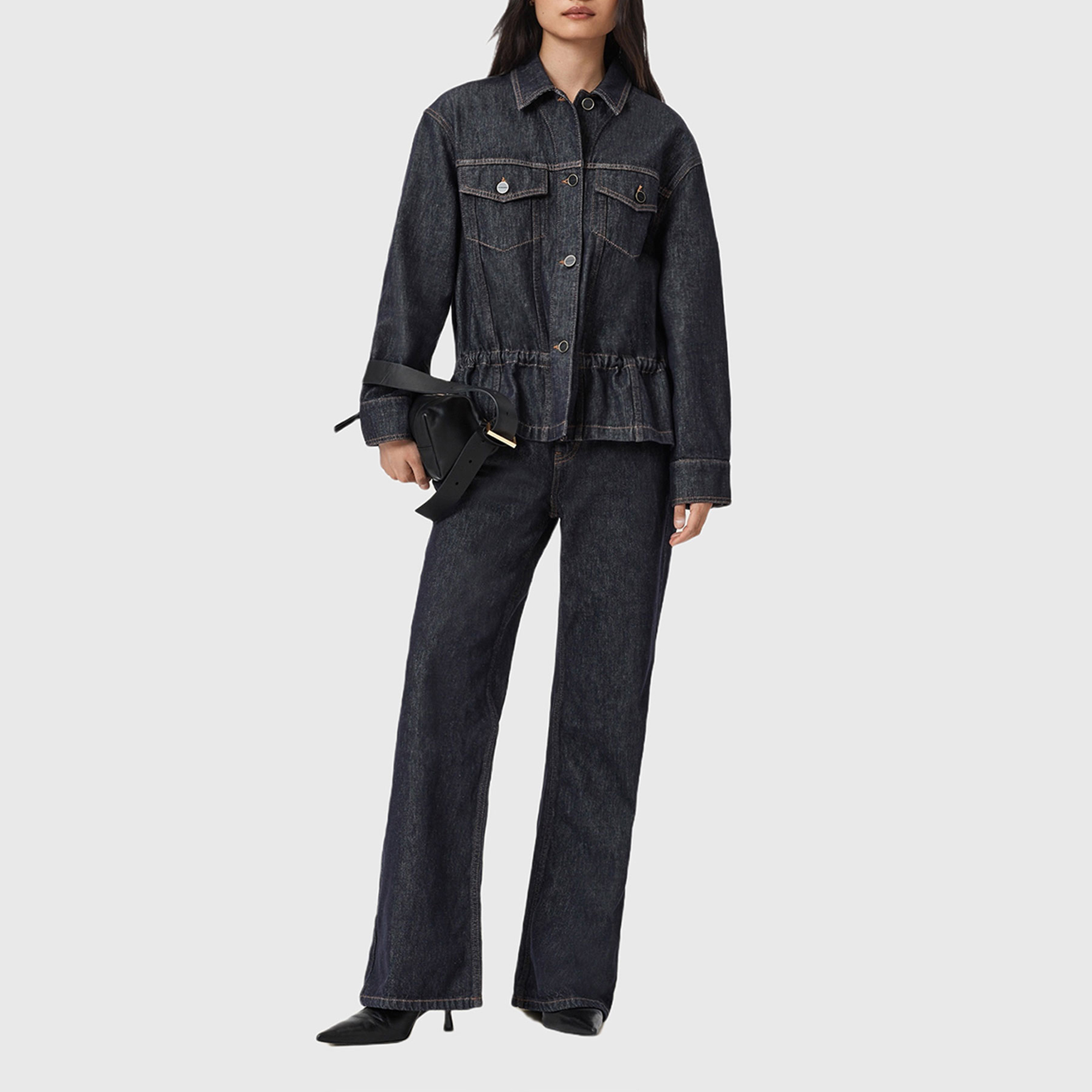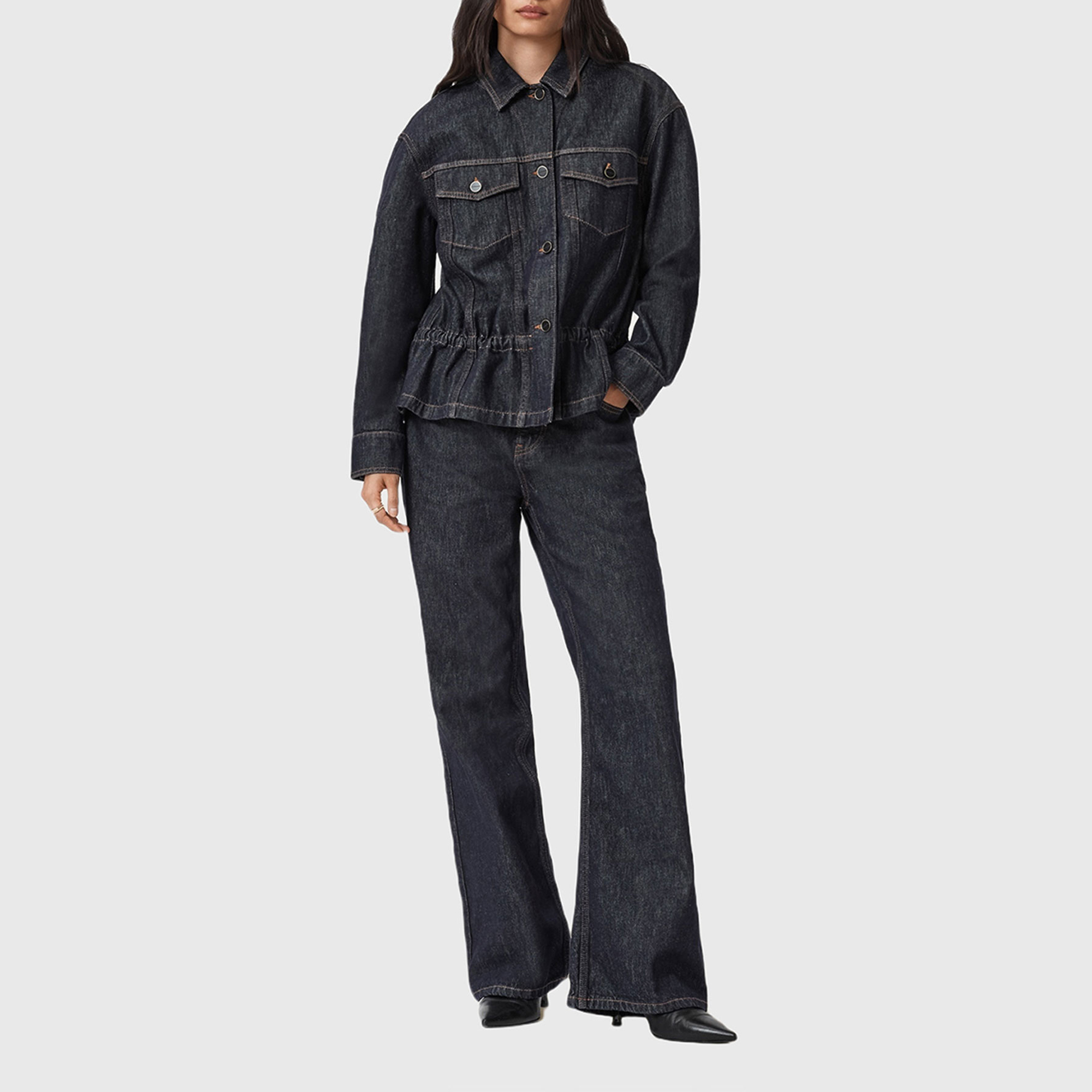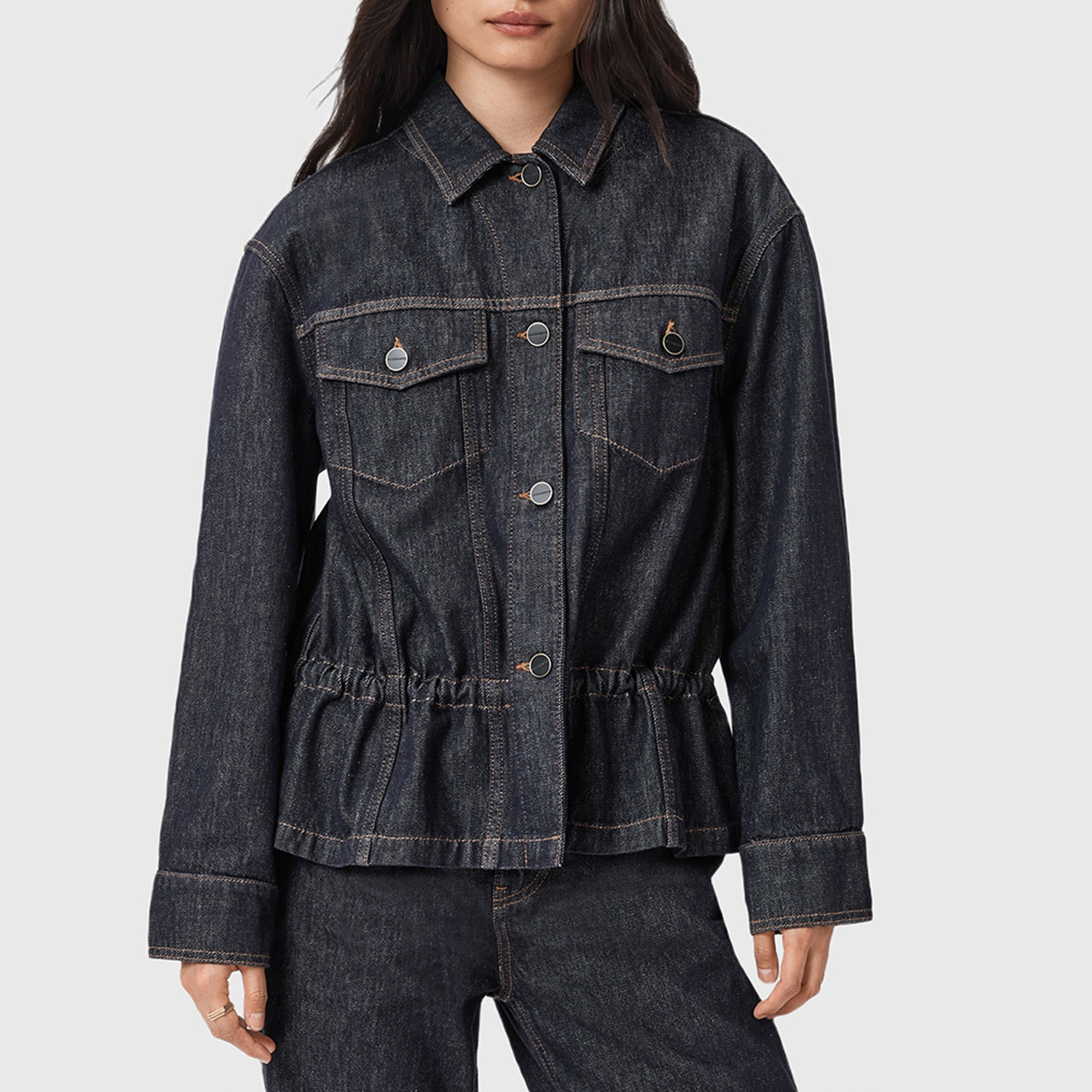 - Point collar, dropped shoulders, long sleeves, buttoned cuffs, front button placket, two chest flap pockets, with button fastenings, adjustable internal drawcord waist for peplum shape, denim trucker silhouette, raw rinse wash