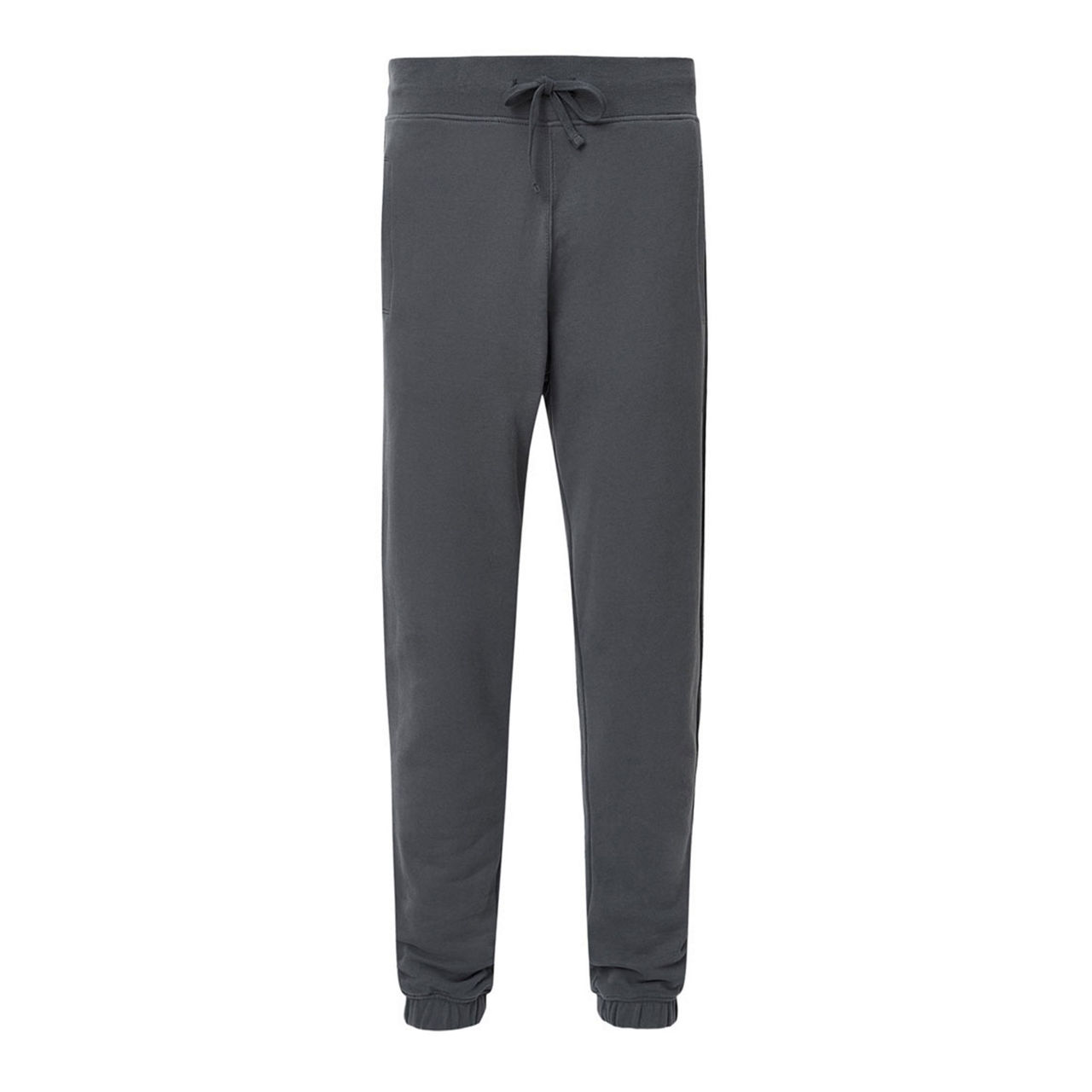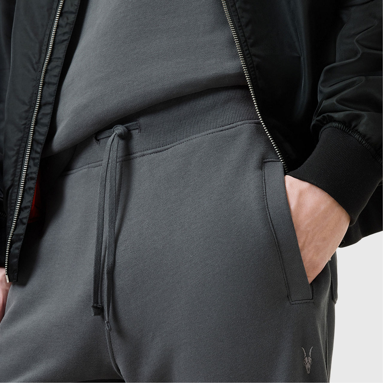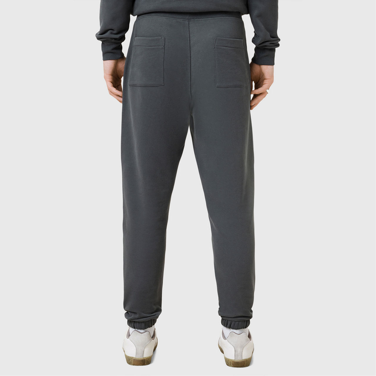 - Rib waistband with sewn eyelets and cotton drawcords, two front welt pockets, two square back pockets with single needle edgestitch and twin needle stitch to fold over, self-fabric elasticated cuffs, signature Ramskull embroidery on left side leg