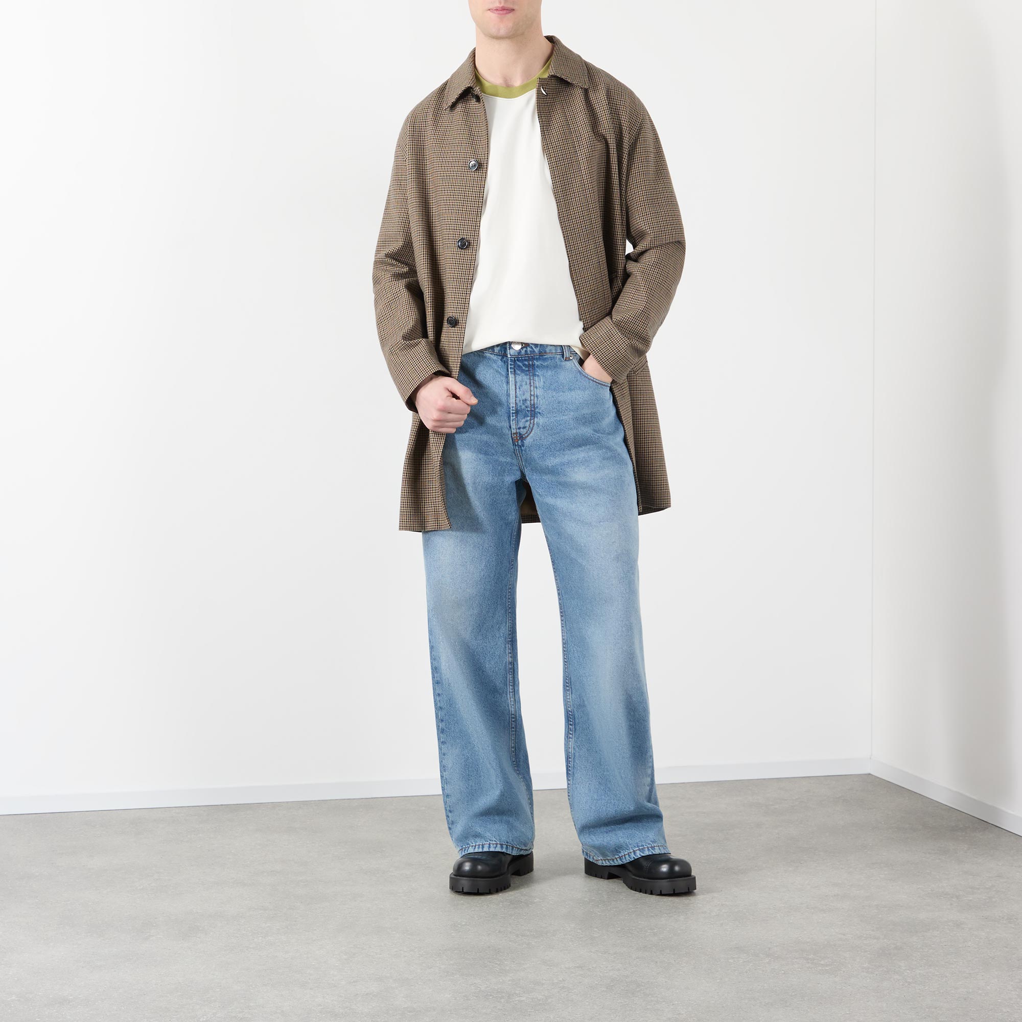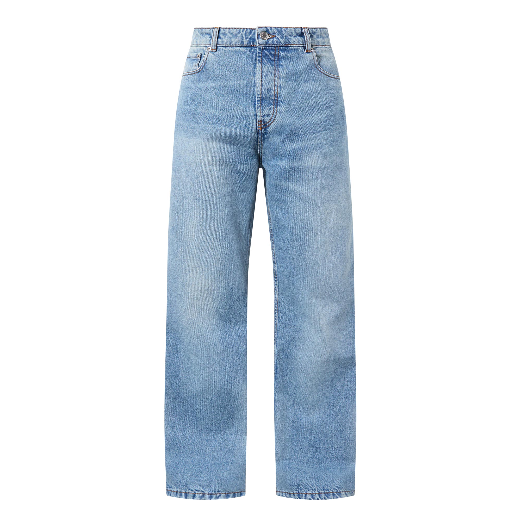 • Button and fly zip fastening, belt loops, five-pocket style, whiskering and faded details, logo badge, intentional large-cut straight legs, tobacco stitching