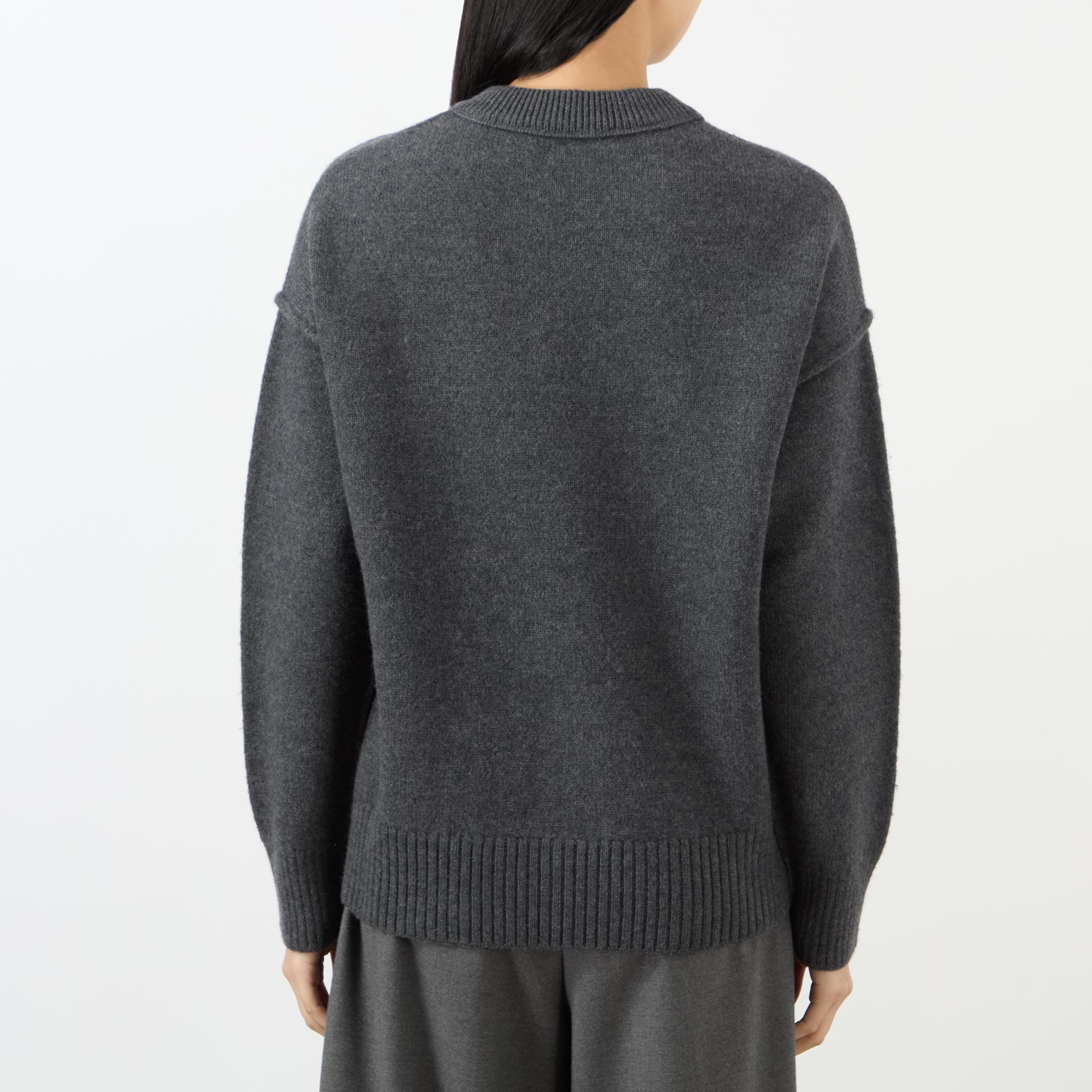- Exposed shoulder seams, long sleeves, heart logo, ribbed trims, crew neckline