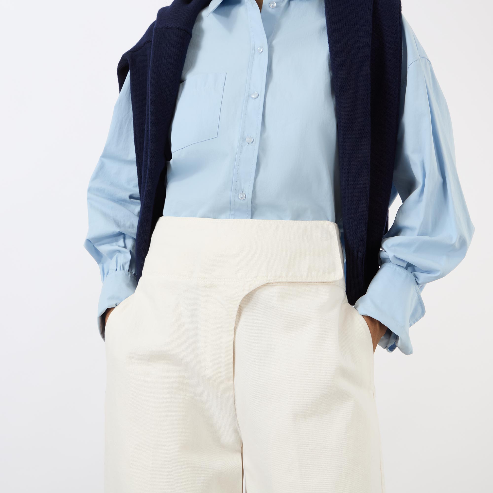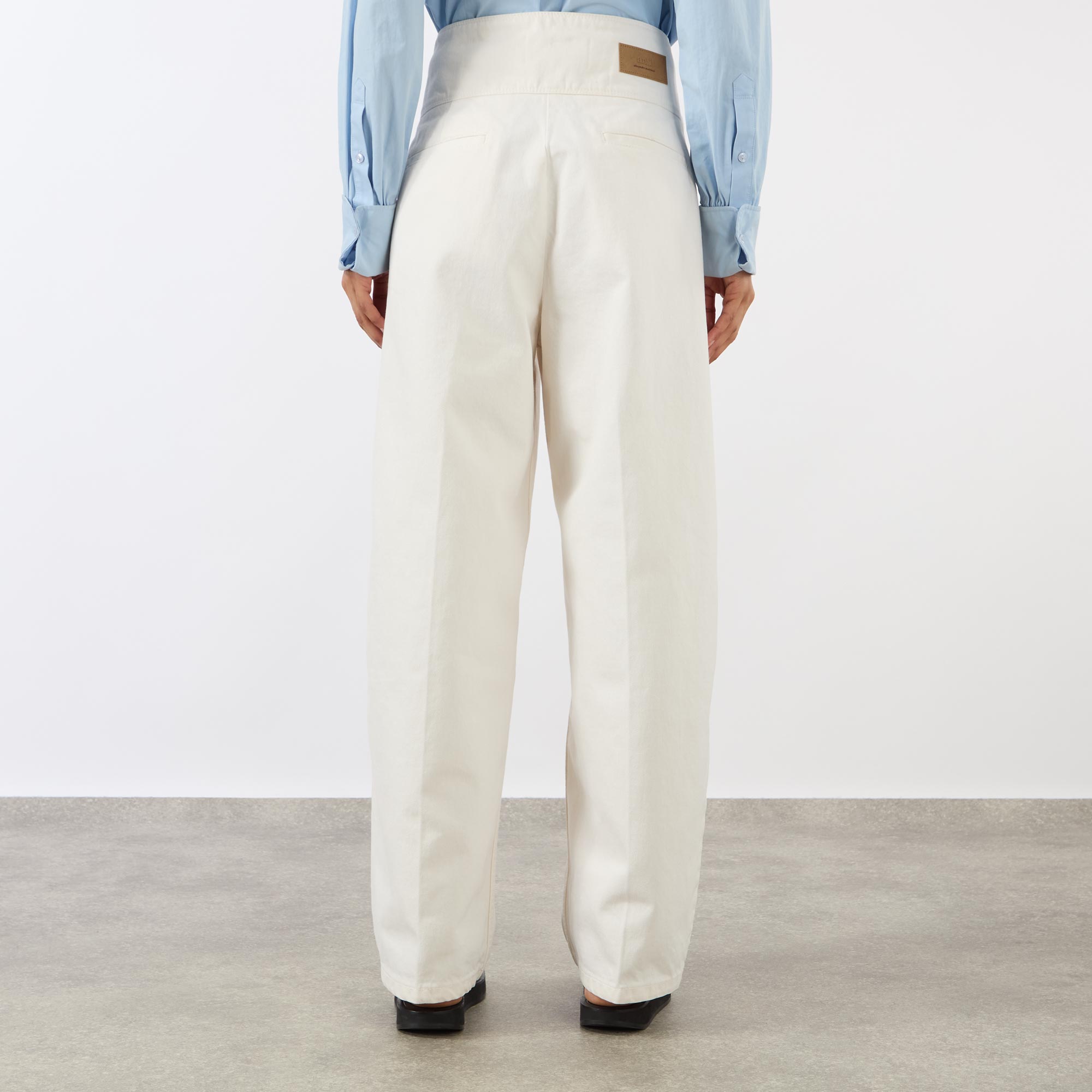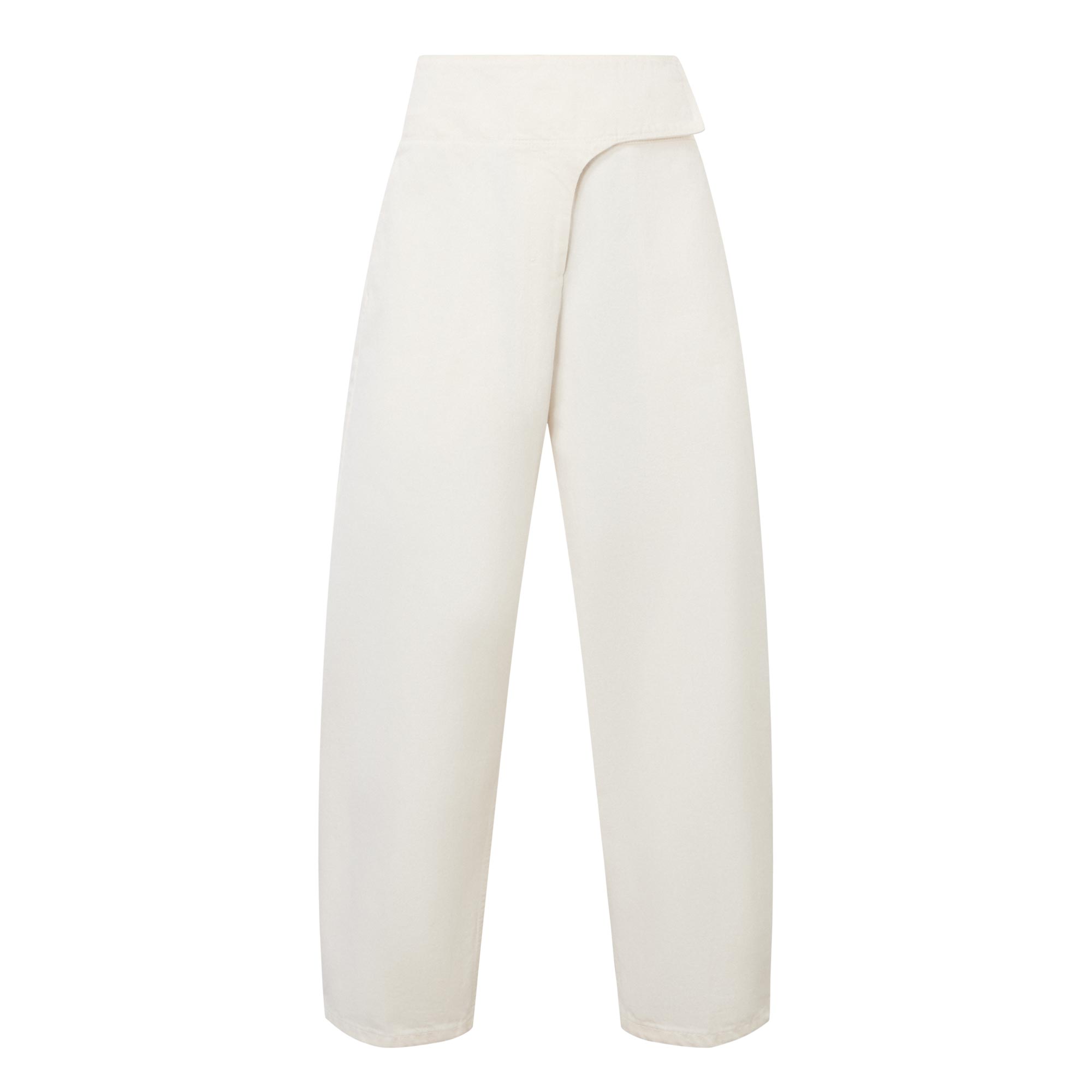 - Wrapped bely with hook and eye and button fastening, zip fly, large and slightly rounded legs, welt pockets, pressed crease, tonal topstitching, logo details