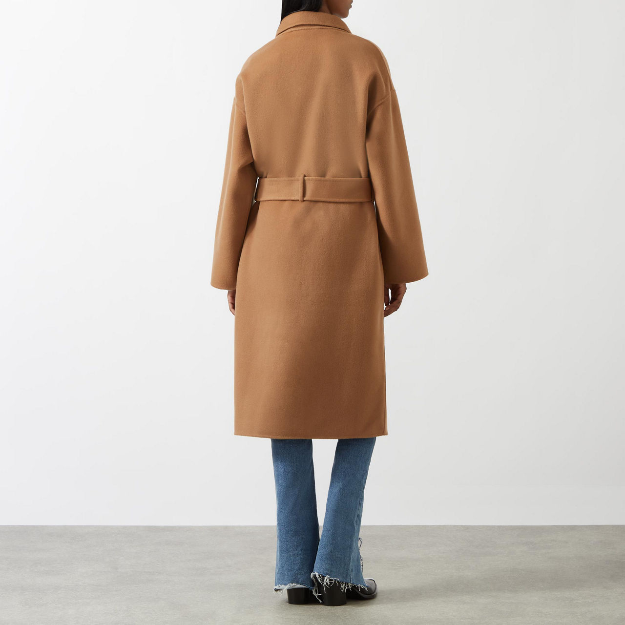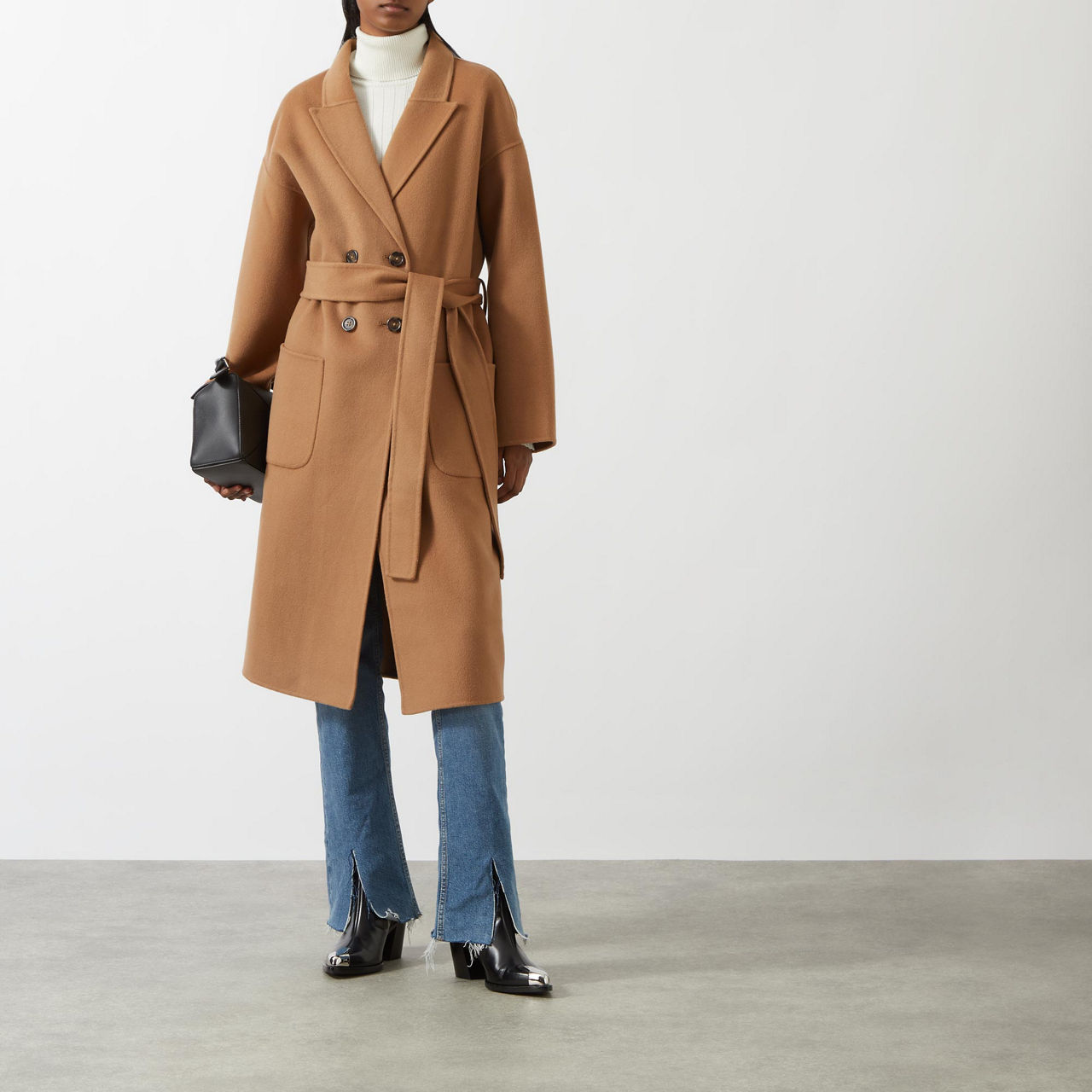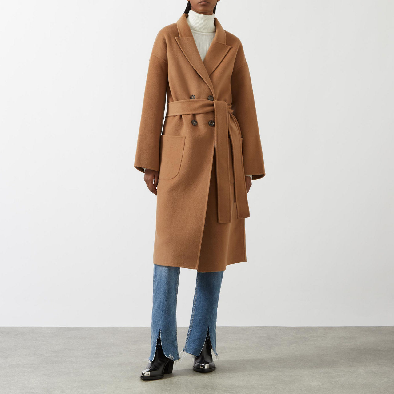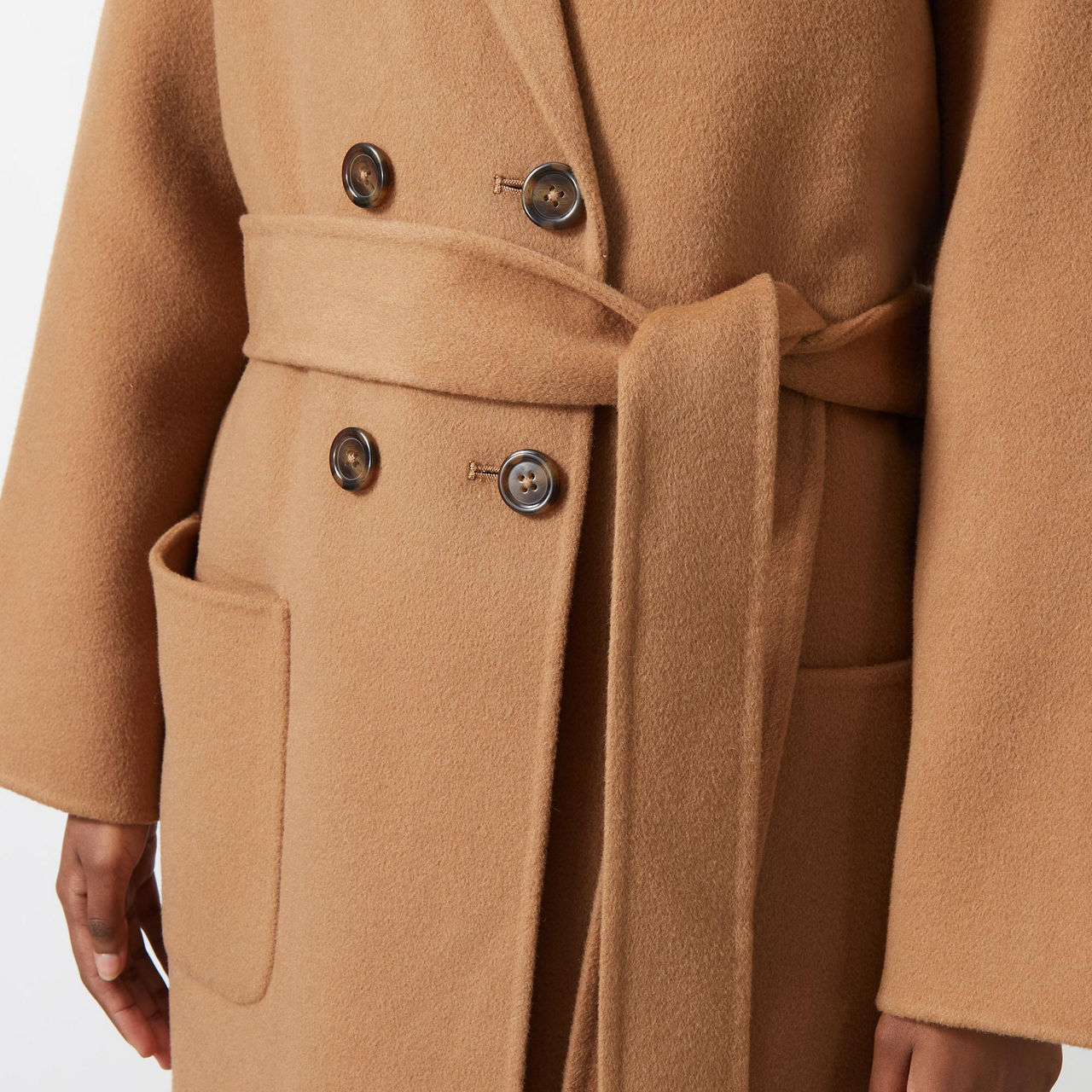 - Long sleeves, double-breasted silhouette, peak lapels, button fastening, two patch pockets, self-fabric belt, wrap style, smooth fabric