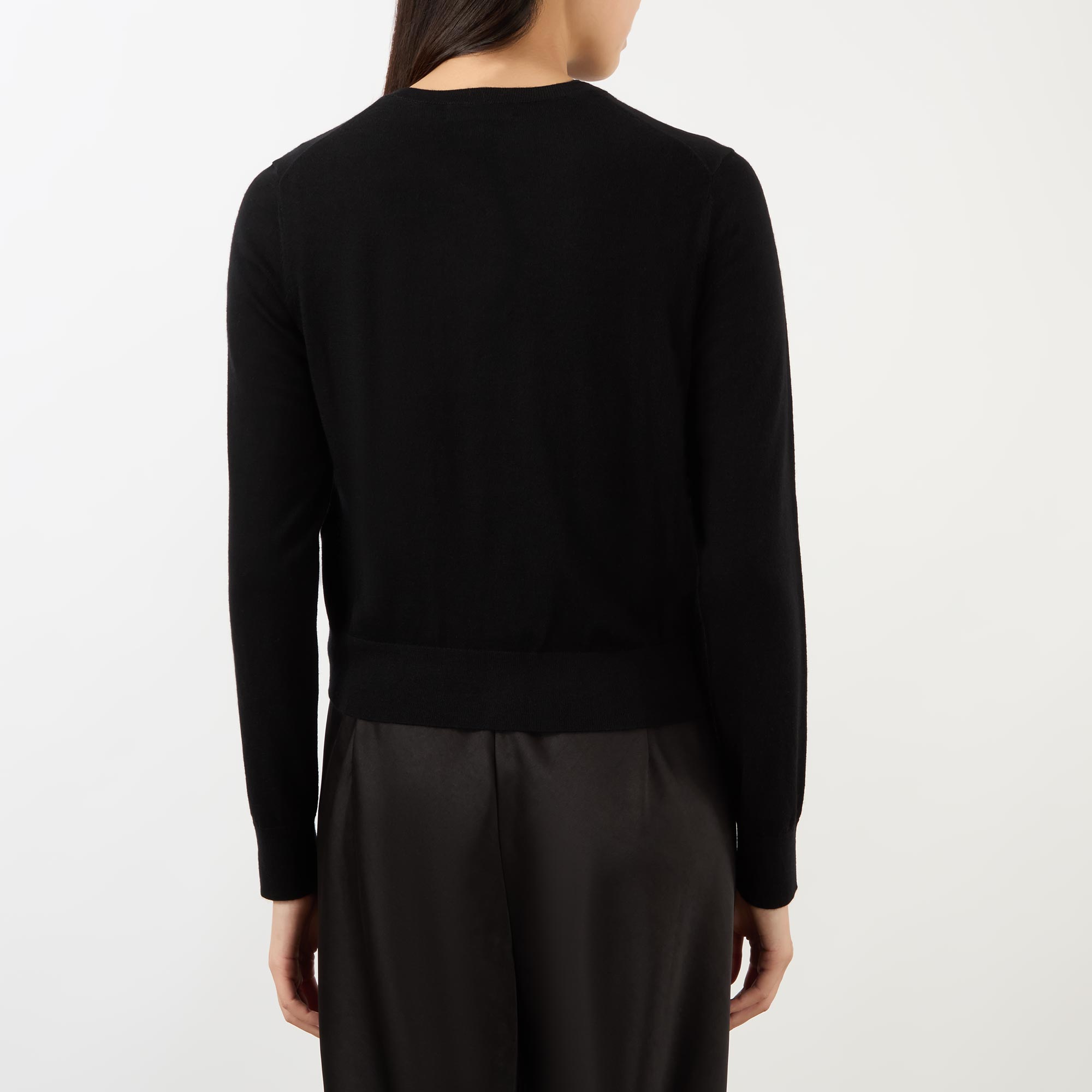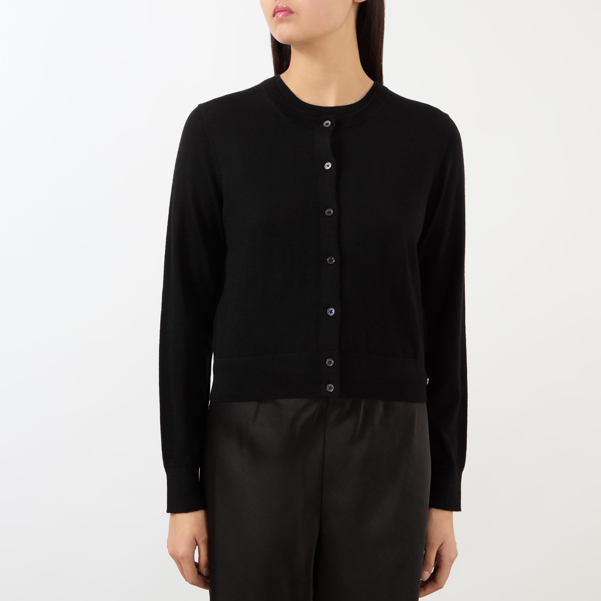 • Round neckline, long sleeves, button fastening, fine knit structure, ribbed trims, logo disc detail