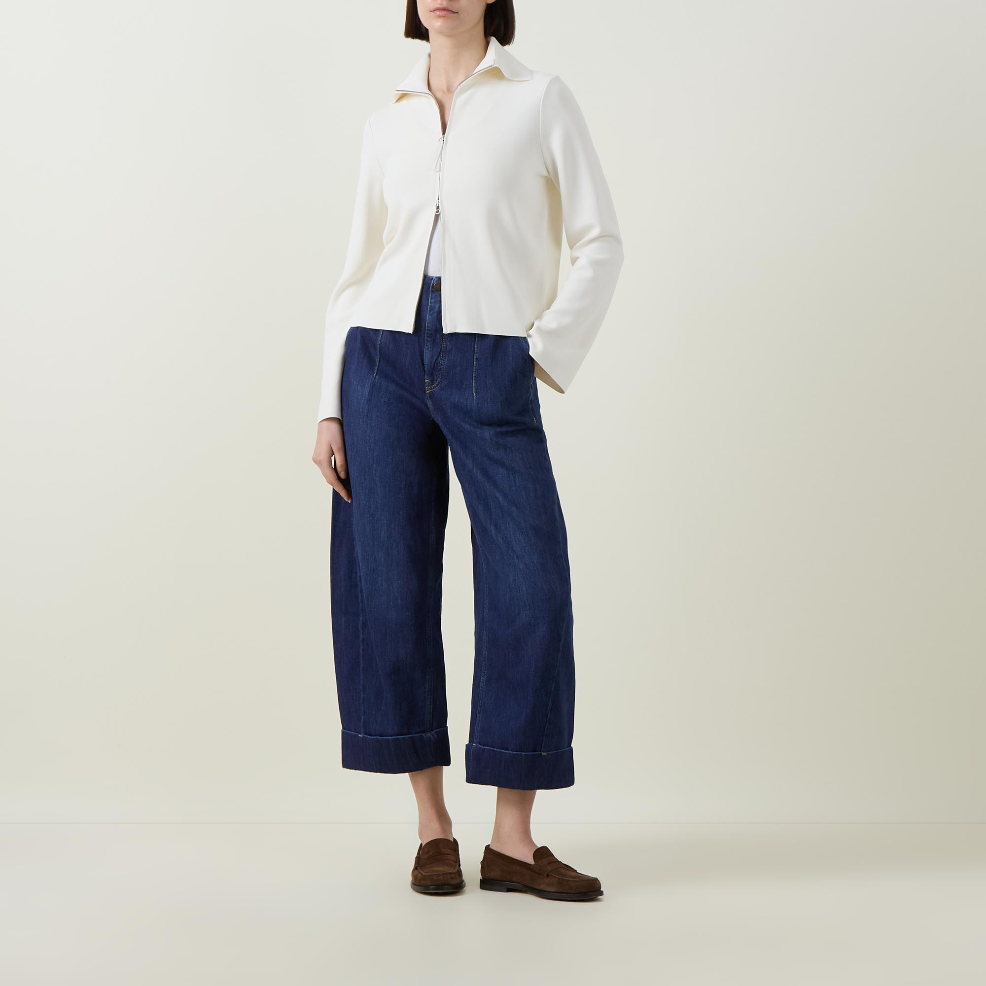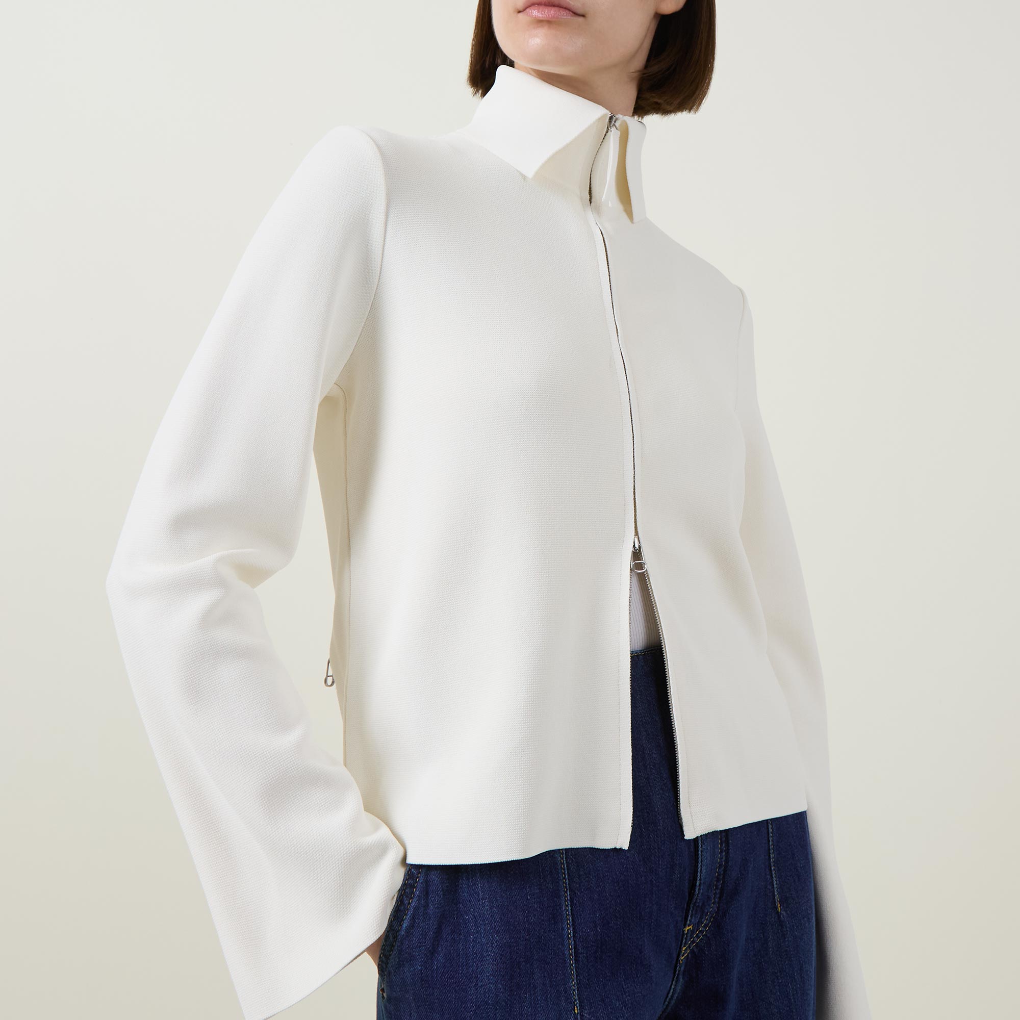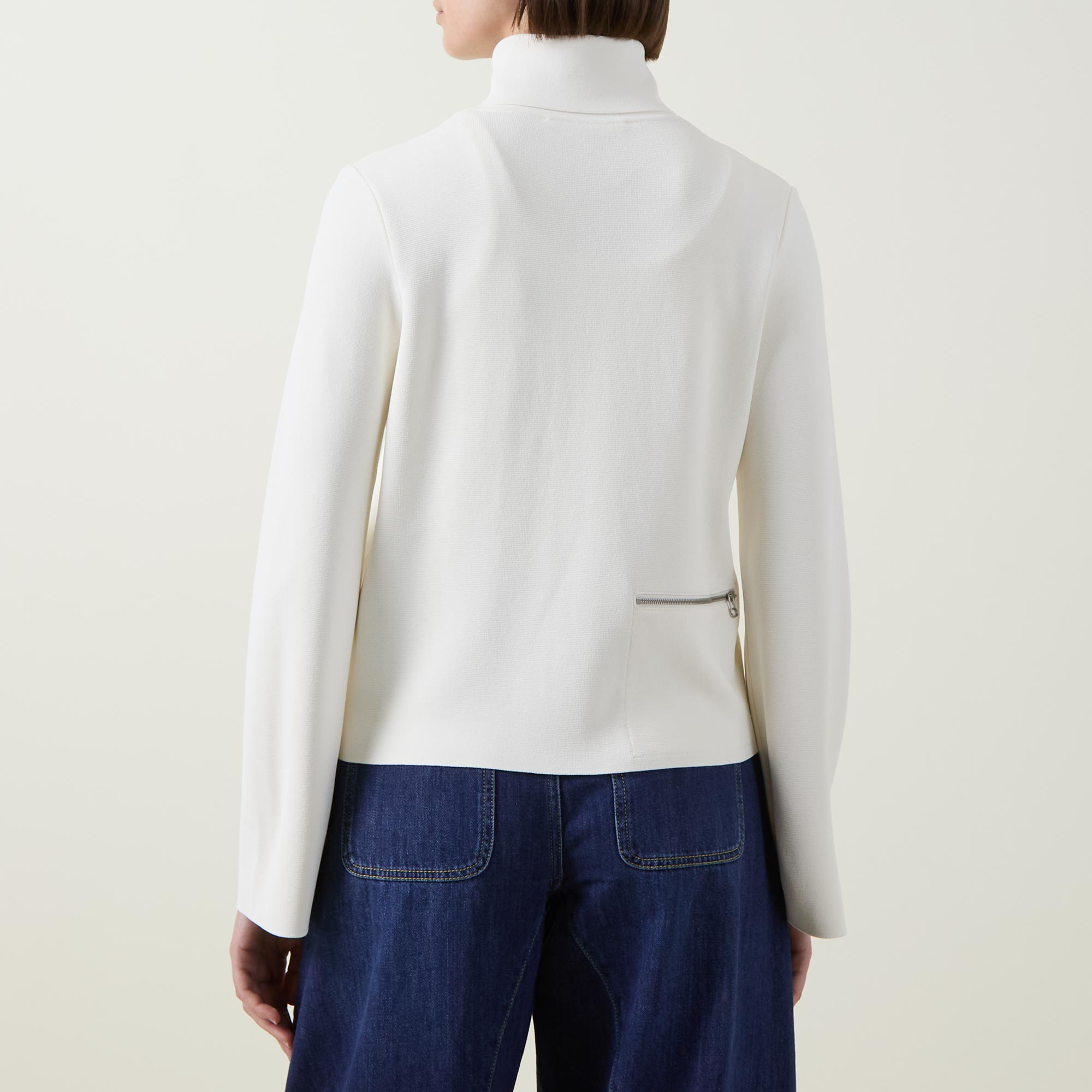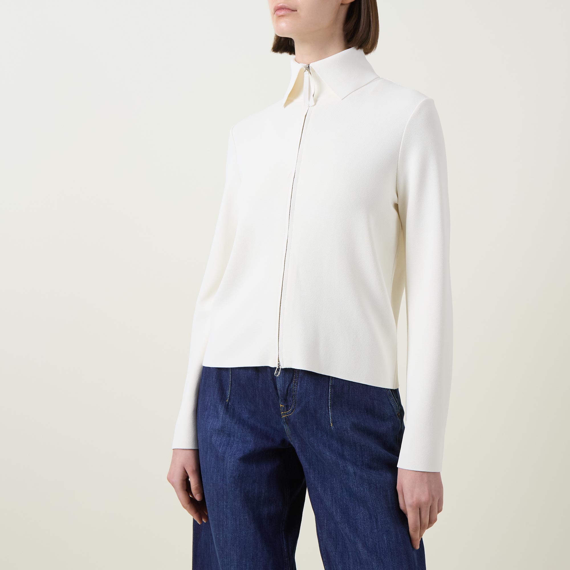 - Fold-down point collar, long sleeves, two-way front zip fastening, one rear pocket with zip fastening, straight hem, knit construction, silver-tone hardware